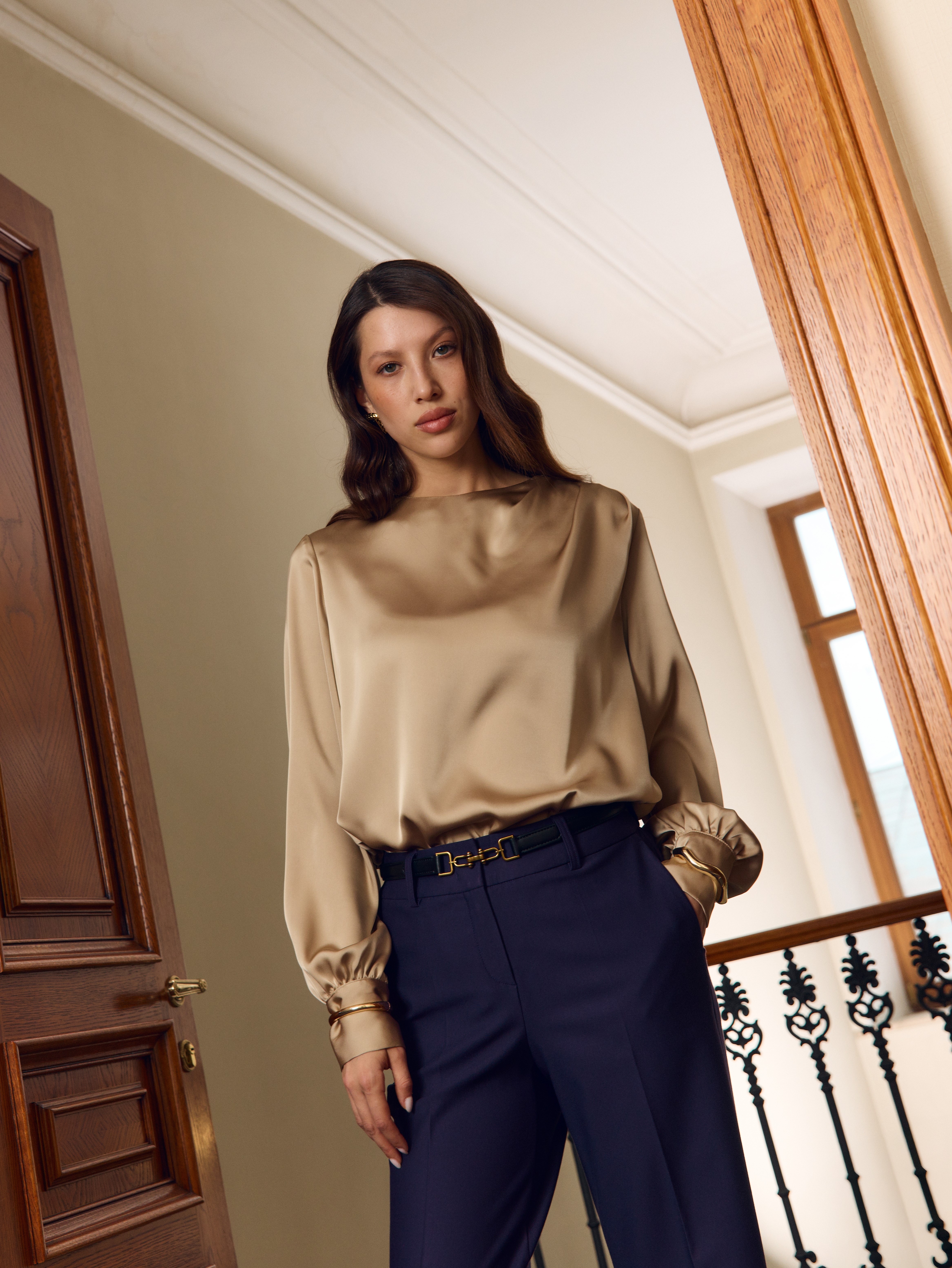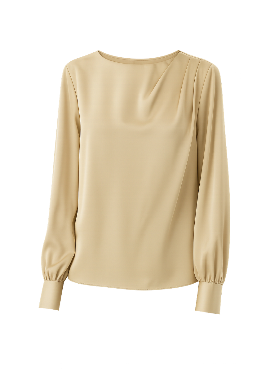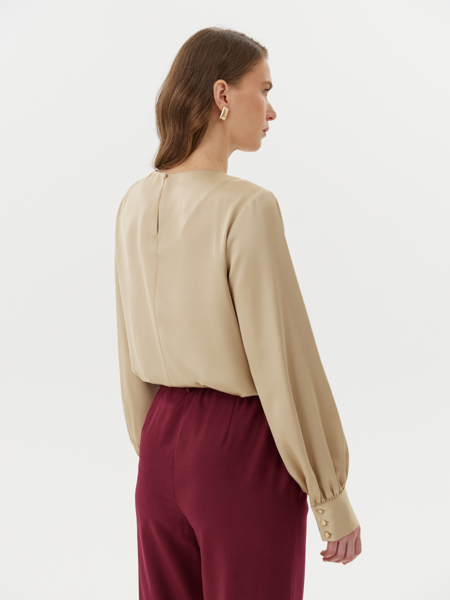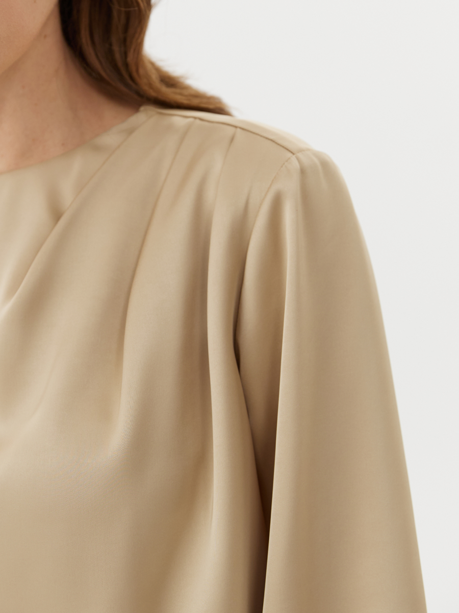 Блуза прямого силуэта из плотного полуматового атласа в утончённом золотисто-бежевом медовом оттенке — женственная и изысканная модель с акцентом на фактуру и детали. Благородный блеск ткани мягко отражает свет, придавая образу теплоту и элегантность. Асимметричные складки на плече добавляют лёгкую динамику и делают модель визуально интересной. Объёмные рукава завершены высокими манжетами, подчеркивая изящество запястий. Застёжка на пуговицу по спинке сохраняет чистоту линии и обеспечивает удобство при надевании. Эта блуза прекрасно дополнит образ с брюками 2.5.2-239, формируя цельный комплект с мягким сиянием и акцентом на утончённый силуэт.