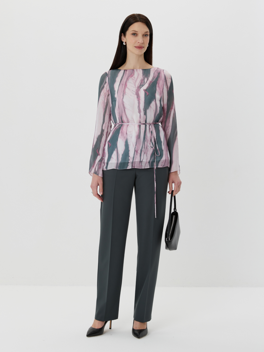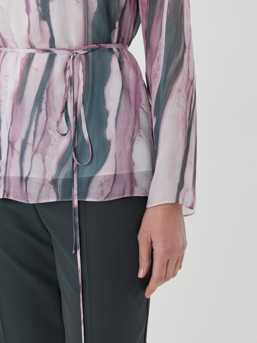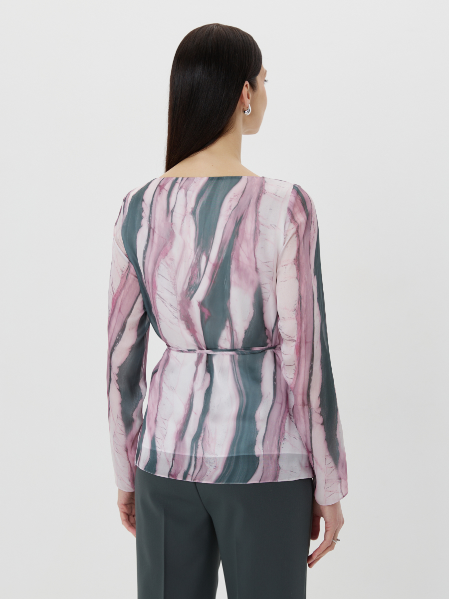 Блузка прямого силуэта из легкого шифона с выразительным принтом в зелено-розовой гамме, имитирующим мраморную фактуру. Горловина оформлена в виде элегантной лодочки, подчеркивающей линию плеч. Втачной рукав полной длины добавляет образу сдержанности и женственности. Талию можно акцентировать съемным поясом, что позволяет варьировать посадку и создавать разные стилистические решения. Такая женственная блузка станет изящным акцентом в повседневном или вечернем образе.