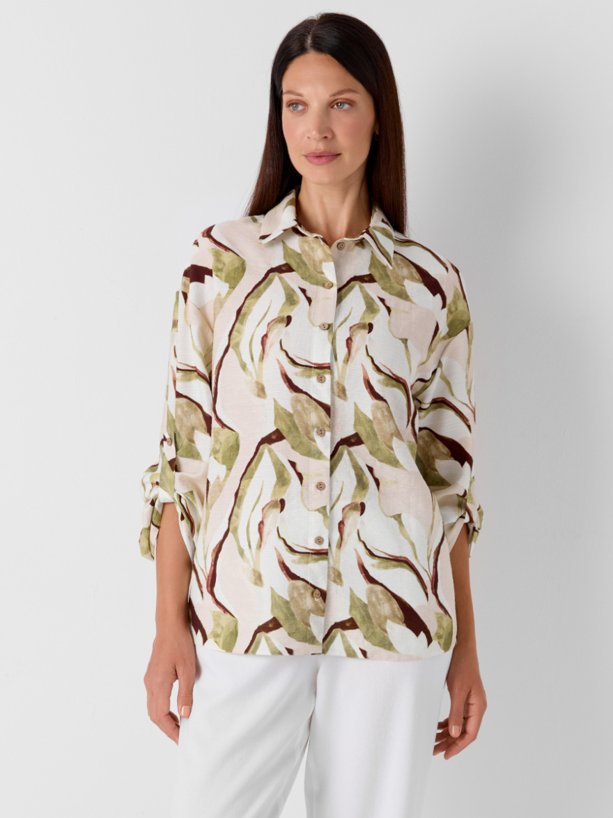 Рубашка из вискозы с натуральной фактурой — лёгкая и стильная модель на каждый день. Классический рубашечный воротник и застёжка на пуговицы по планке делают её идеальной для образов в стиле casual и smart-casual. Рукав 3/4 с патой и пуговицей добавляет универсальности, а разрезы в боковых швах придают модели лёгкость и движение. Это одежда для повседневной носки, которая идеально сочетается как с брюками 2.5.2-222, так и с моделями в цвете "манговая листва" — например, 2.5.1-119.1. Рубашка выполнена в непринужденном принте и подойдёт как для офиса в тёплое время года, так и для прогулок и отпуска.
