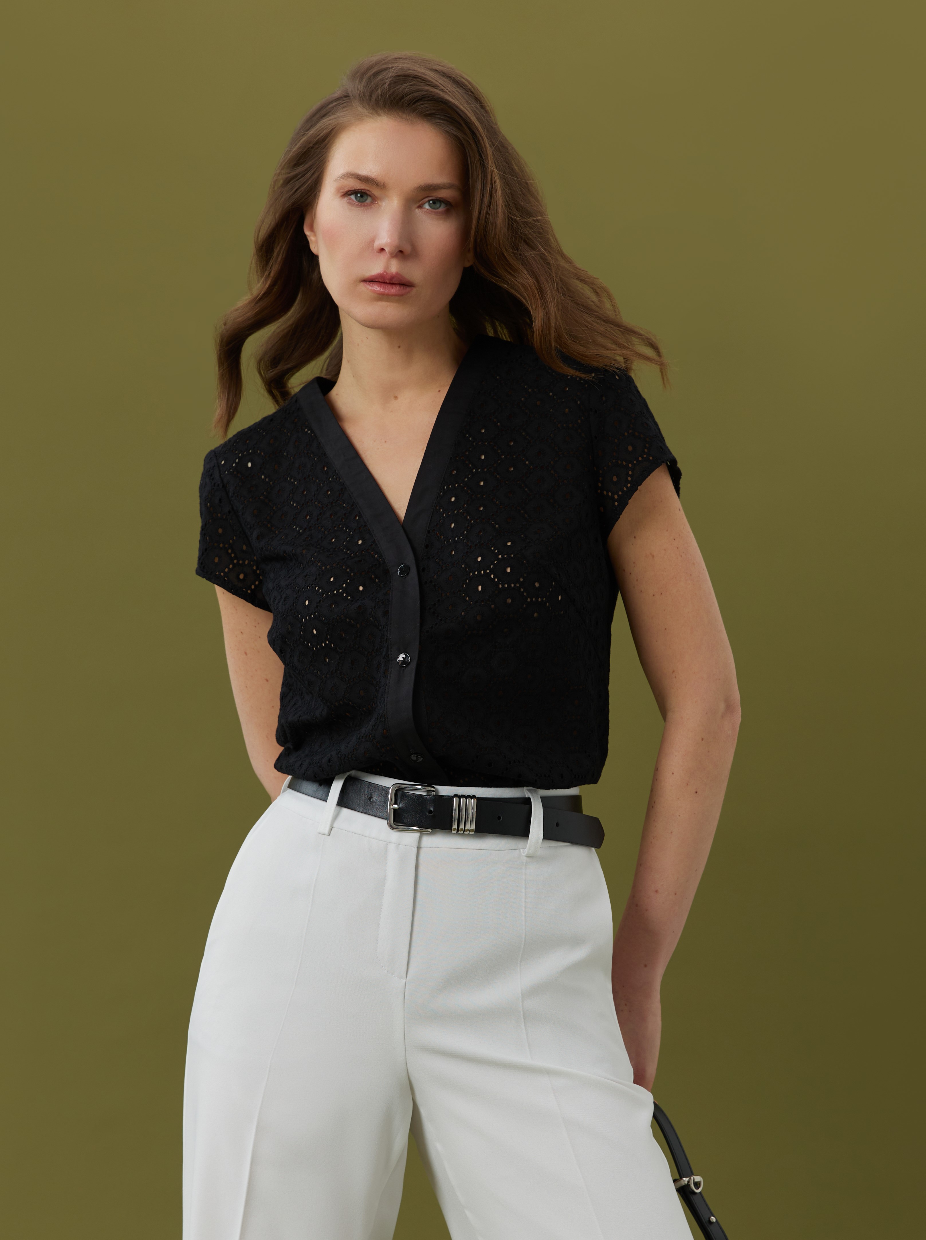 Летняя рубашка полу-прилегающего силуэта из черного хлопкового шитья с геометрическим орнаментом в виде сот — изысканная модель для тёплого сезона. Воздушная текстура и натуральный состав делают её отличным вариантом для повседневных и капсульных летних образов. Короткий рукав и V-образный вырез визуально вытягивают силуэт и акцентируют портретную зону, подчёркивая красоту плеч и шеи. Планка из хлопка в тон украшена рядом пуговиц из чёрной ракушки, что добавляет модели утончённости и изящества. Эта однотонная рубашка с вышивкой легко комбинируется с брюками 2.5.2-260.1 и 2.5.2-222, создавая стильные и сбалансированные комплекты — как для города, так и для отдыха.