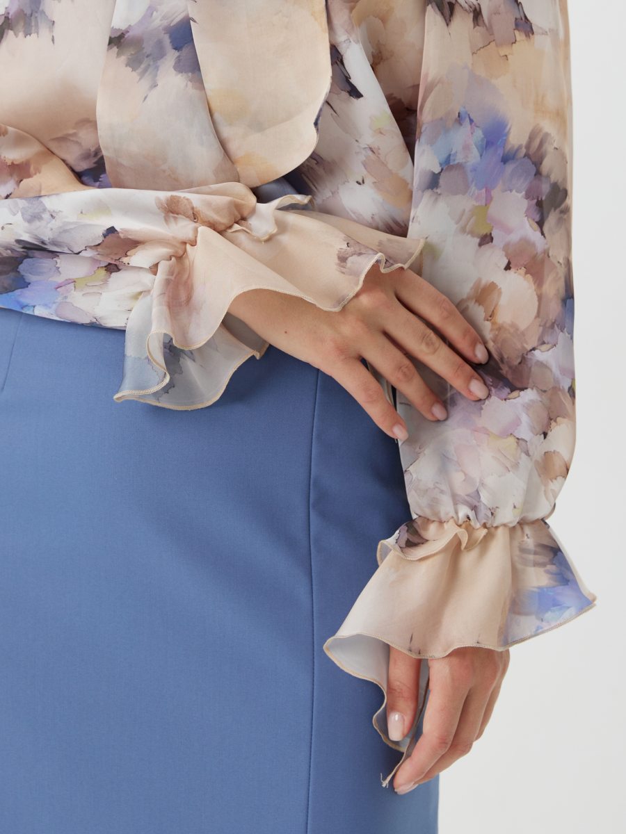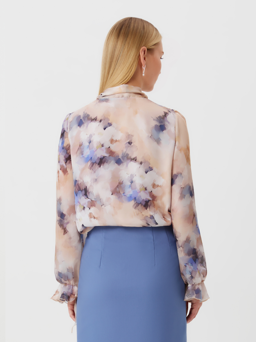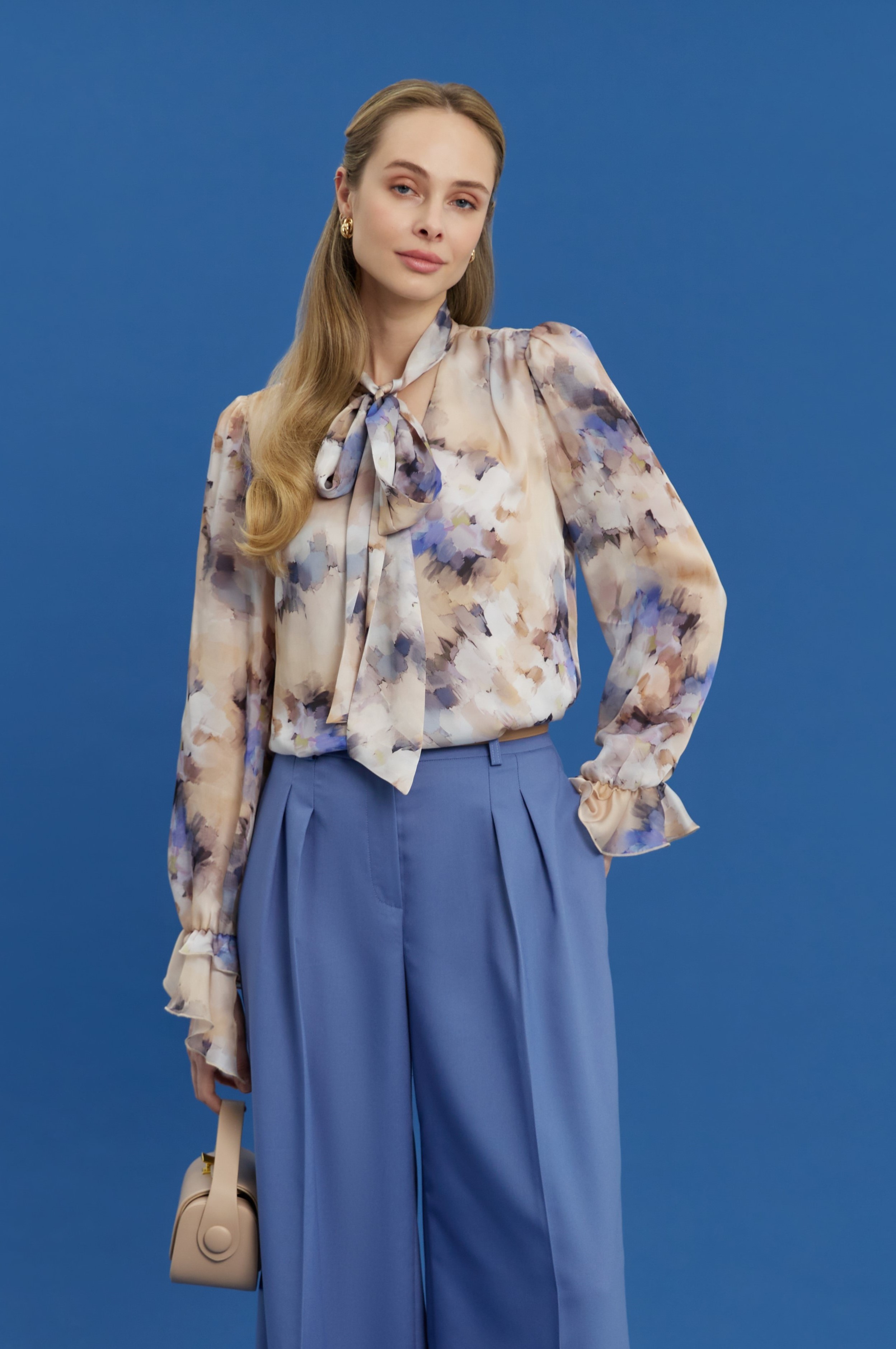 Женственная блуза из воздушного шифона на нежном шифоновом подкладе. Принт в виде весенних цветочных акварелей подчеркивает романтичность модели с шарфом-бантом и и объемными рукавами, дополненными фантазийными манжетами. Блуза составляет отличную партию юбке 2.4.4-840, брюкам 2.5.2-281, а также брюкам 2.5.2-239 из капсулы.
