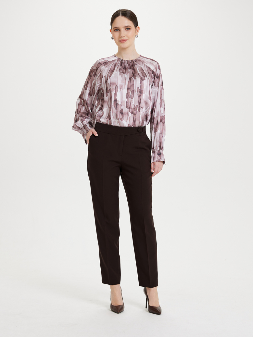 Брюки зауженные из костюмной поливискозы с дизайнерской конструкцией застежки на поясе, в трендовом оттенке горького шоколада. Застежка на молнию и кнопку, карманы, стрелки. Комфортны для повседневной носки, выгодно подчеркивают стройность и длинну ног. Составляют идеальную пару к жакету 2.3.1-869, а также отлично сочетаются со всеми плечевыми изделиями коллекции.