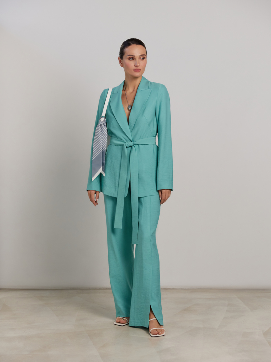 Брюки из комфортной костюмной вискозы. Силуэт прямой. Задняя половинка с резинкой на талии. Спереди асимметричная иммитация затёжки, шлица. Брюки с боковыми карманами. Полной длины. В капсуле составляют комплект с жакетом 2.3.3-863