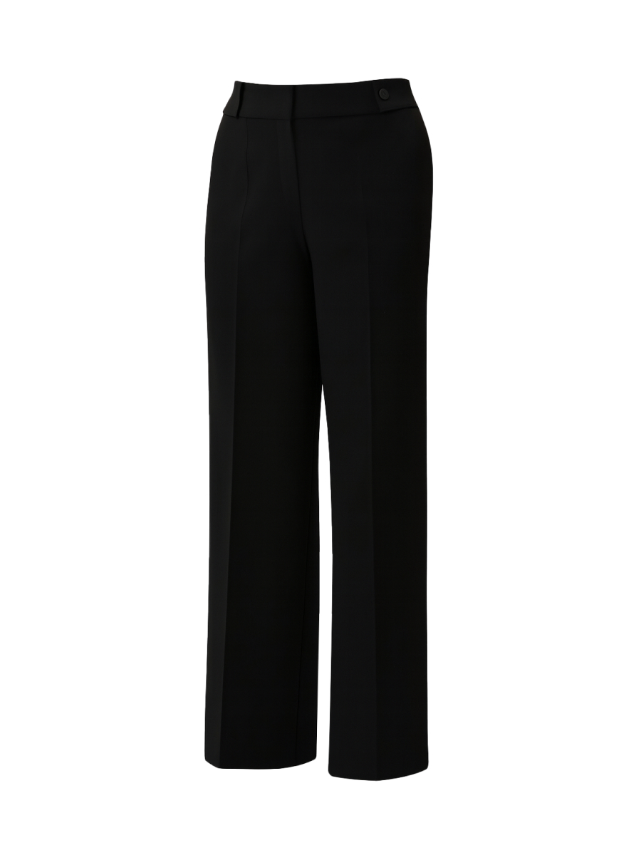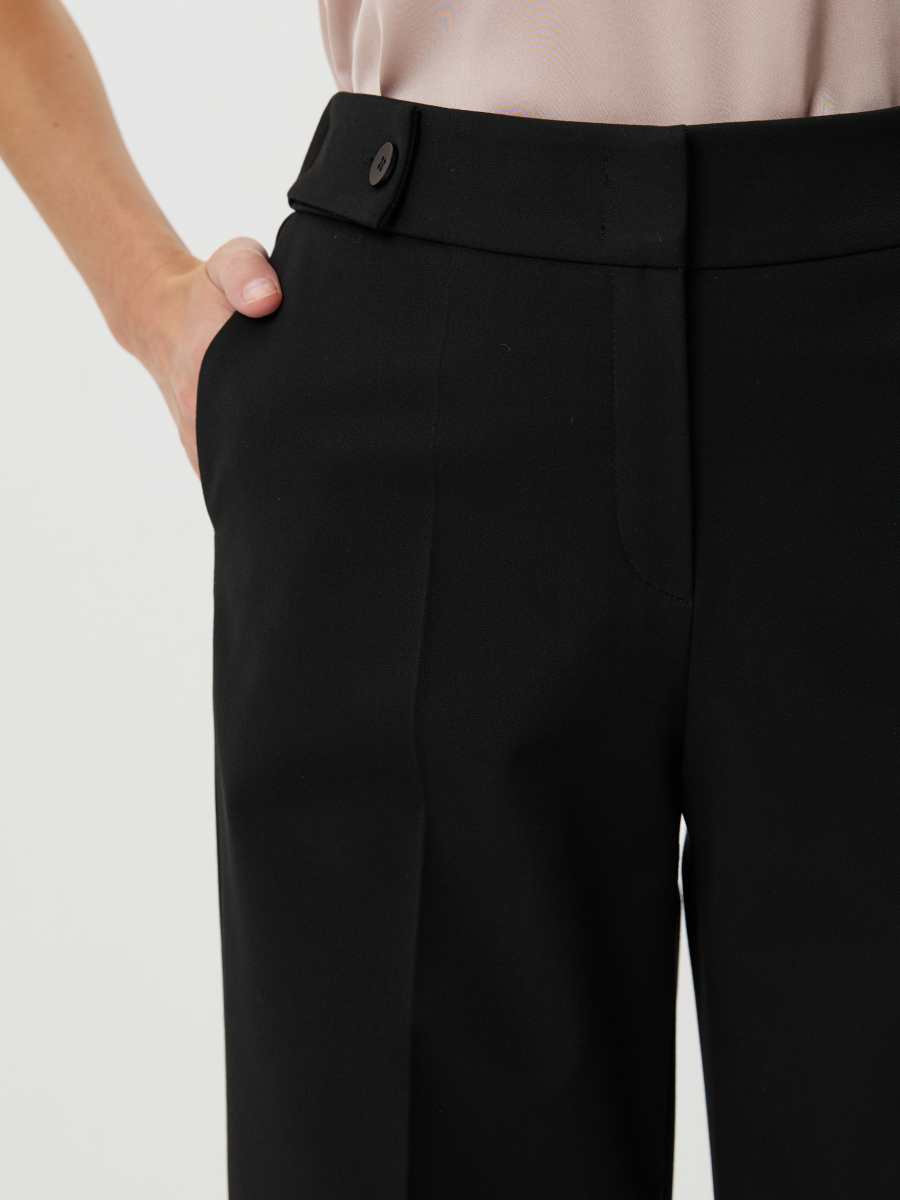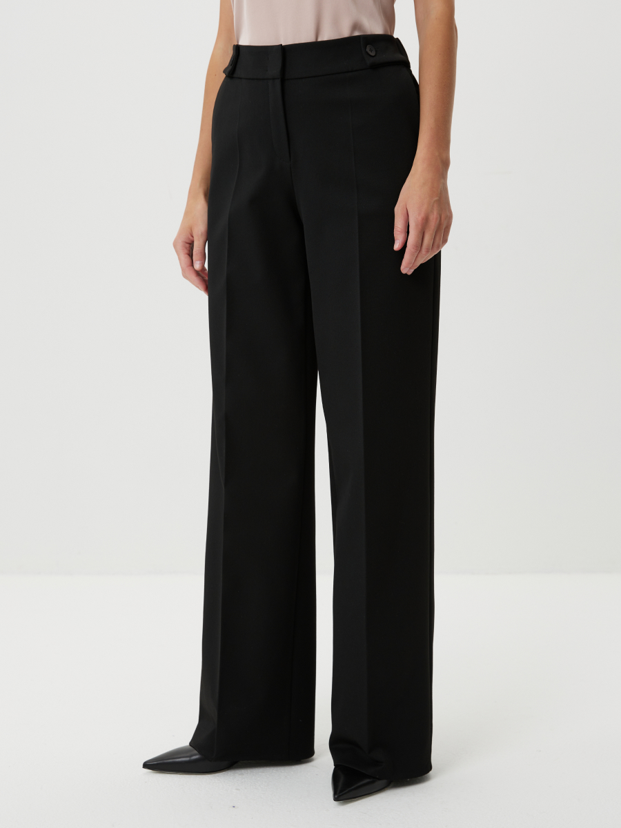 Брюки прямого силуэта из утеплённой костюмной ткани — базовая модель, актуальная в холодный сезон. Глубокий чёрный цвет и чёткие стрелки подчеркивают сдержанную элегантность и позволяют легко интегрировать изделие в деловой или повседневный гардероб. Модель выполнена с широким поясом со шлёвками, который формирует выразительную линию талии и позволяет дополнить образ ремнём. Боковые карманы добавляют функциональности, а застёжка на молнию и крючки обеспечивает аккуратную посадку. Декоративные клапаны на поясе становятся акцентной деталью дизайна, придавая модели характер и завершённость. Полная длина визуально вытягивает силуэт и делает брюки универсальными в сочетании с обувью на каблуке или без.