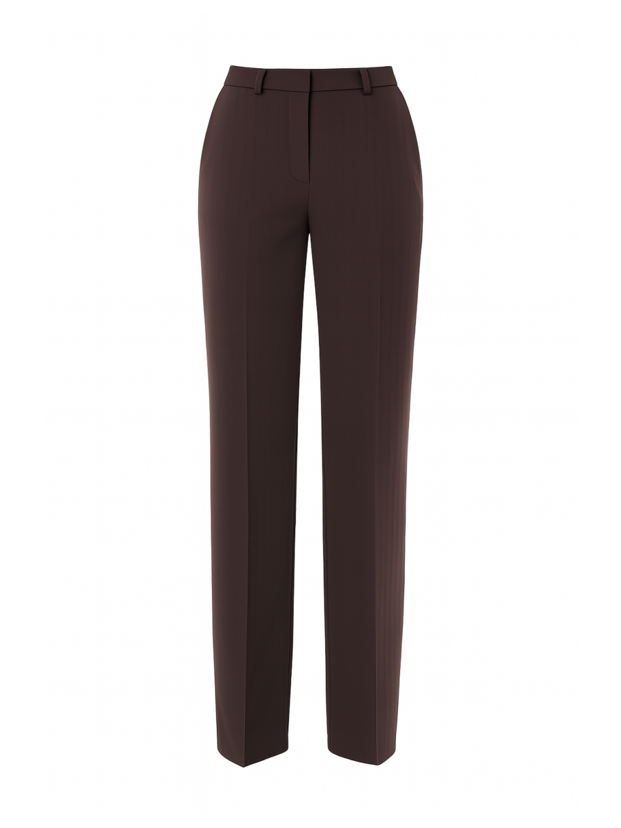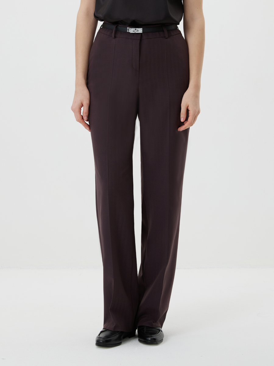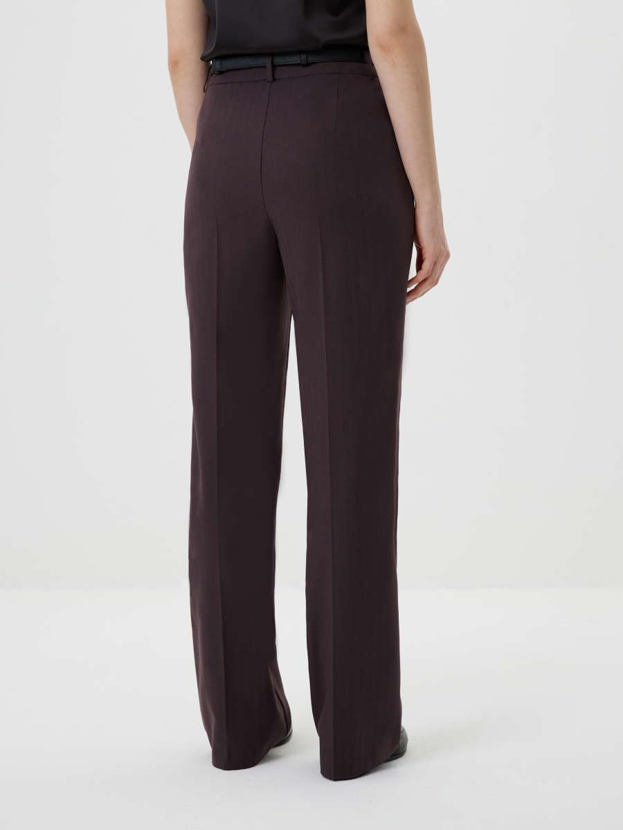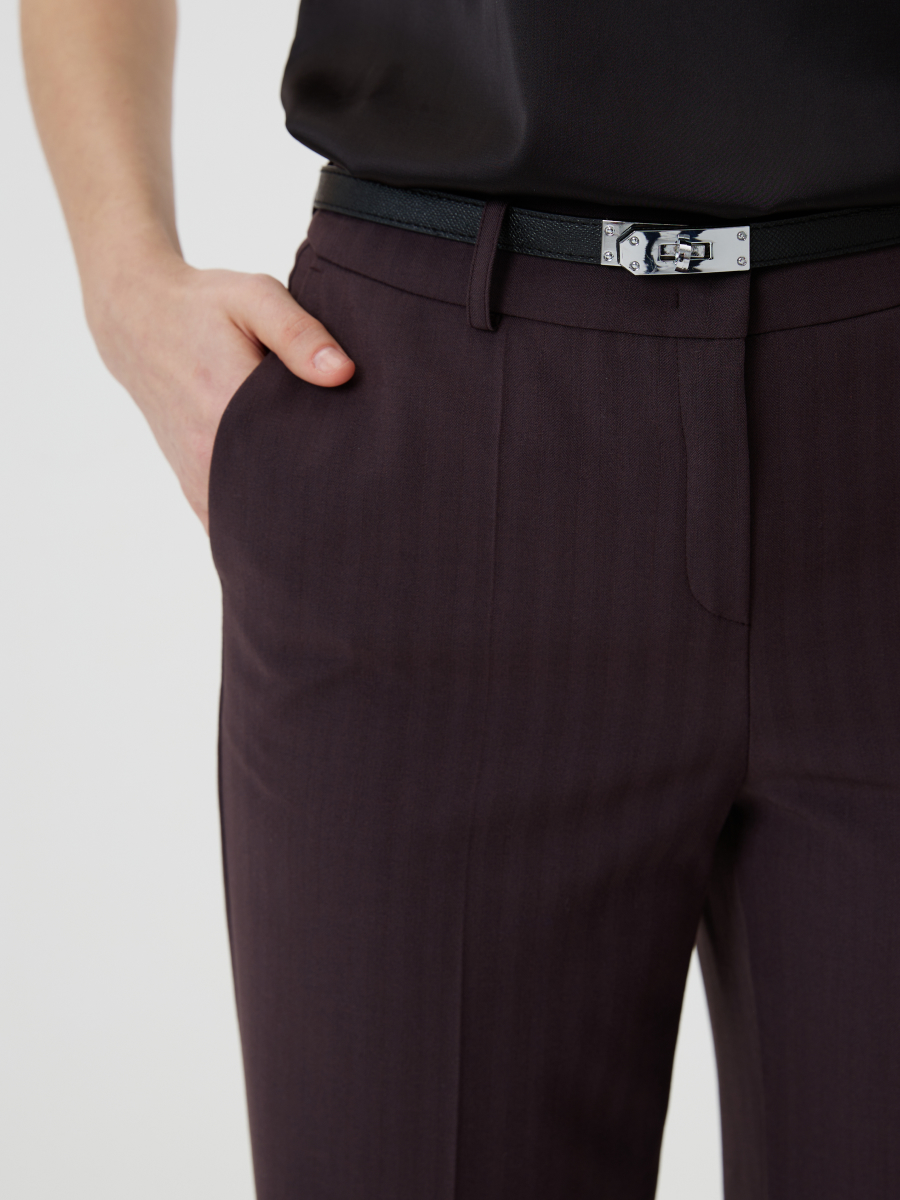 Брюки прямого силуэта со стрелками выполнены из костюмной ткани с добавлением шерсти в благородном оттенке виноградный нектар. Выразительная фактура «елочка» придаёт модели визуальную глубину и делает образ особенно статусным. Посадка по талии дополнена шлевками для ремня, застежкой на молнию и крючки, что обеспечивает точную фиксацию и аккуратный внешний вид. Функциональные боковые карманы делают модель удобной для повседневного использования. Брюки легко интегрируются в деловой гардероб и входят в комплект с жакетом 2.3.4-917, формируя современный женский костюм с акцентом на элегантность и уверенность.