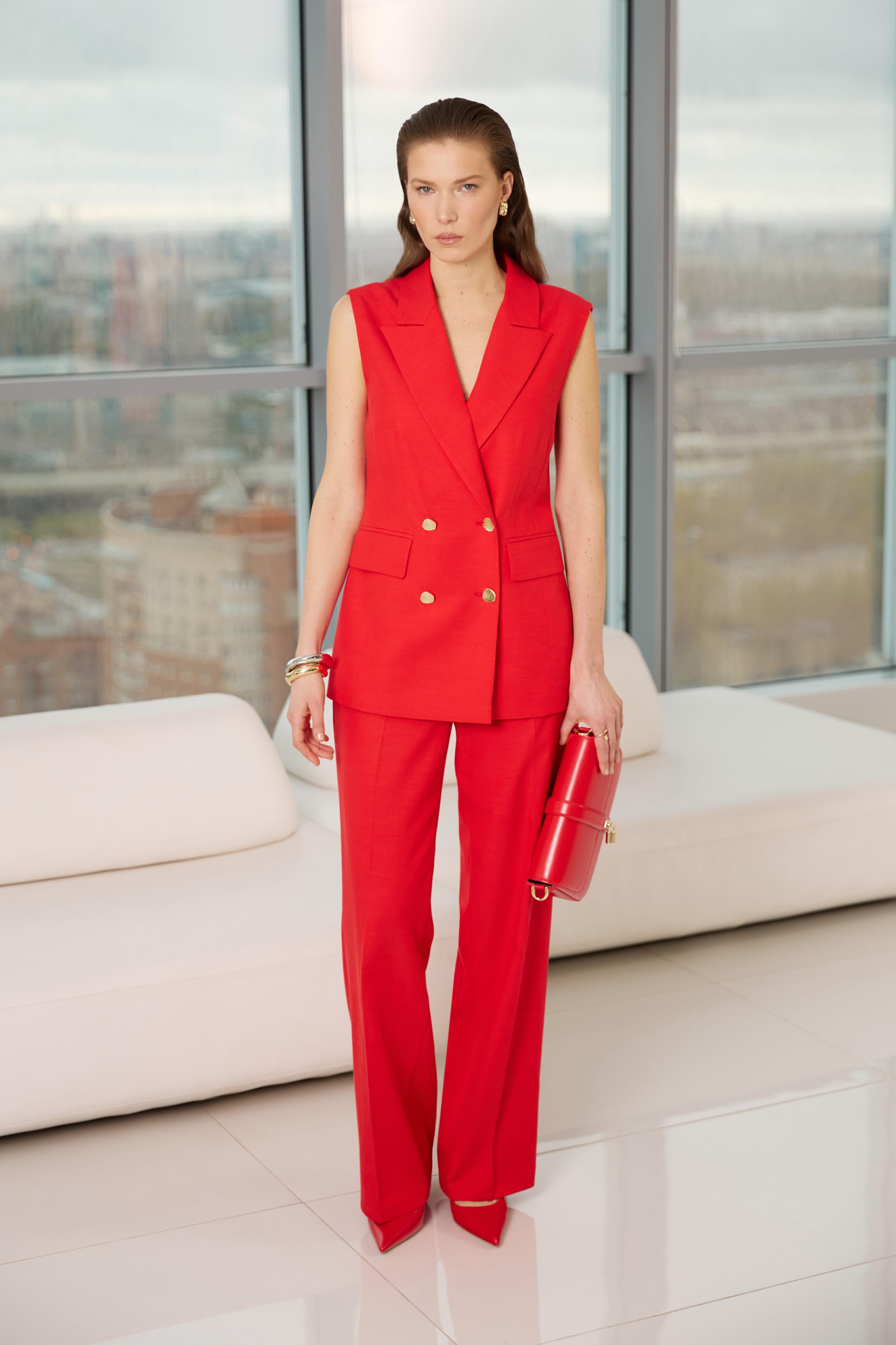 Прямые брюки из натурального смесового тенселя в насыщенном красном оттенке — универсальная модель для тех, кто ценит комфорт, элегантность и выразительные акценты в образе. Ткань мягко струится, обладает благородной матовой текстурой и идеально подходит для тёплого сезона. Благодаря застёжке на крючки и молнию, вытачкам по спинке и резинке в поясе, модель адаптируется под особенности фигуры и обеспечивает комфортную посадку. Стрелки по переду формируют чёткий силуэт, а шлевки для ремня позволяют варьировать образ с акцентами. Эти однотонные прямые брюки со стрелками и поясом на резинке подходят как для повседневных, так и для офисных или костюмных комплектов — легко сочетаются с базовыми топами, жакетами и рубашками.