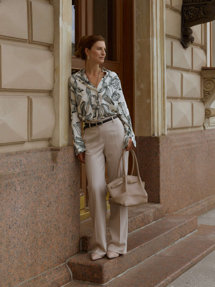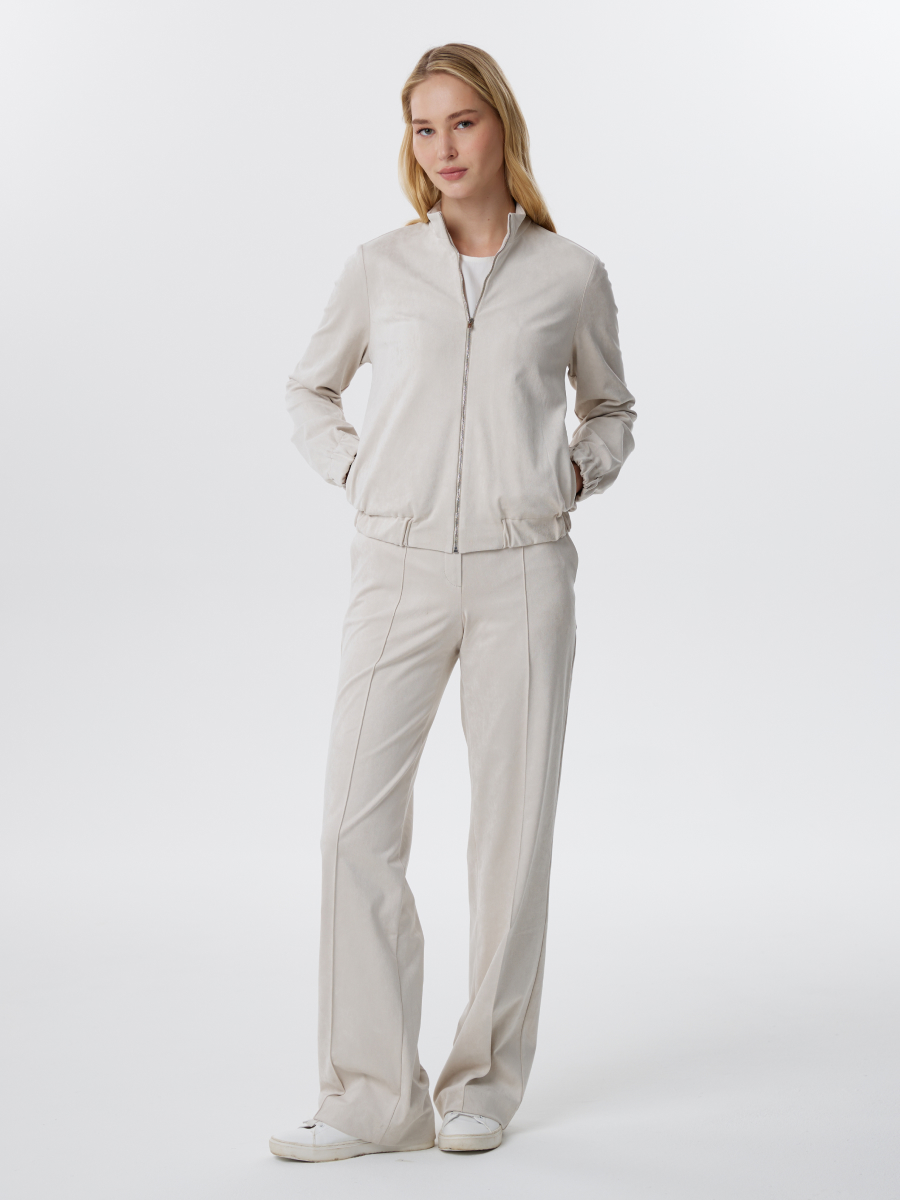 Брюки классического кроя из мягкой трикотажной замши — элегантная и комфортная модель с акцентом на фактуру и структуру. Замша с бархатистой поверхностью придаёт образу теплоту и благородство, а застроченные стрелки визуально вытягивают ноги и подчёркивают силуэт. Модель дополнена шлевками для ремня, боковыми карманами и застёжкой на крючки и молнию, что обеспечивает точную посадку и удобство в повседневной эксплуатации. Плотный, но эластичный материал сохраняет форму и не сковывает движения. Брюки формируют костюм с бомбером 4.3.3-912, а также прекрасно сочетаются с джемпером из сетки 4.6.2-261 или вязаным джемпером 3.DJ.2-185 из капсулы — для создания стильных и сбалансированных образов в мягкой нейтральной палитре.