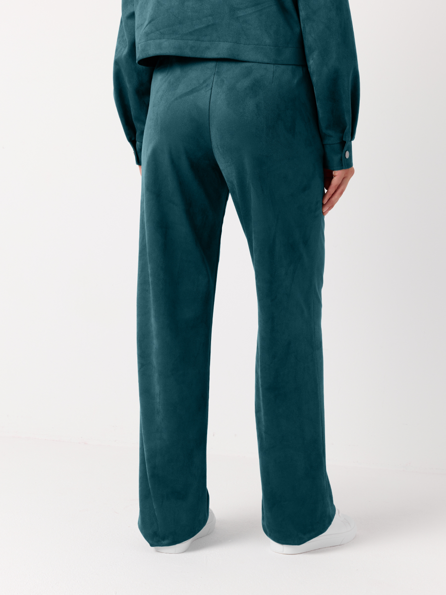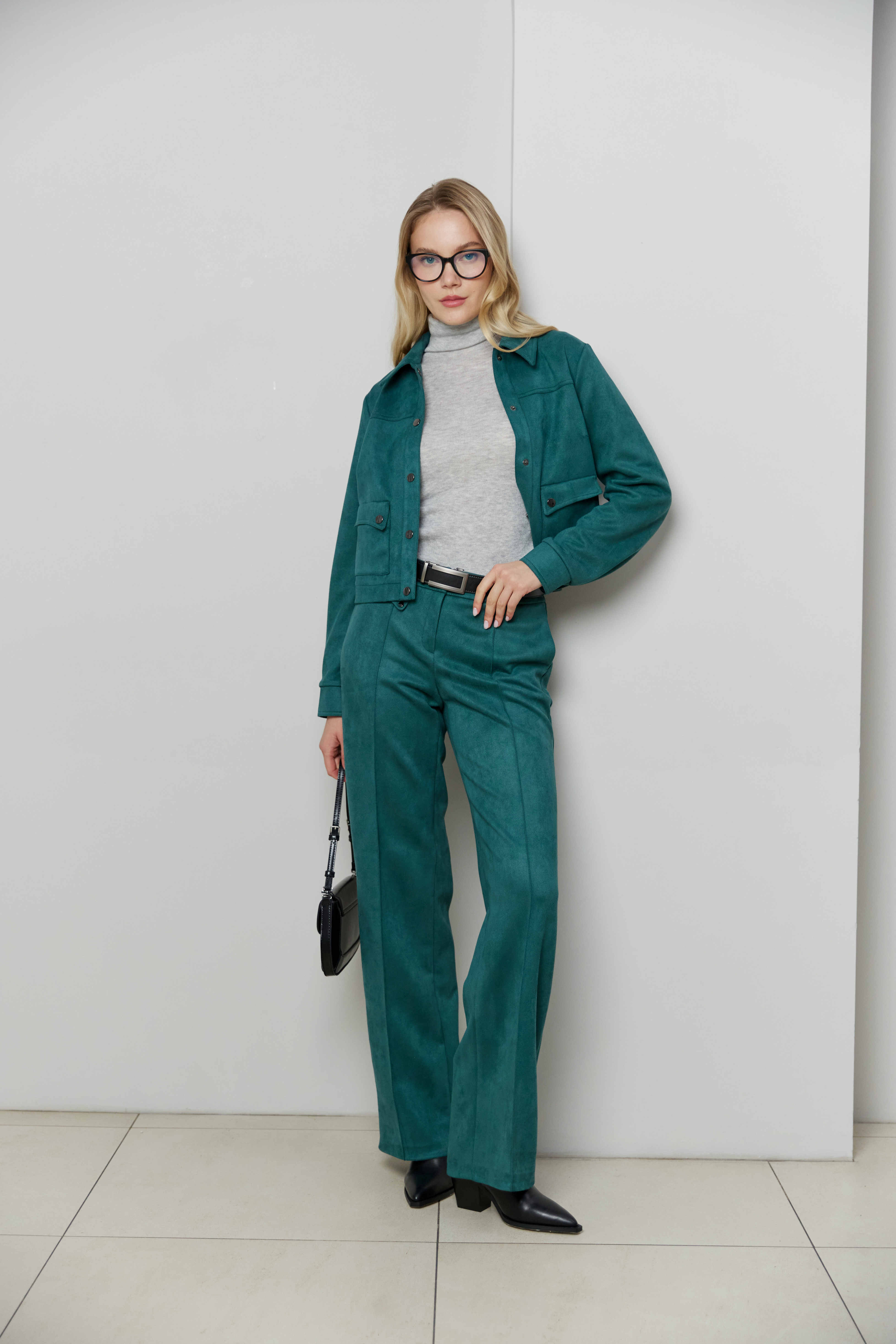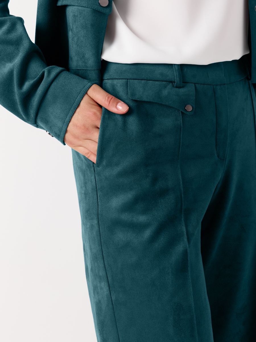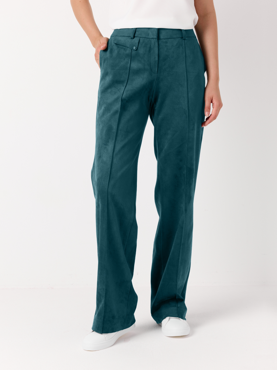 Брюки прямого силуэта из мягкой трикотажной замши в оттенке морской волны. главные особенности модели - застроченные стрелки, пикантная деталь в виде фигурного клапана с застежкой на металлическую кнопку, а также двойная вытачка по спинке для идеальной посадки изделия. Брюки составляют комплект с жакетом 4.3.3-887.