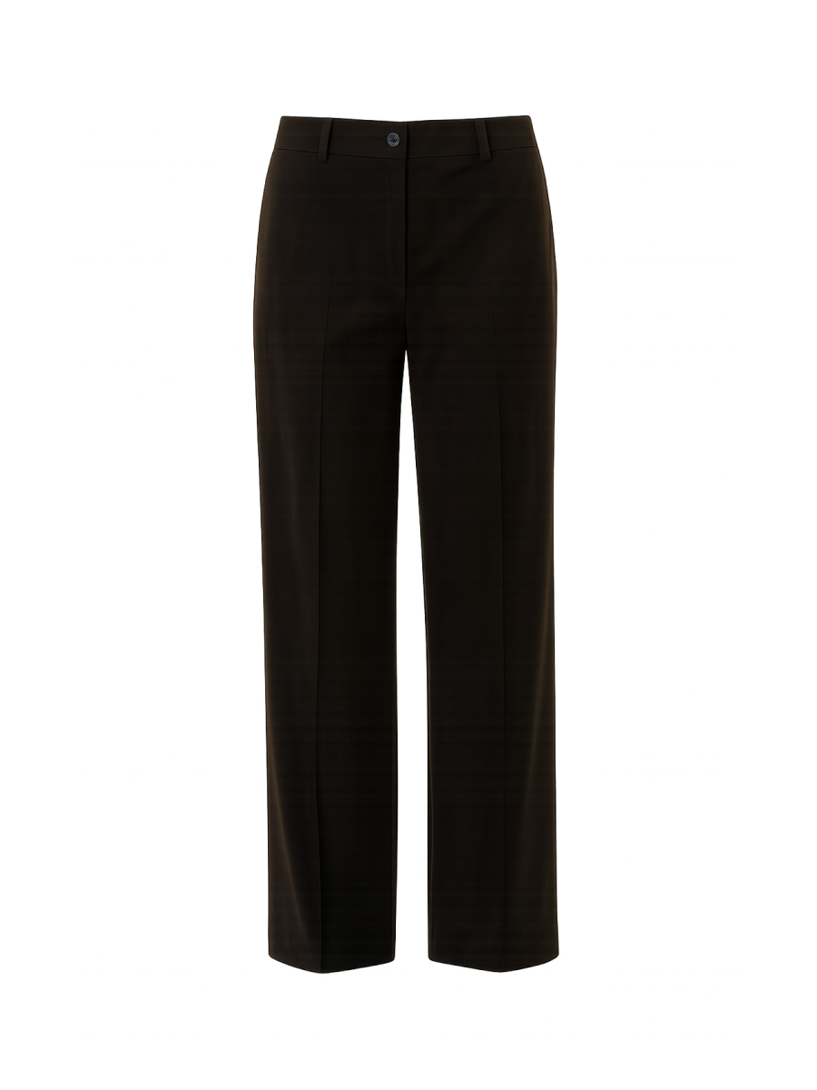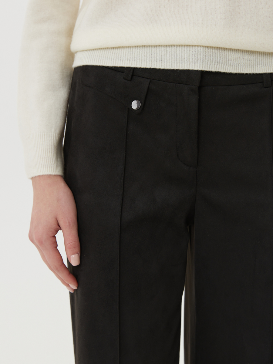 Брюки прямого силуэта из мягкой трикотажной замши в классическом чёрном оттенке — стильная и универсальная модель с акцентом на детали. Трикотажная замша приятно ложится по фигуре, оставаясь комфортной в течение всего дня и придавая образу визуальную глубину за счёт матовой фактуры. Застроченные стрелки формируют чёткий силуэт и визуально удлиняют ноги. Эффектный фигурный клапан с застёжкой на металлическую кнопку добавляет индивидуальности и пикантности, делая модель неординарной, но сдержанной. Двойные вытачки по спинке обеспечивают точную и комфортную посадку. Эти брюки легко сочетаются с джемпером 3.DJ.2-219 или вязаным джемпером 3.DJ.2-193 — создавая современный, сбалансированный образ в стиле smart casual с тактильным комфортом и актуальными акцентами.