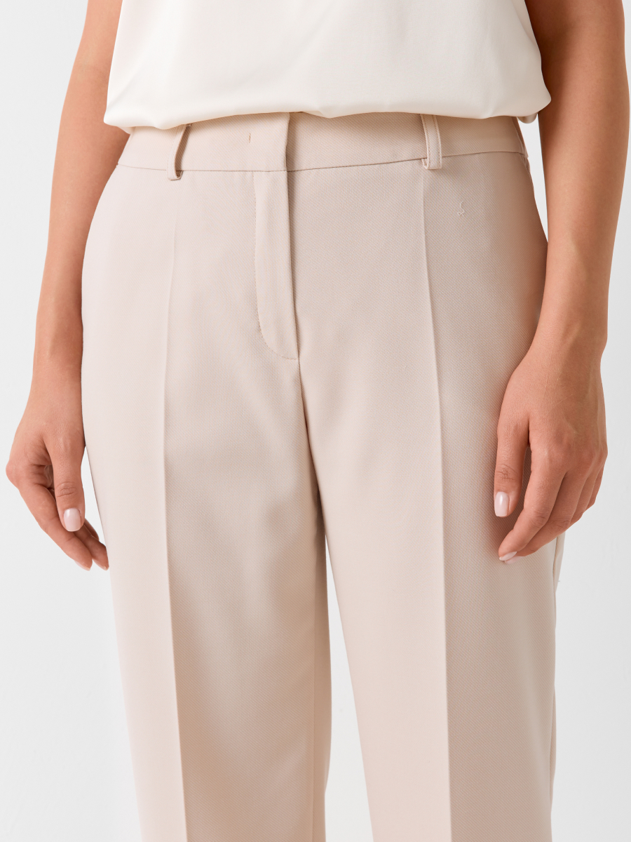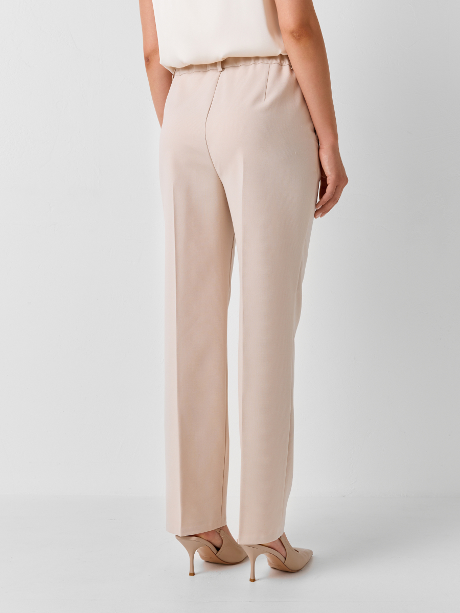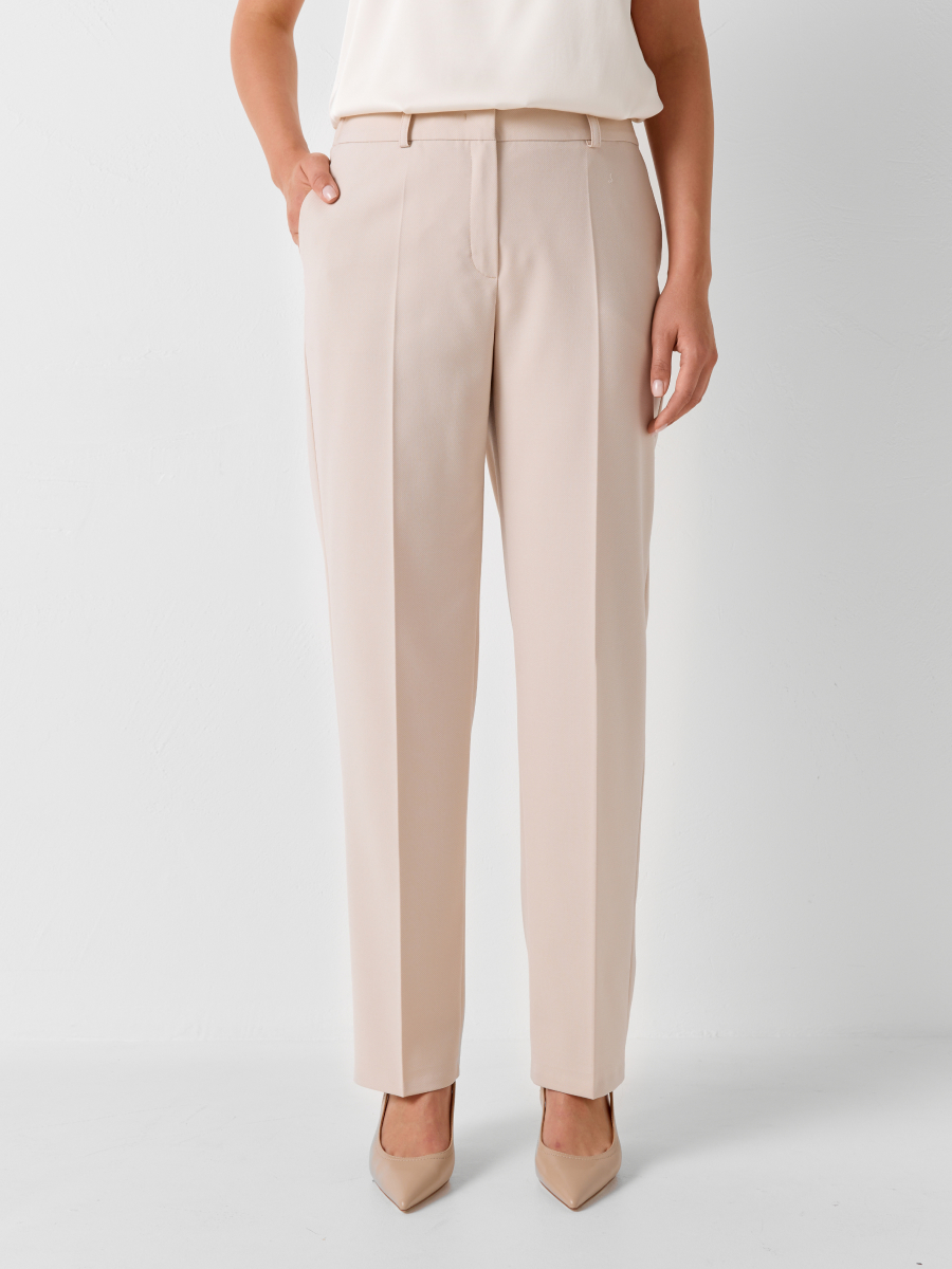 Брюки умеренно зауженного силуэта из мягкой костюмной поливискозы в тонкий рубчик в оттенке сливочной помадки. Резинка по спинке обеспечивает идеальную посадку изделия, стрелки придают строгости и визуально вытягивают силуэт, застежка на крючки и молнию и карманы для удобства носки. Брюки составляют костюм с жакетом 2.3.1-889 и также прекрасно сочетаются с жакетом 2.3.1-895.