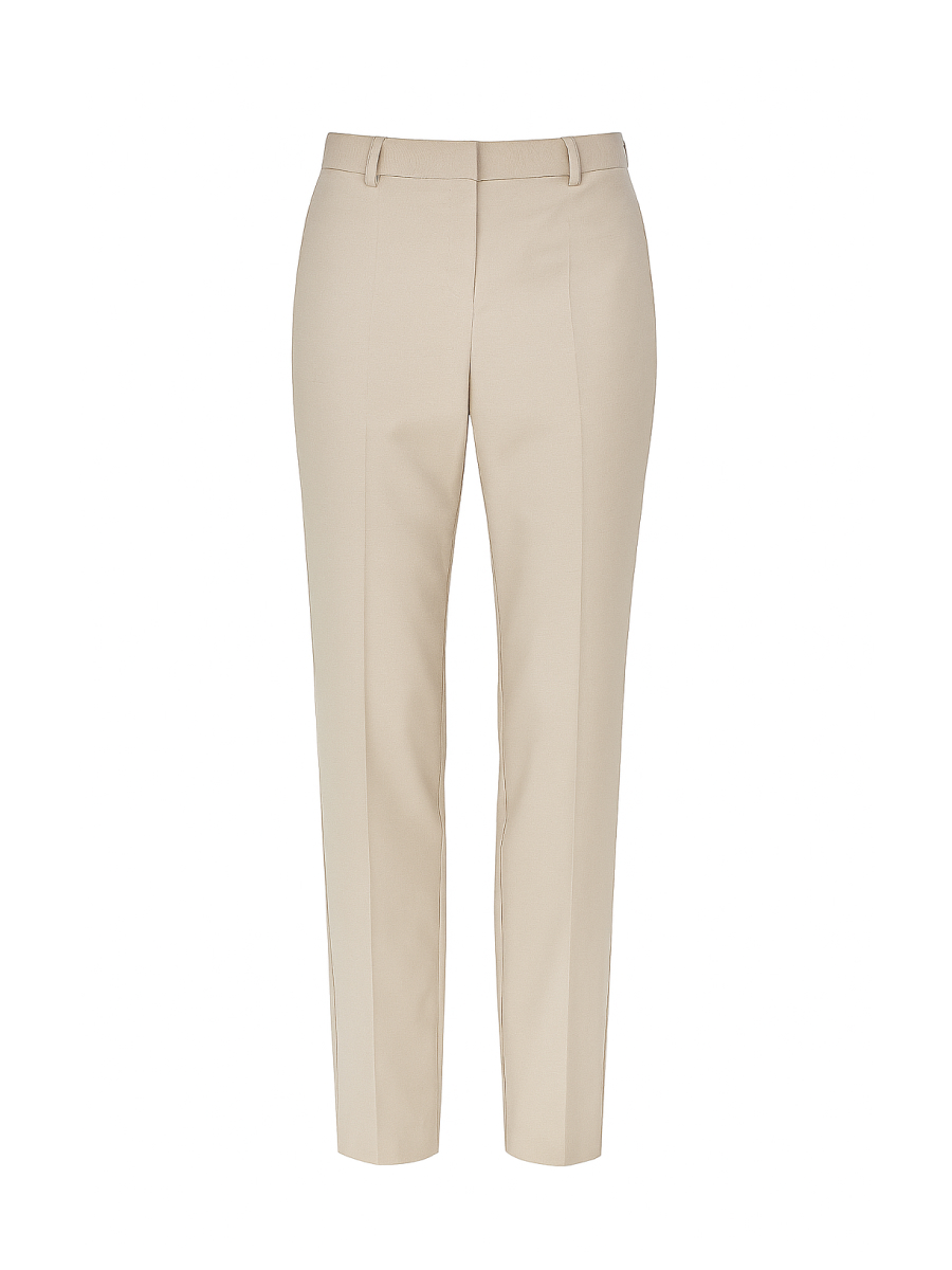 Брюки зауженного силуэта из мягкой костюмной поливискозы в изысканном бежевом оттенке — практичная и универсальная модель для делового и повседневного гардероба. Эластичная вставка на поясе по спинке обеспечивает комфортную посадку, адаптируясь под особенности фигуры. Шлевки для ремня позволяют дополнить образ аксессуарами, а боковые карманы сохраняют функциональность и лаконичный внешний вид. Сдержанная палитра и точный крой визуально вытягивают силуэт и подчёркивают линию ног. Брюки образуют комплект с жакетом 2.3.1-911, а также органично сочетаются с жакетом 2.3.4-870 из капсулы — создавая элегантный образ в современной интерпретации деловой классики.