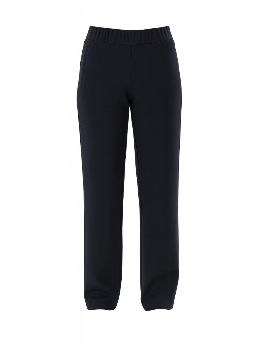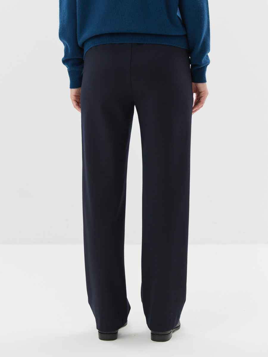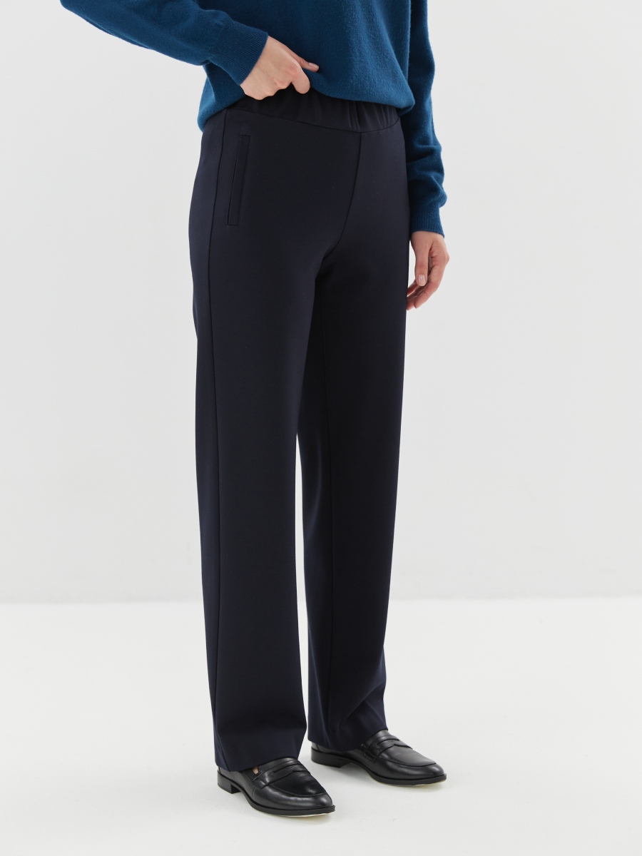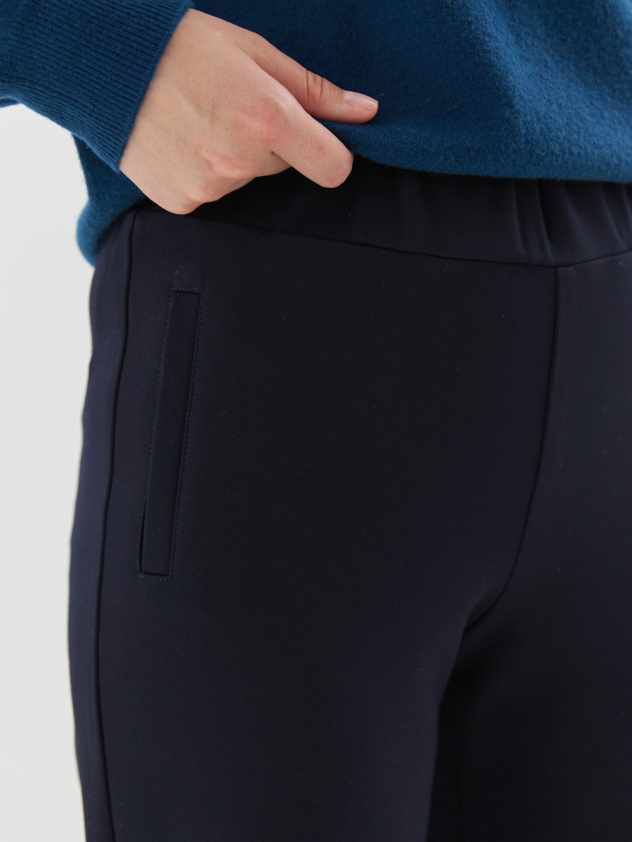 Брюки актуального умеренно зауженного силуэта из тёплого плотного трикотажа в классическом тёмно-синем цвете — универсальная модель для прохладного времени года. Благодаря мягкой, но формодержащей ткани брюки обеспечивают комфорт и при этом сохраняют аккуратный внешний вид в течение дня. Эластичная резинка по талии гарантирует удобную посадку без давления, а декоративные рамки, имитирующие карманы, добавляют изделию завершённость и визуальный акцент. Лаконичный крой делает модель уместной как для повседневной носки, так и для офисных образов в стиле smart casual. Брюки легко сочетаются с любыми плечевыми изделиями из капсулы и отлично дополняют вязаный трикотаж — создавая продуманные образы с акцентом на комфорт, тепло и актуальность.