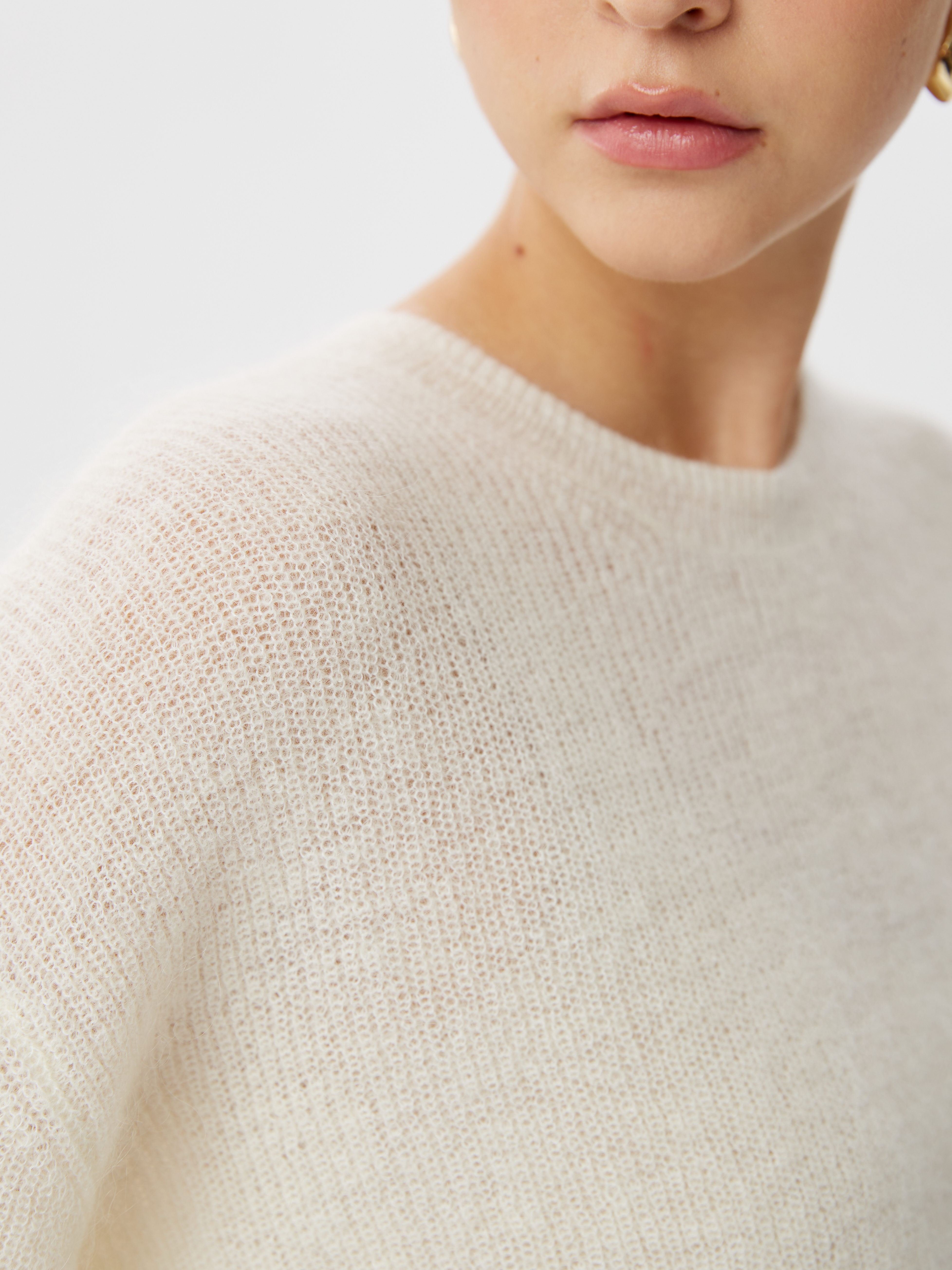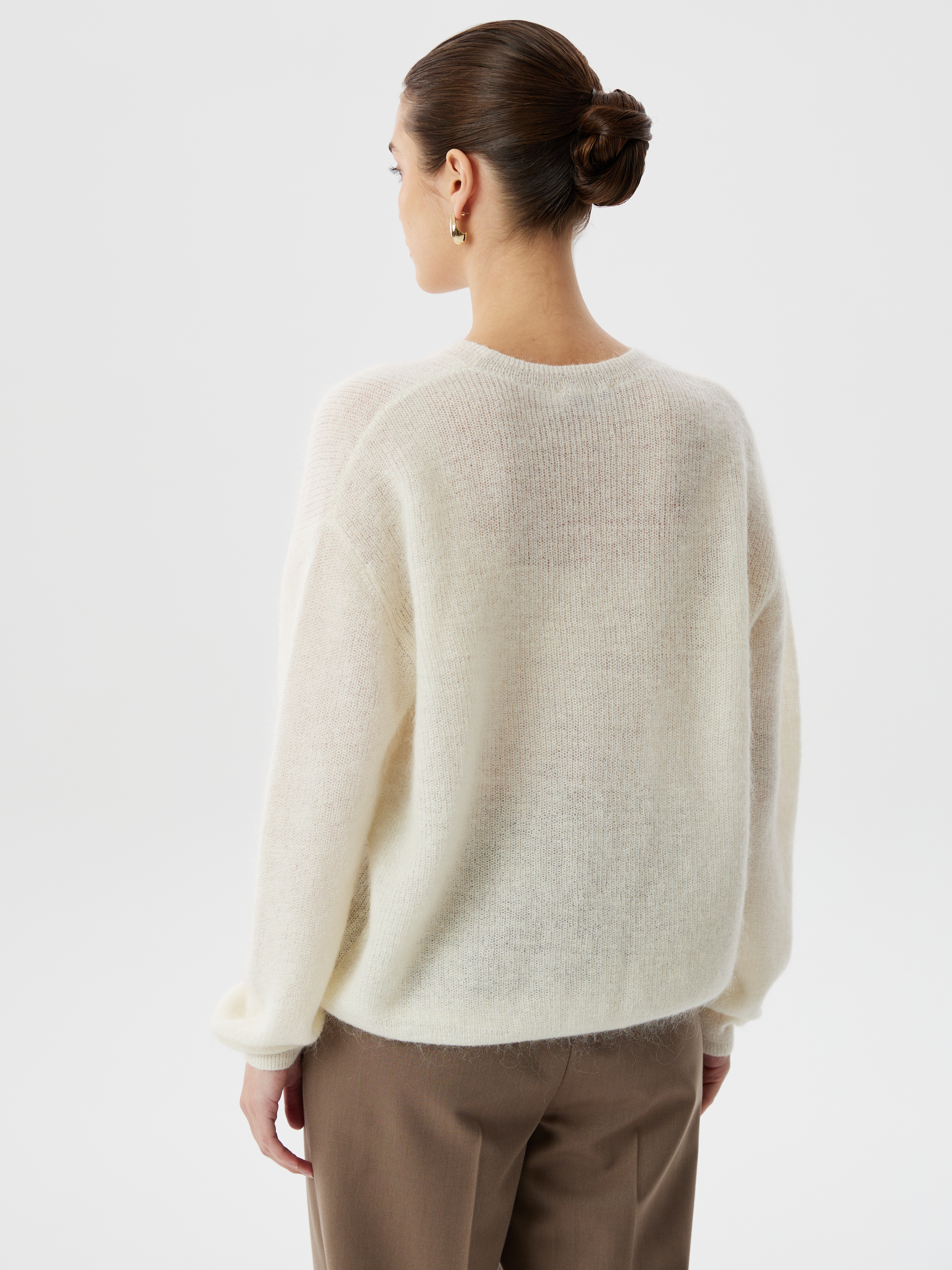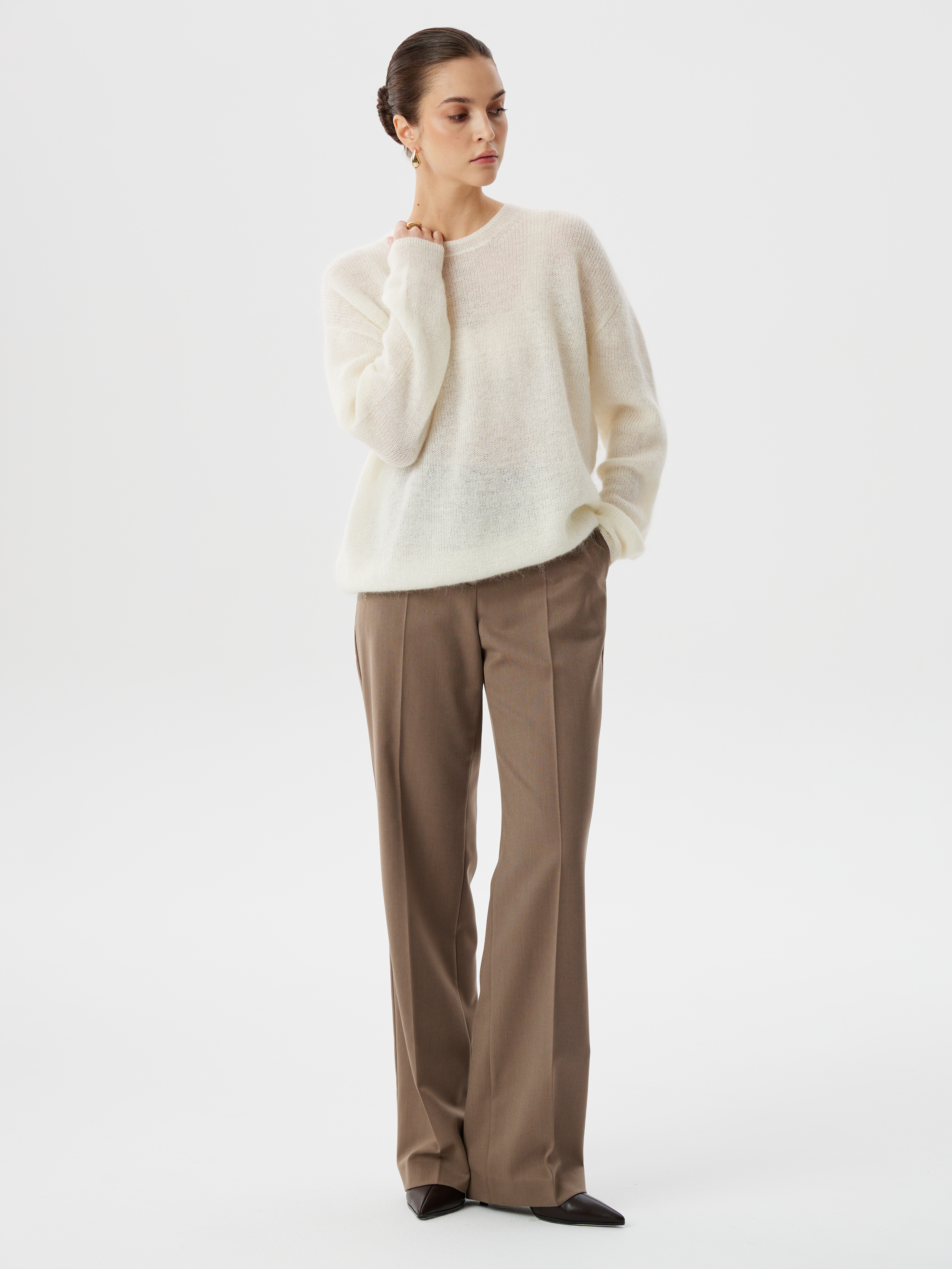 Джемпер из вязаного трикотажа с шерстью и мохером — воплощение мягкости и естественной элегантности. Пряжа с добавлением мохера создаёт лёгкий пушок, придающий модели объём и деликатное сияние, а шерсть обеспечивает тепло и комфорт. Классический крой с круглой горловиной и втачным рукавом полной длины подчёркивает безупречную посадку и делает изделие универсальной базой для множества образов. Длина до линии бёдер позволяет носить джемпер как навыпуск, так и заправленным в брюки или юбку. Лаконичный силуэт и благородная фактура делают модель идеальным выбором для современного гардероба в духе расслабленной элегантности.