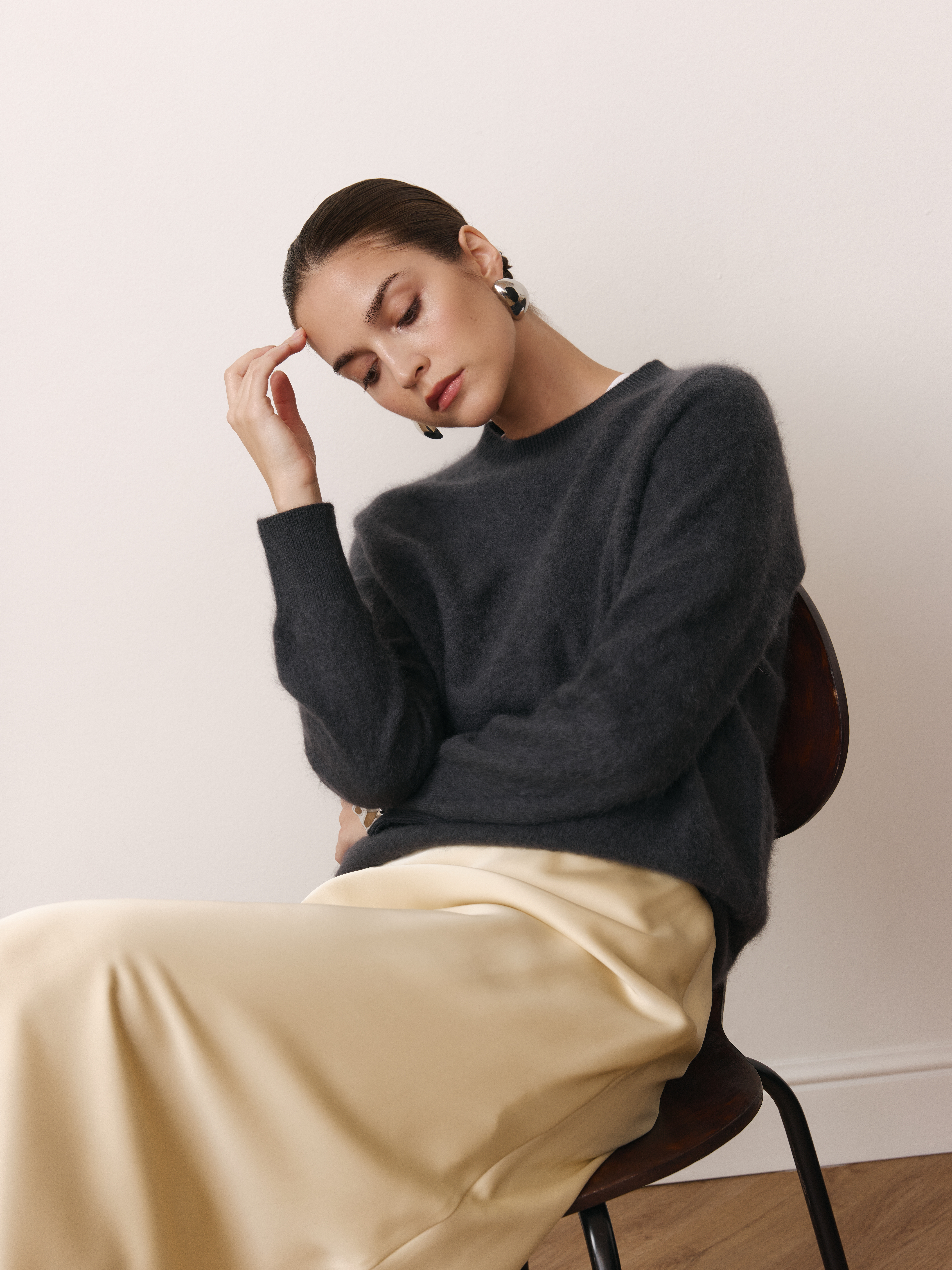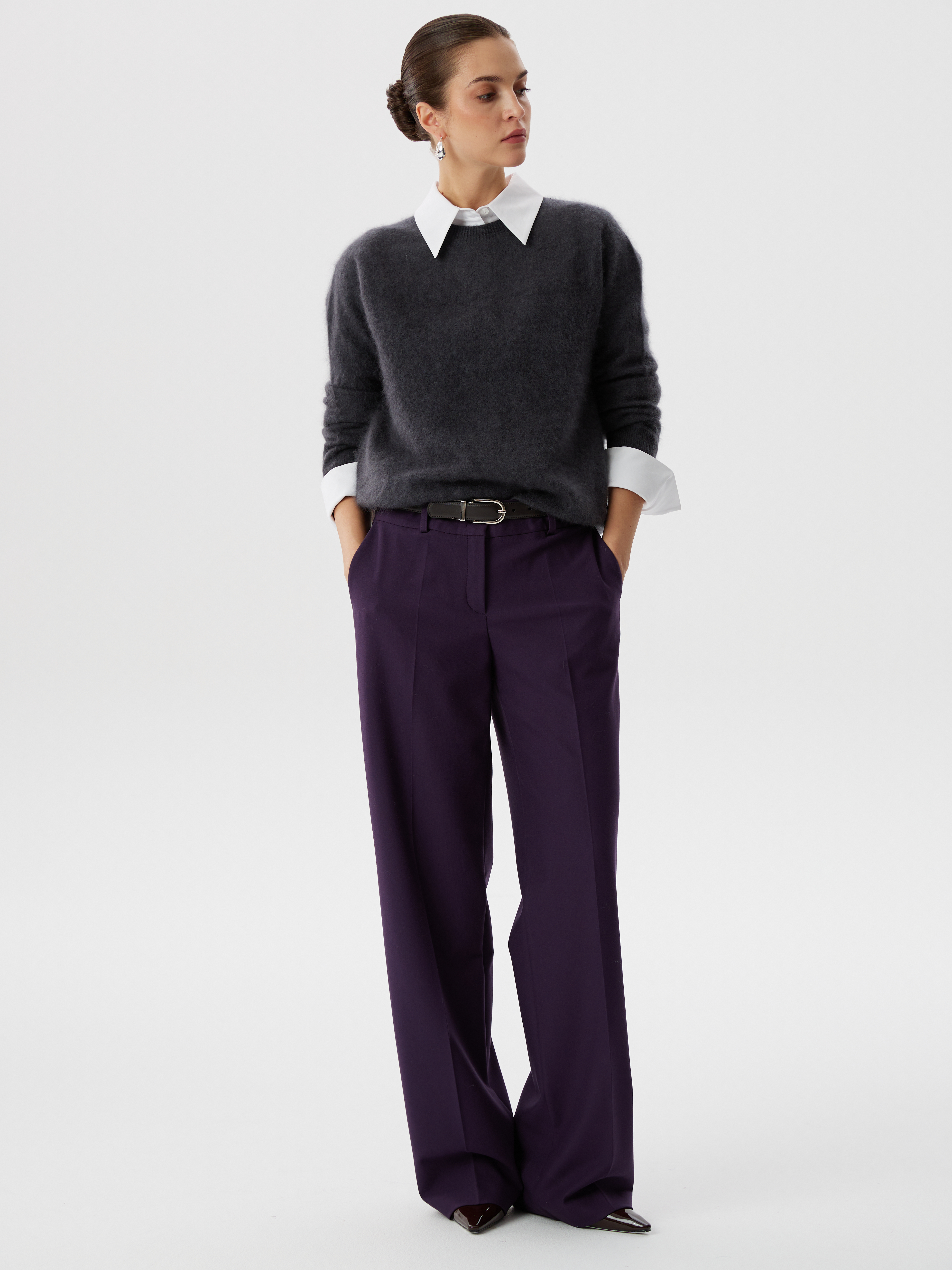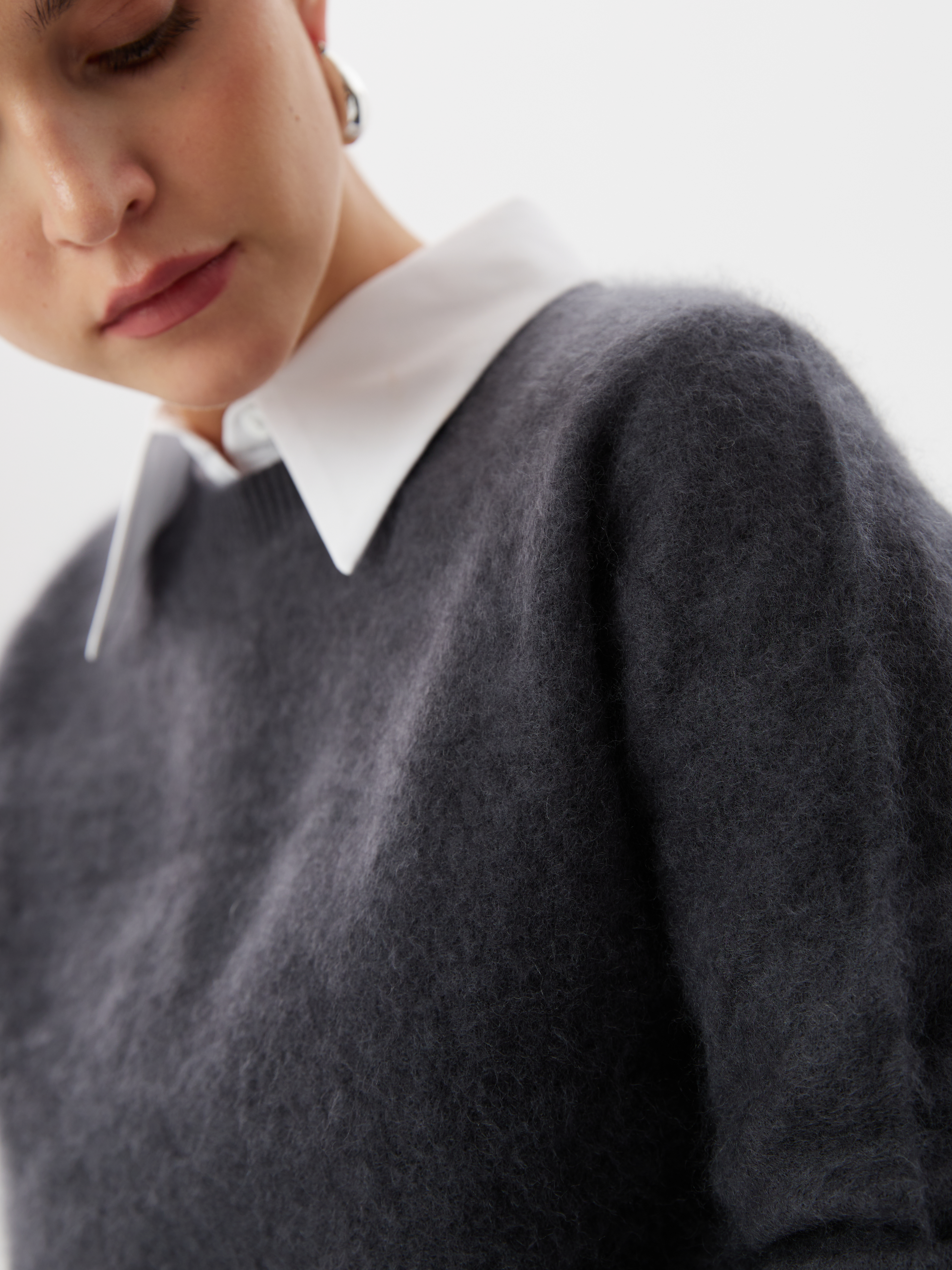 Джемпер из вязаного трикотажа с шерстью и кашемиром — воплощение комфорта и изысканной простоты. Натуральный состав сочетает мягкость кашемира и тепло шерсти, создавая приятное ощущение уюта при соприкосновении с кожей. Классический крой с круглой горловиной и втачным рукавом полной длины обеспечивает идеальную посадку и подчёркивает безупречные линии силуэта. Модель станет универсальной основой для любого гардероба — её можно сочетать с брюками, юбками или жилетами, создавая многослойные образы в стиле элегантной повседневности.