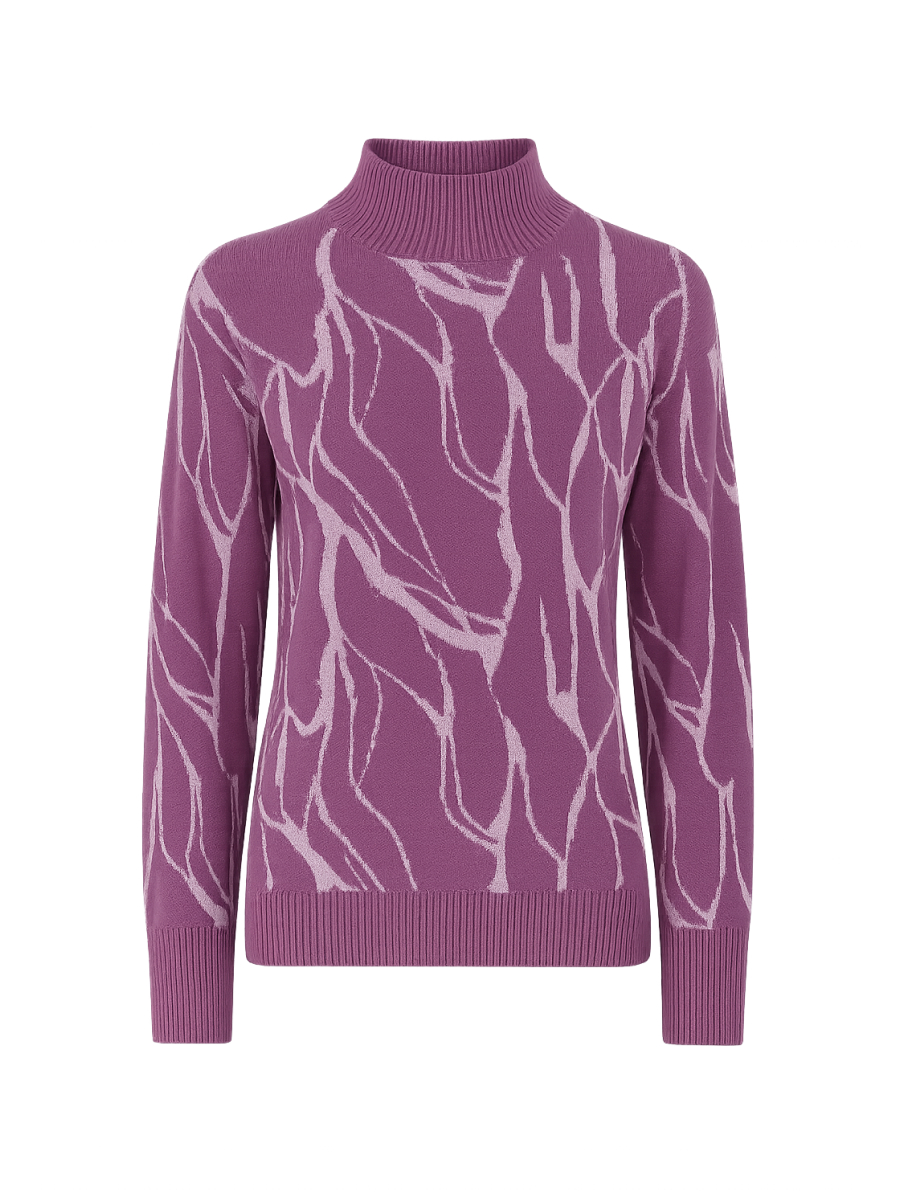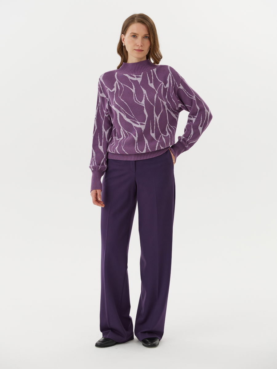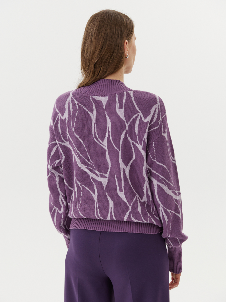 Джемпер прямого силуэта средней длины — эффектная модель, которая сочетает в себе сдержанную форму и выразительный визуальный акцент. Главной особенностью является авторский принт "виноградный мрамор", объединяющий природную фактуру и глубокий цветовой подтон. Такой рисунок придаёт изделию индивидуальность и делает его ключевым элементом образа. Сбалансированный крой обеспечивает комфорт и свободу движений, а универсальная длина позволяет легко сочетать джемпер с юбками, брюками или джинсами.