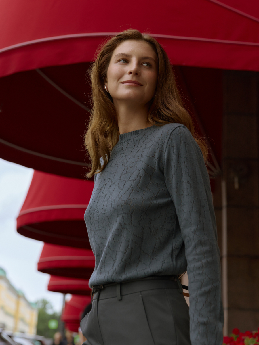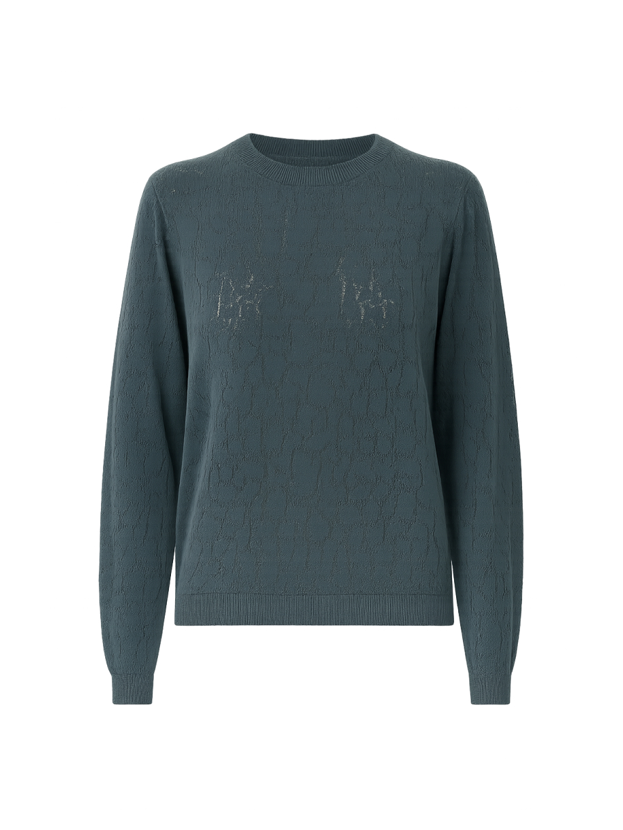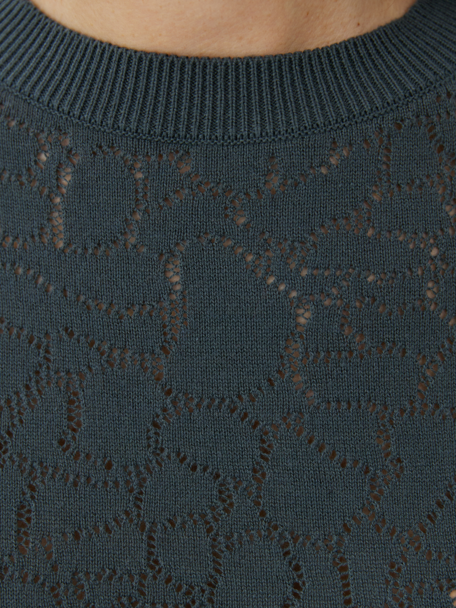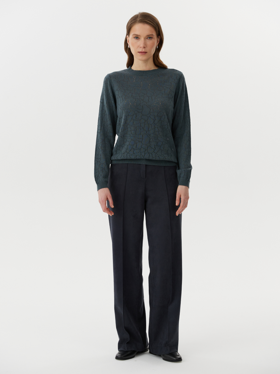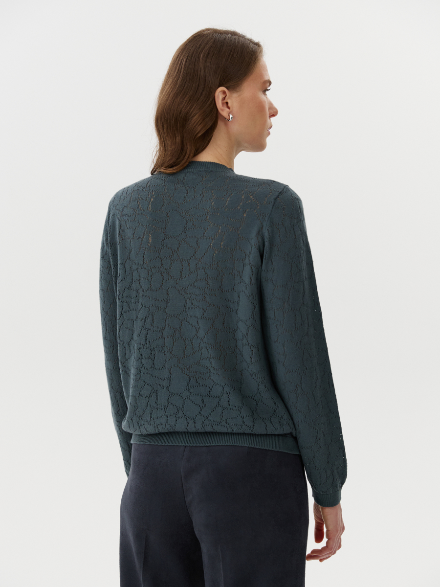 Джемпер прямого силуэта с выразительной ажурной фактурой, подчеркивающей женственность и легкость образа. Классическая круглая горловина придает лаконичность, а рукав полной длины делает модель универсальной для любого сезона. Благодаря продуманному крою и мягкой текстуре джемпер легко вписывается в как повседневные, так и более собранные образы.