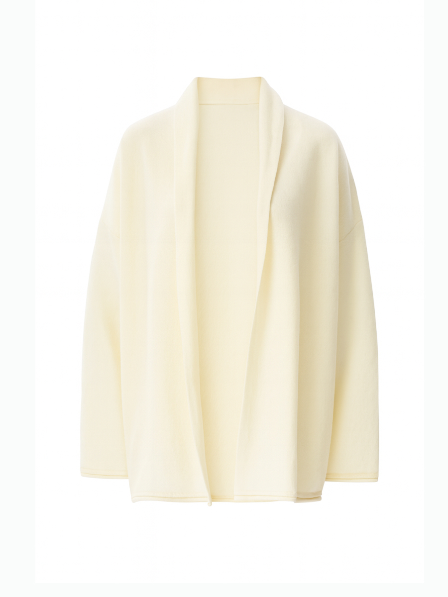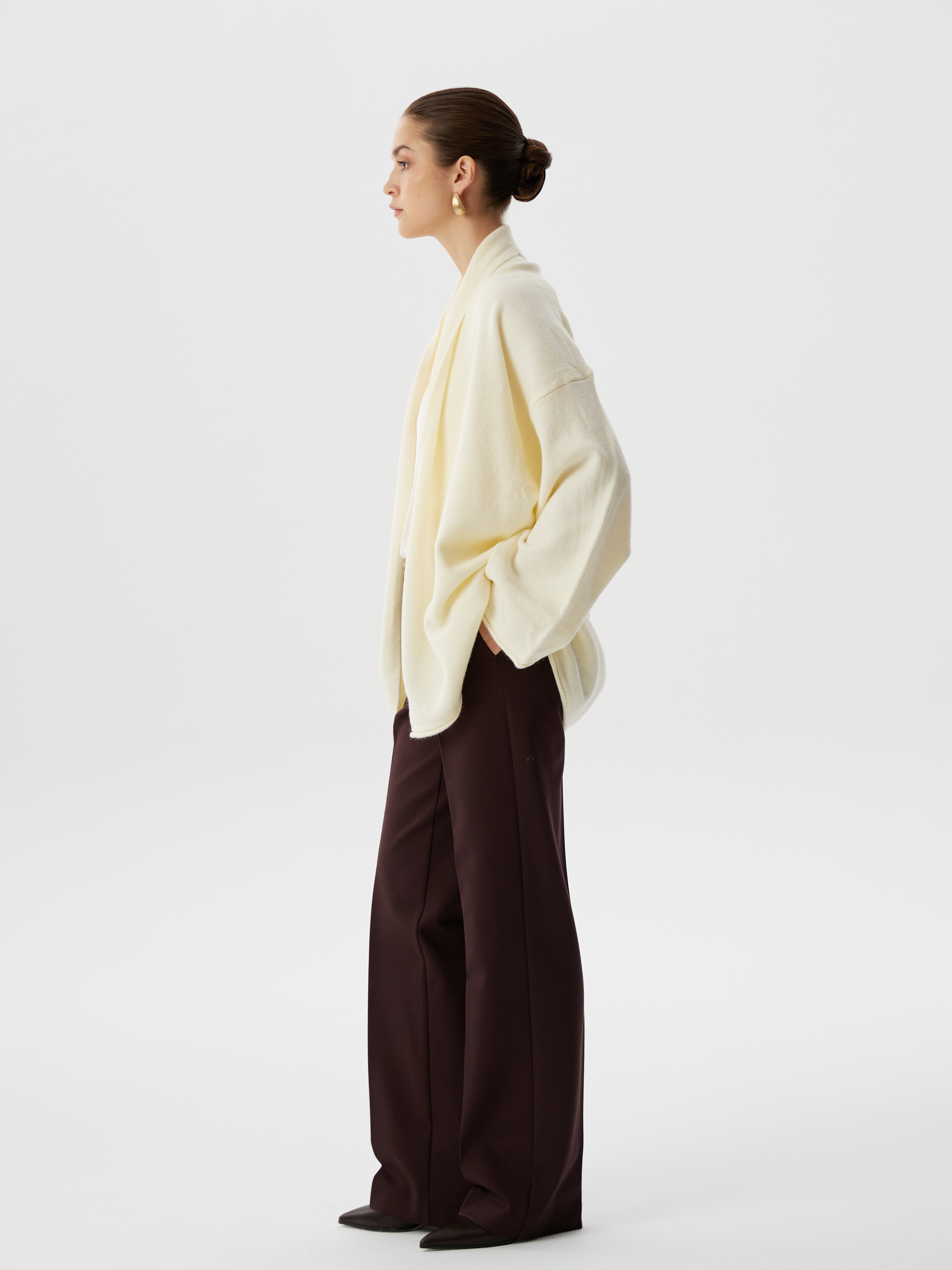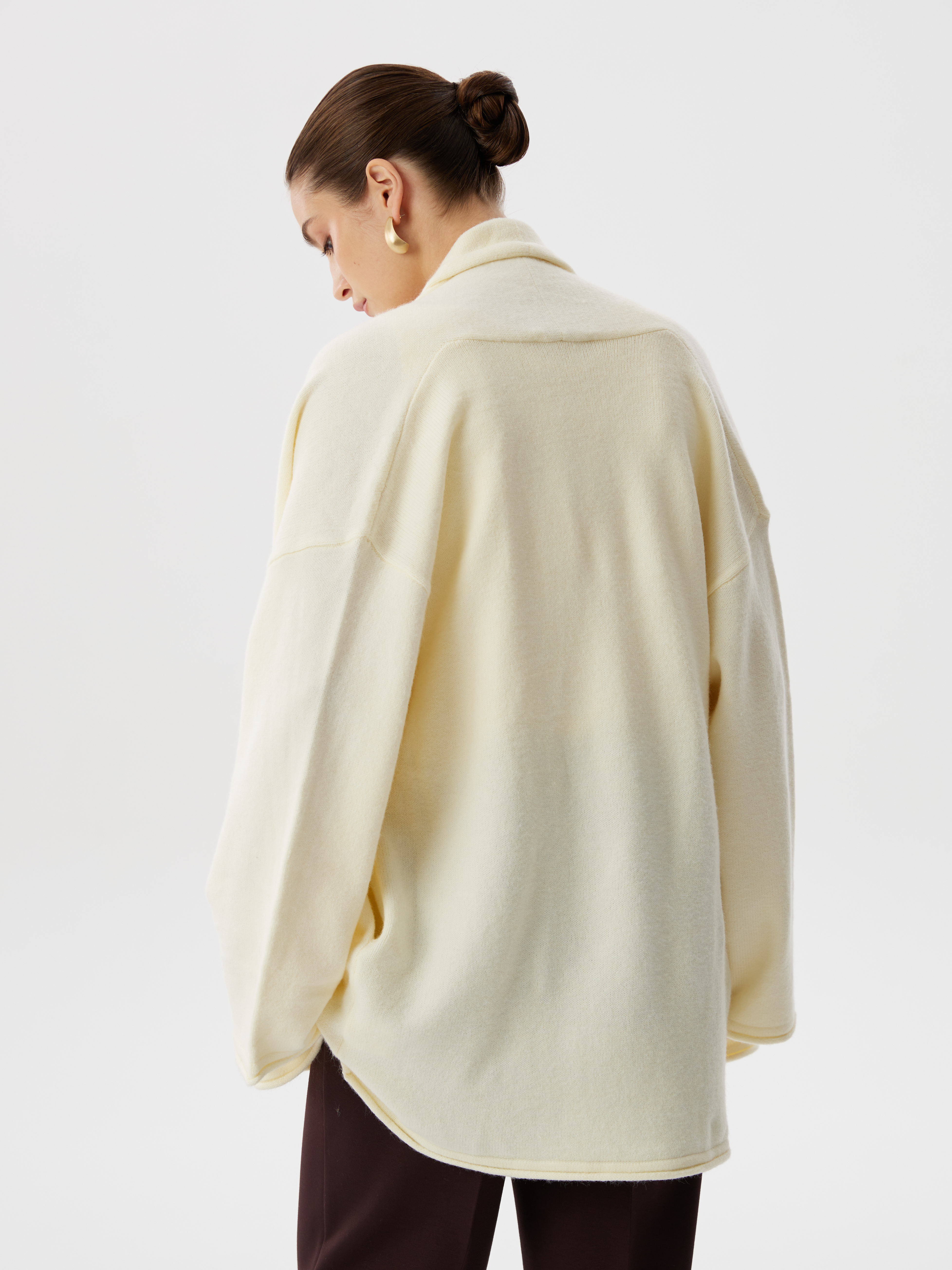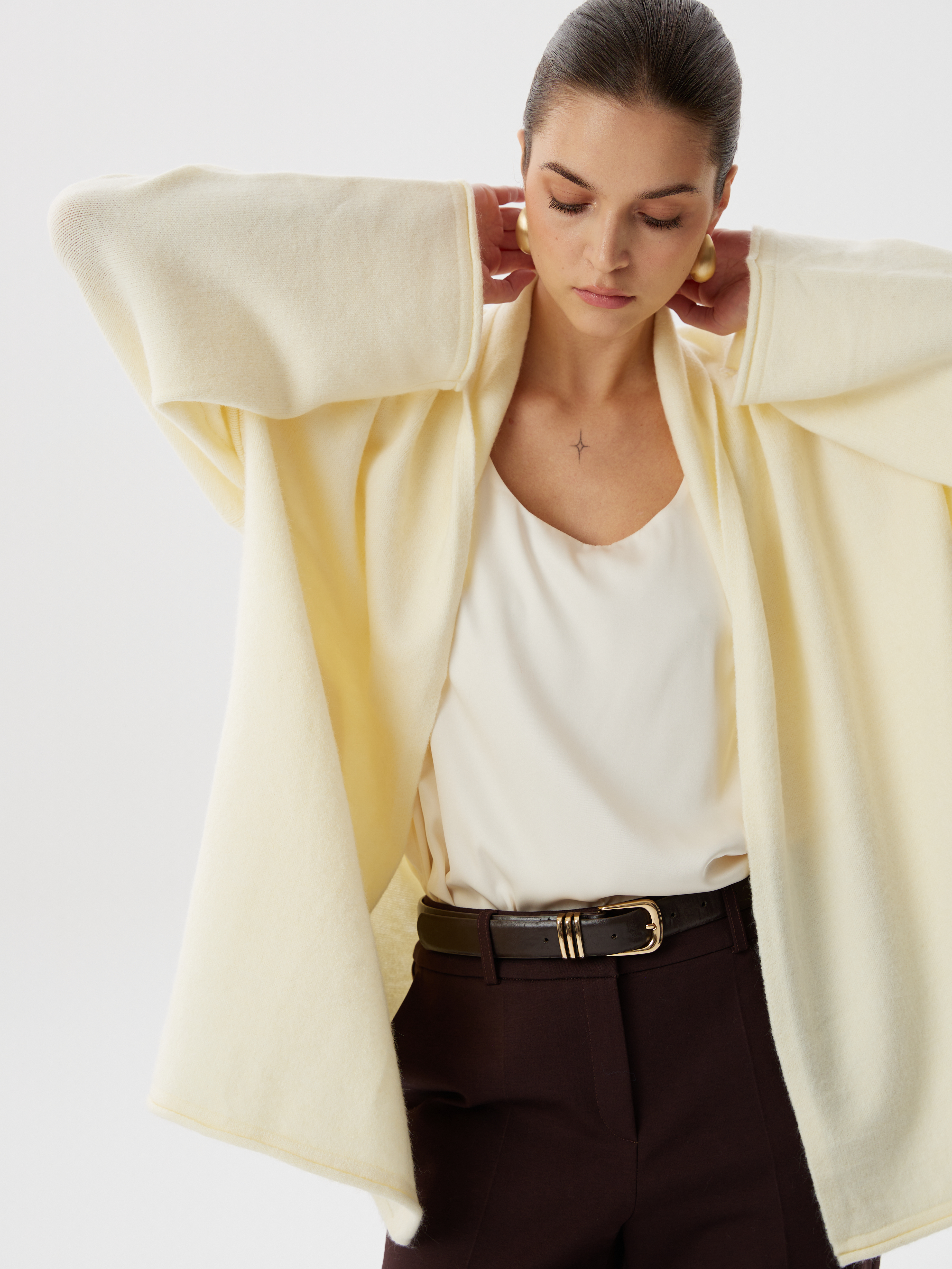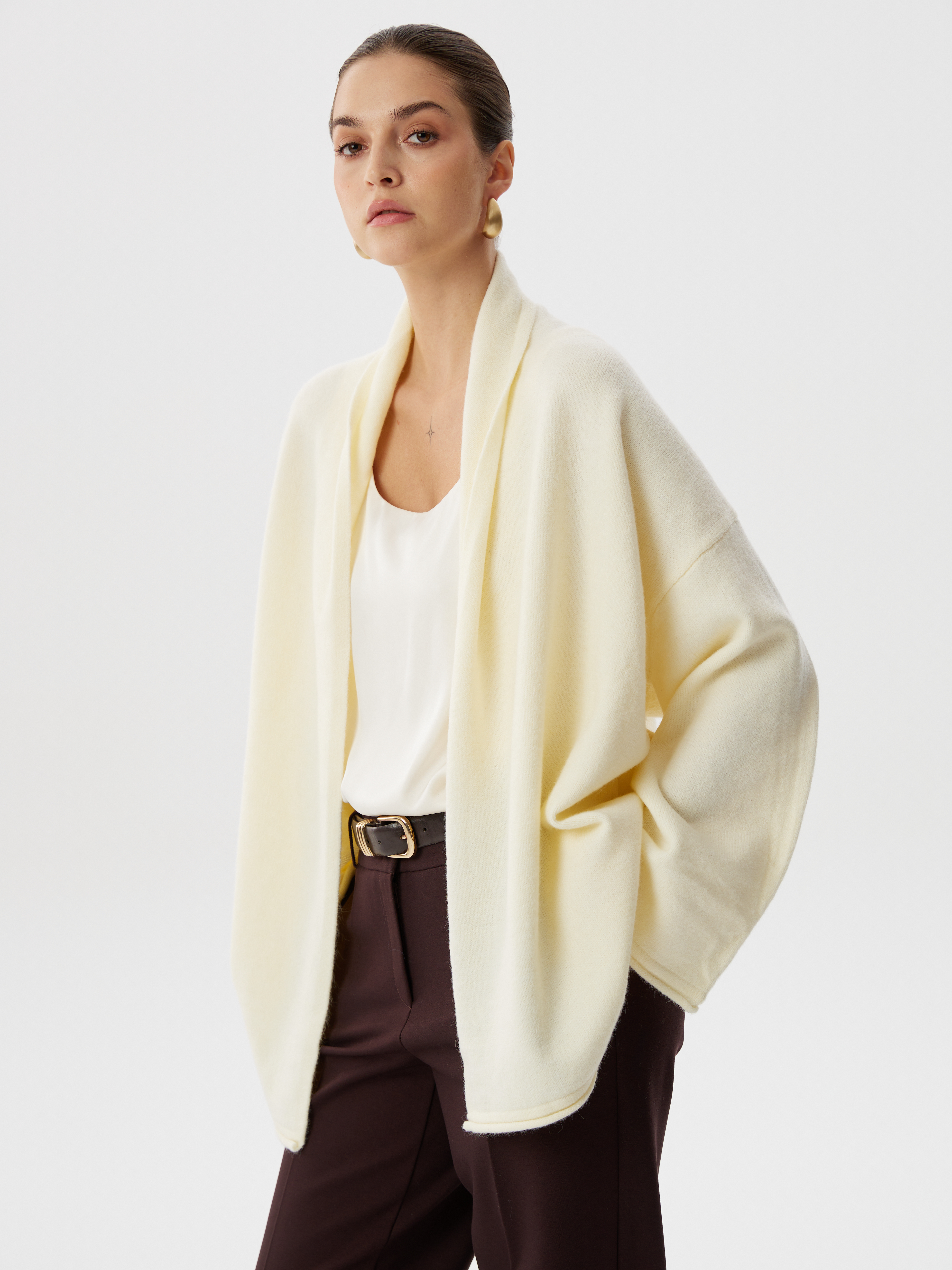 Кардиган из вязаного трикотажа с добавлением шерсти выполнен в универсальном молочном оттенке, который гармонично сочетается с любой цветовой гаммой гардероба. Мягкая и пластичная фактура трикотажа с шерстью обеспечивает комфорт и приятные тактильные ощущения, а спущенная линия плеч добавляет расслабленности и современного настроения. Свободный силуэт и отсутствие застёжки создают эффект лёгкости и подчёркивают непринуждённый стиль модели. Кардиган легко комбинируется с джемперами, футболками и платьями, становясь базовым элементом многослойных образов на каждый день.