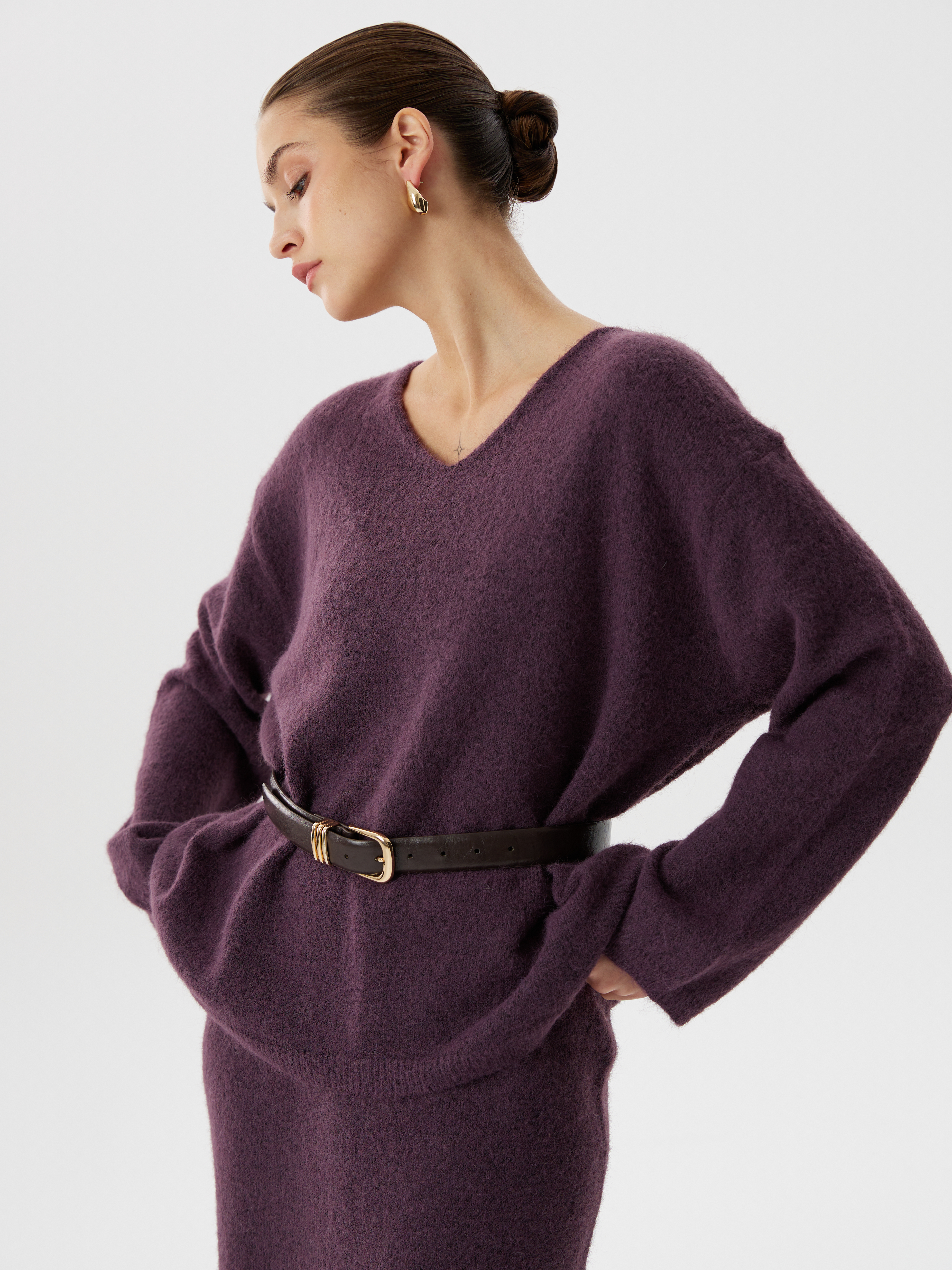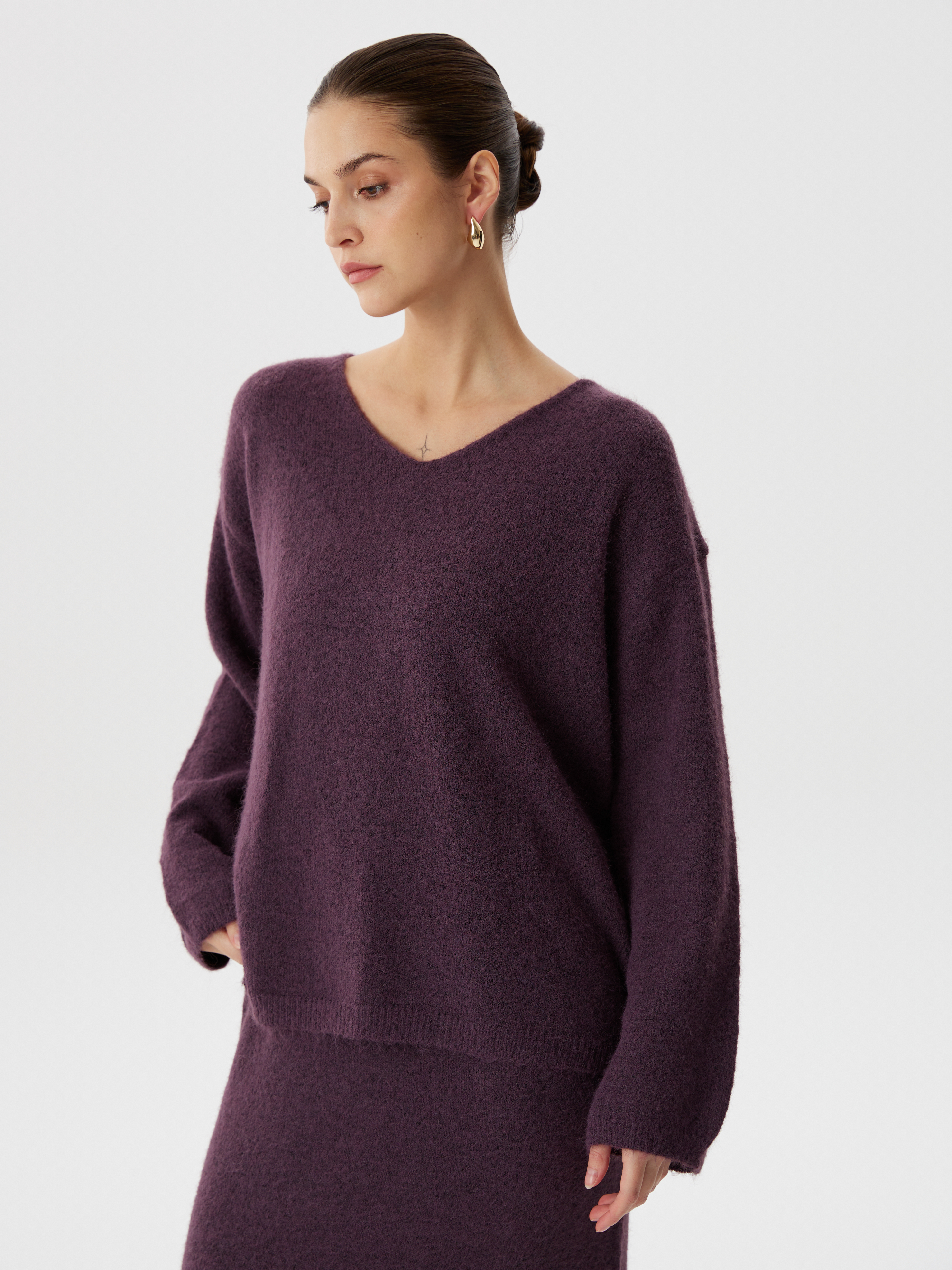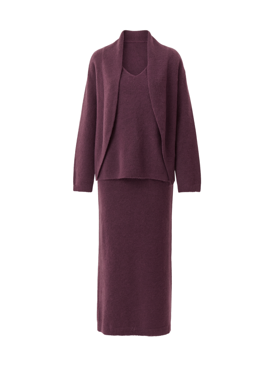 Комплект из вязаного трикотажа с шерстью: юбка миди, джемпер классического кроя и косынка. Мягкая фактура, комфорт и элегантность в одном образе. Универсальное решение для стильного повседневного гардероба.