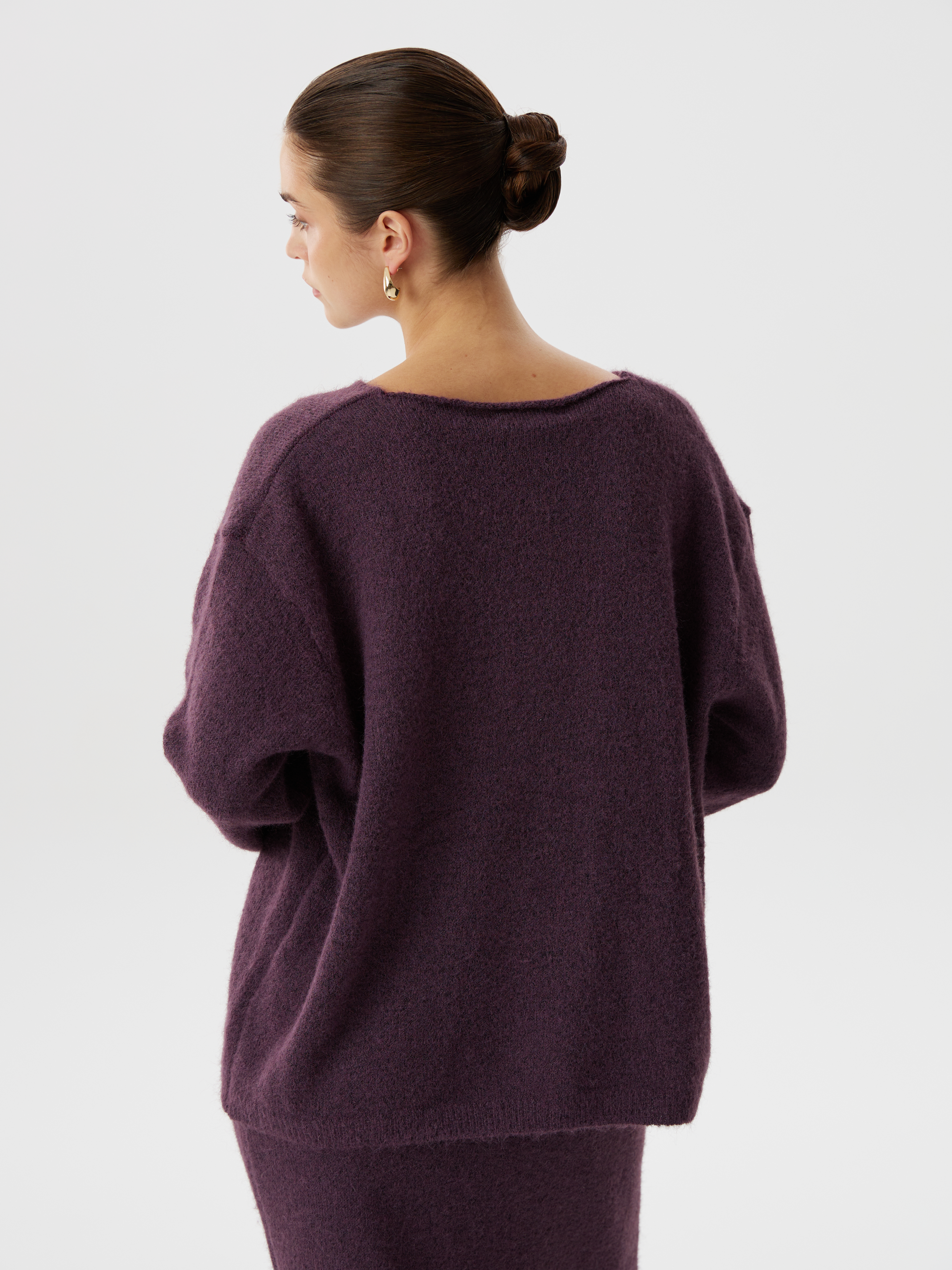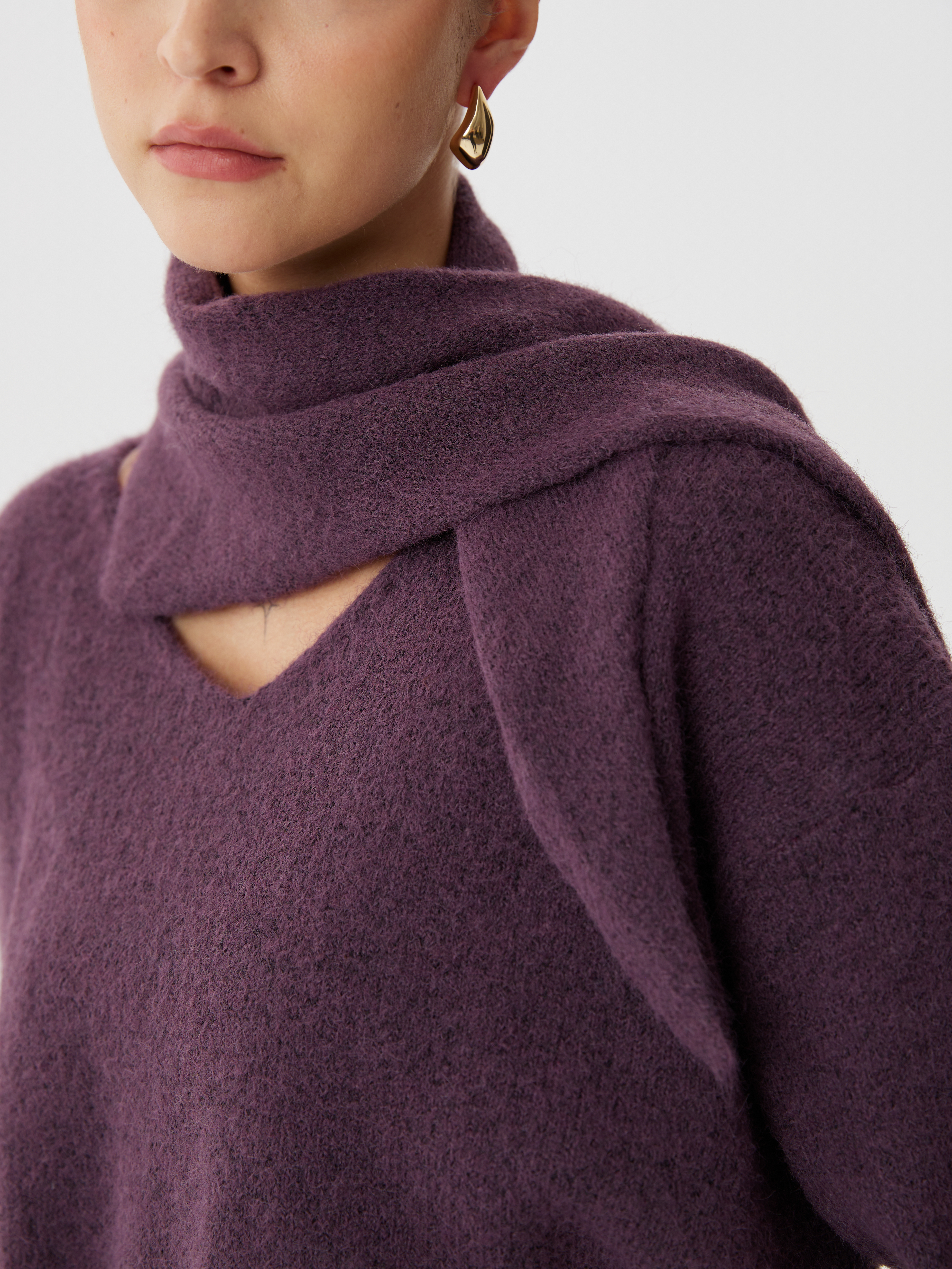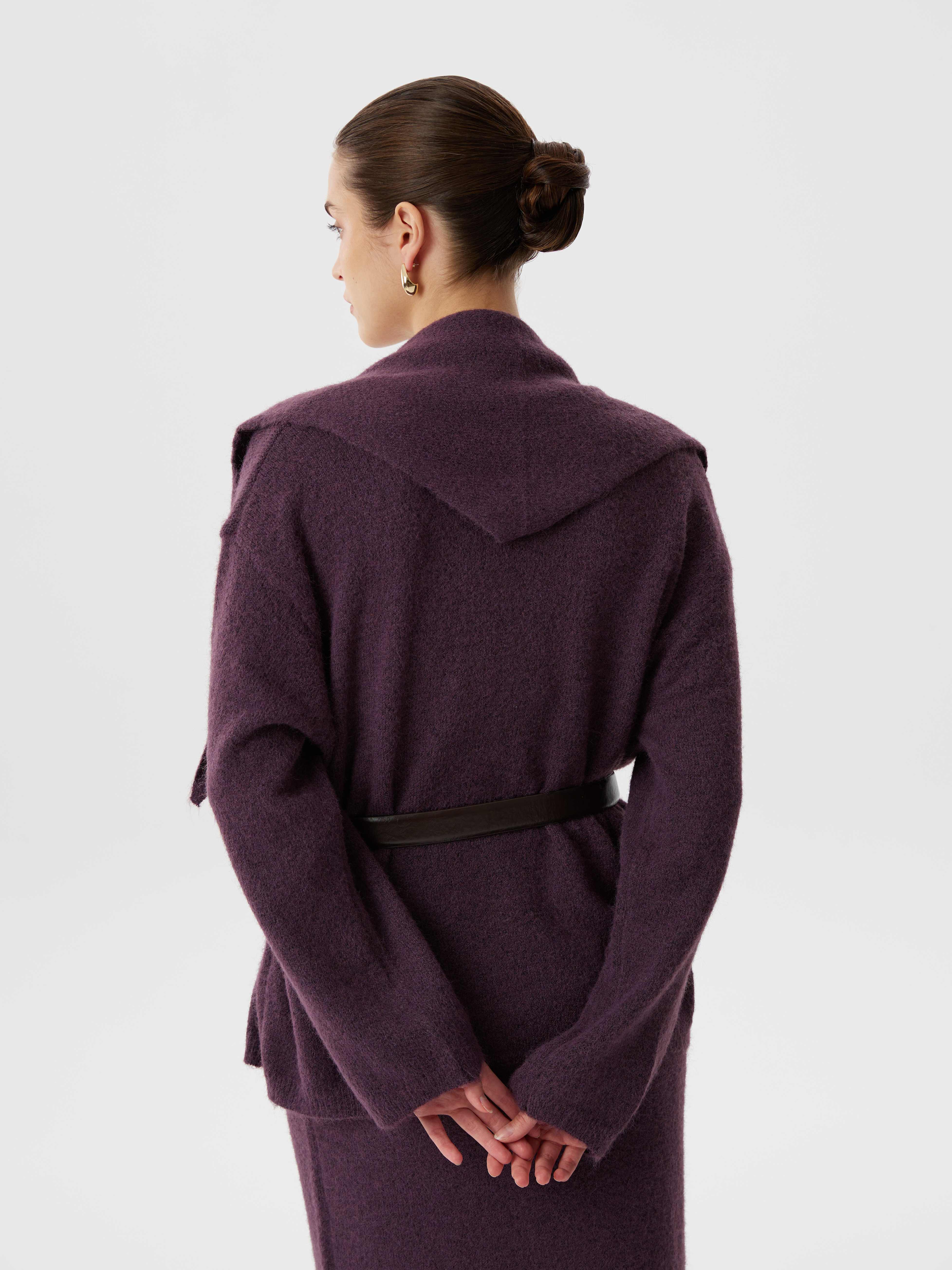 Комплект из вязаного трикотажа с шерстью: юбка миди, джемпер классического кроя и косынка. Мягкая фактура, комфорт и элегантность в одном образе. Универсальное решение для стильного повседневного гардероба.