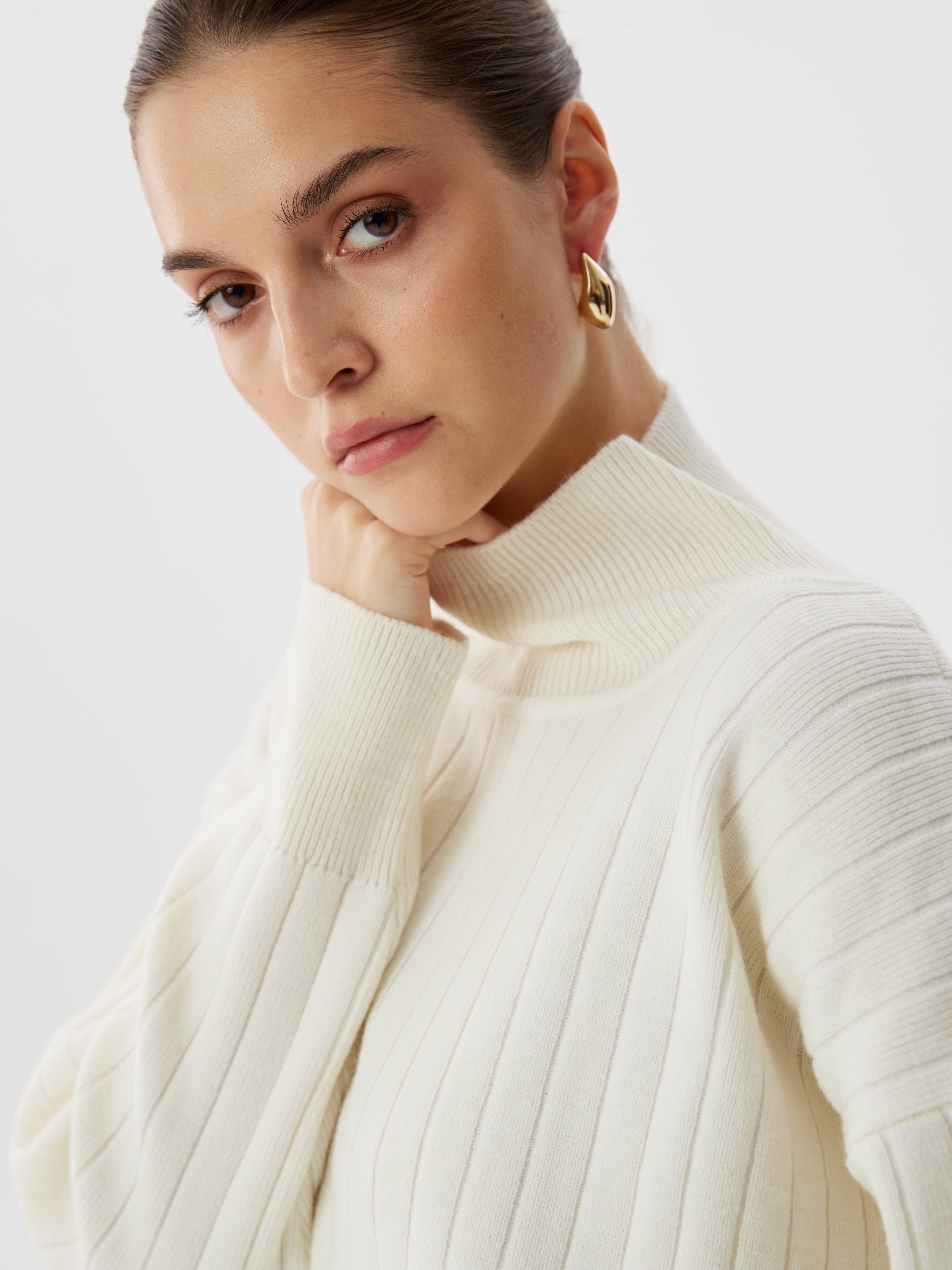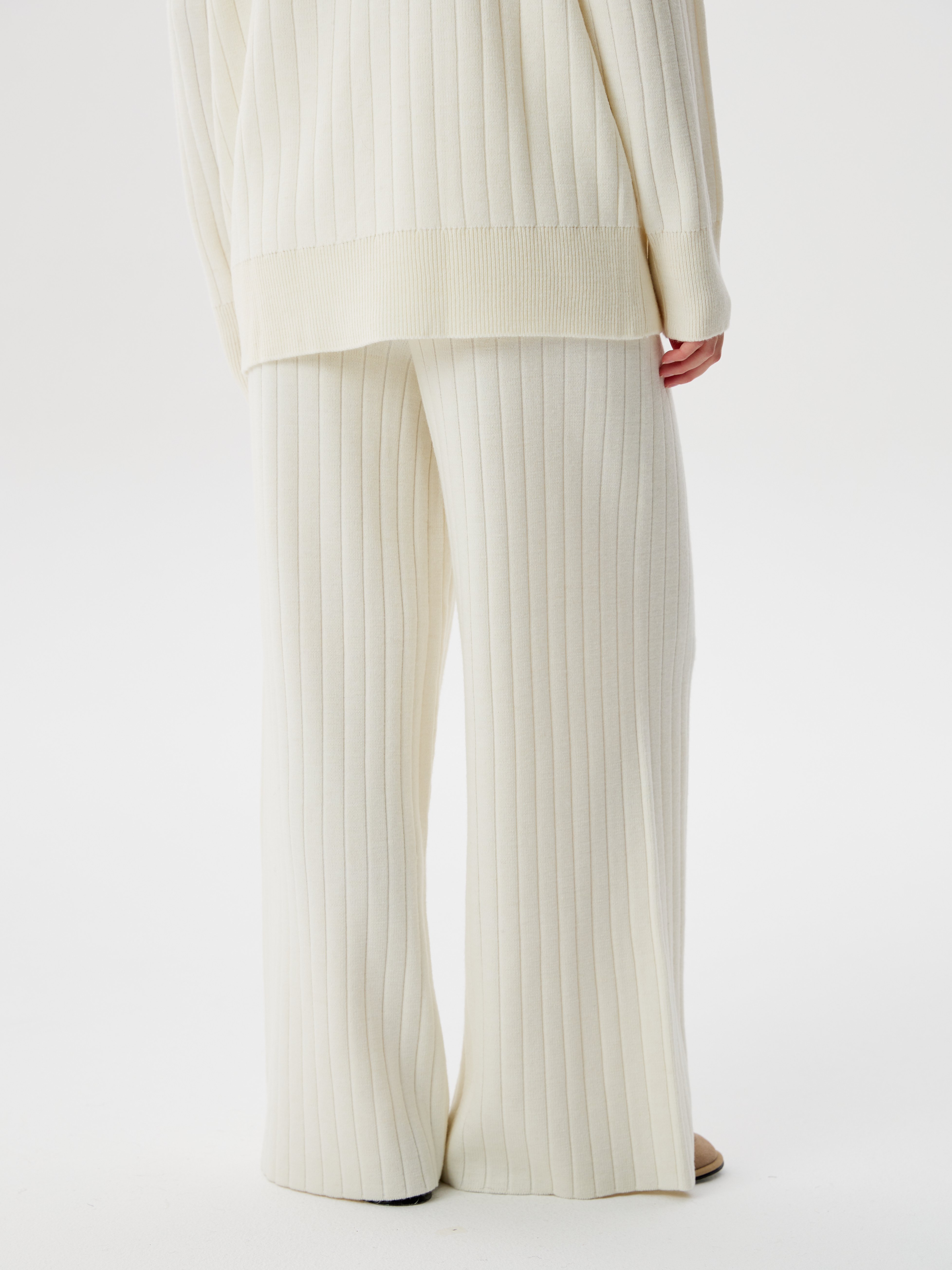 Комплект из вязаного трикотажа с добавлением шерсти в универсальном молочном оттенке сочетает уют, комфорт и актуальность силуэтов. Джемпер свободного кроя со спущенной линией плеч и горловиной-стойкой мягко драпируется, создавая расслабленный и современный образ. Брюки прямого силуэта выполнены в выразительный широкий рубчик, который визуально вытягивает и стройнит фигуру. Благодаря специальному переплетению пряжи, изделия устойчивы к деформации — они не вытягиваются и сохраняют форму даже при активной носке. Этот трикотажный костюм станет стильной и практичной основой осенне-зимнего гардероба, идеально подходя как для домашнего комфорта, так и для прогулок или поездок.