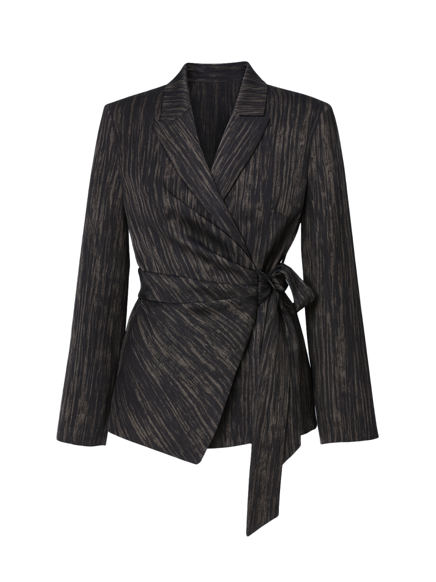 Жакет приталенного силуэта с асимметричным краем борта выполнен из черного атласа с благородным золотистым напылением в виде деликатной полоски. Ткань пластичная и мягкая, с деликатным мерцанием, которое эффектно подчеркивает вечерний характер модели. Жакет дополнен подкладкой из поливискозы для комфортной посадки. Складки на линии талии создают акцент на фигуре, визуально вытягивая силуэт. Асимметрия борта добавляет динамики и современной выразительности, а завязка на поясе обеспечивает индивидуальную посадку и комфорт при носке. Этот вечерний жакет с акцентом на талию станет ярким элементом новогоднего или торжественного образа, сочетая элегантность и удобство, например с брюками 2.5.2-260 из капсулы.