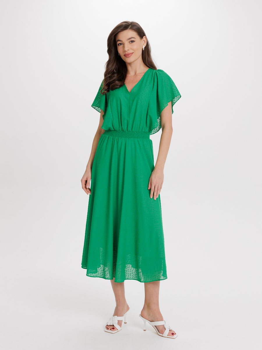 Платье из фактурного деворе цвета сочной зелени в романтичной стилистике. Верх полуприлегающий, юбка с расклешением. В конструктивные рельефы на лифе интегрированы воланы. Они выполняют роль рукава, прикрывая руки. На талии эластичные строчки в несколько рядов. Модель на натуральной подкладочной ткани. Длина миди.