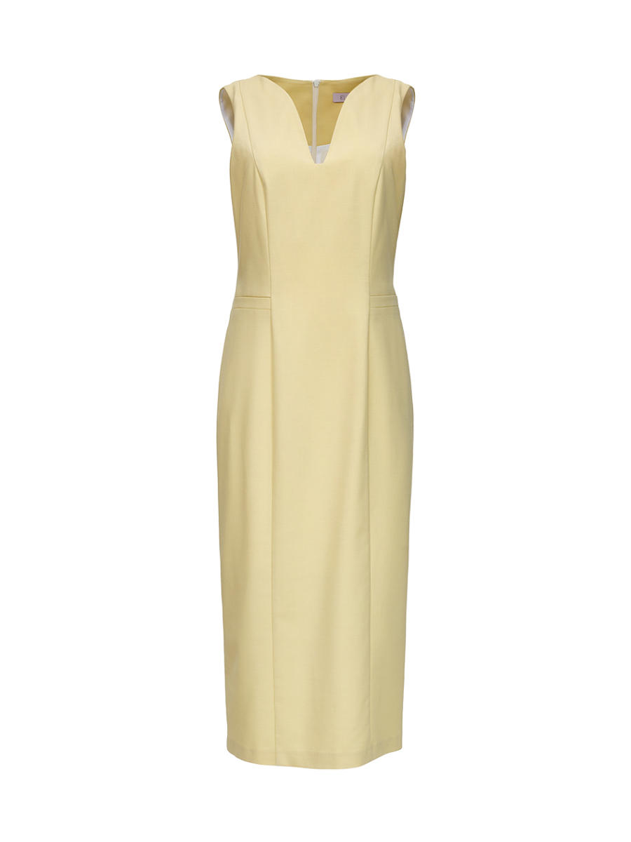 Изысканное платье приталенного силуэта. Длина миди. Фигурная линия выреза горловины изящно подчеркивает декольте. Вертикальные рельефы визуально вытягивают силуэт.Модель выполнена из эффектной костюмной ткани в комплиментарном цвете лемонграсс. Платье на комфортной подкладке.