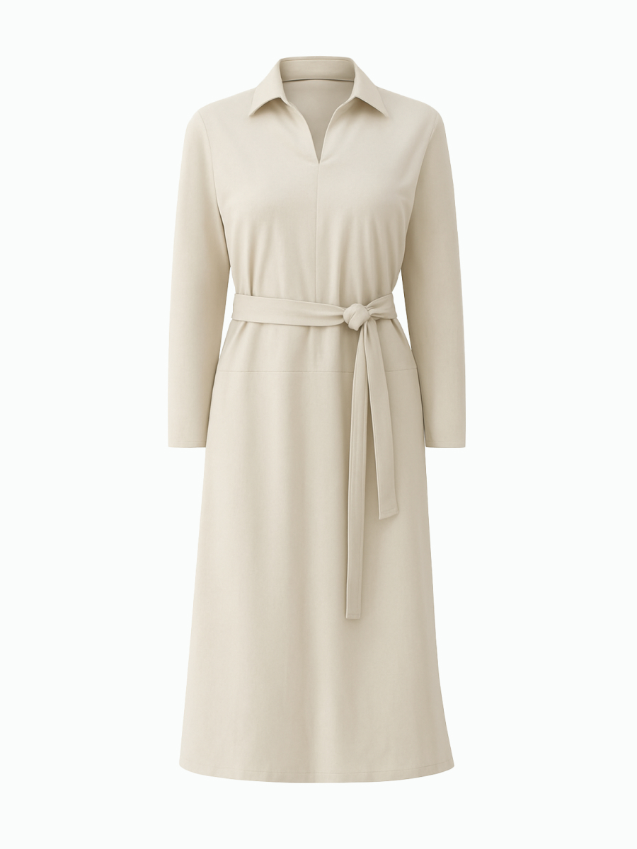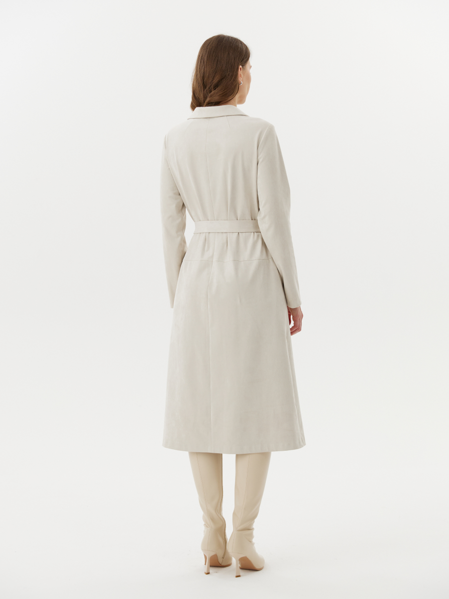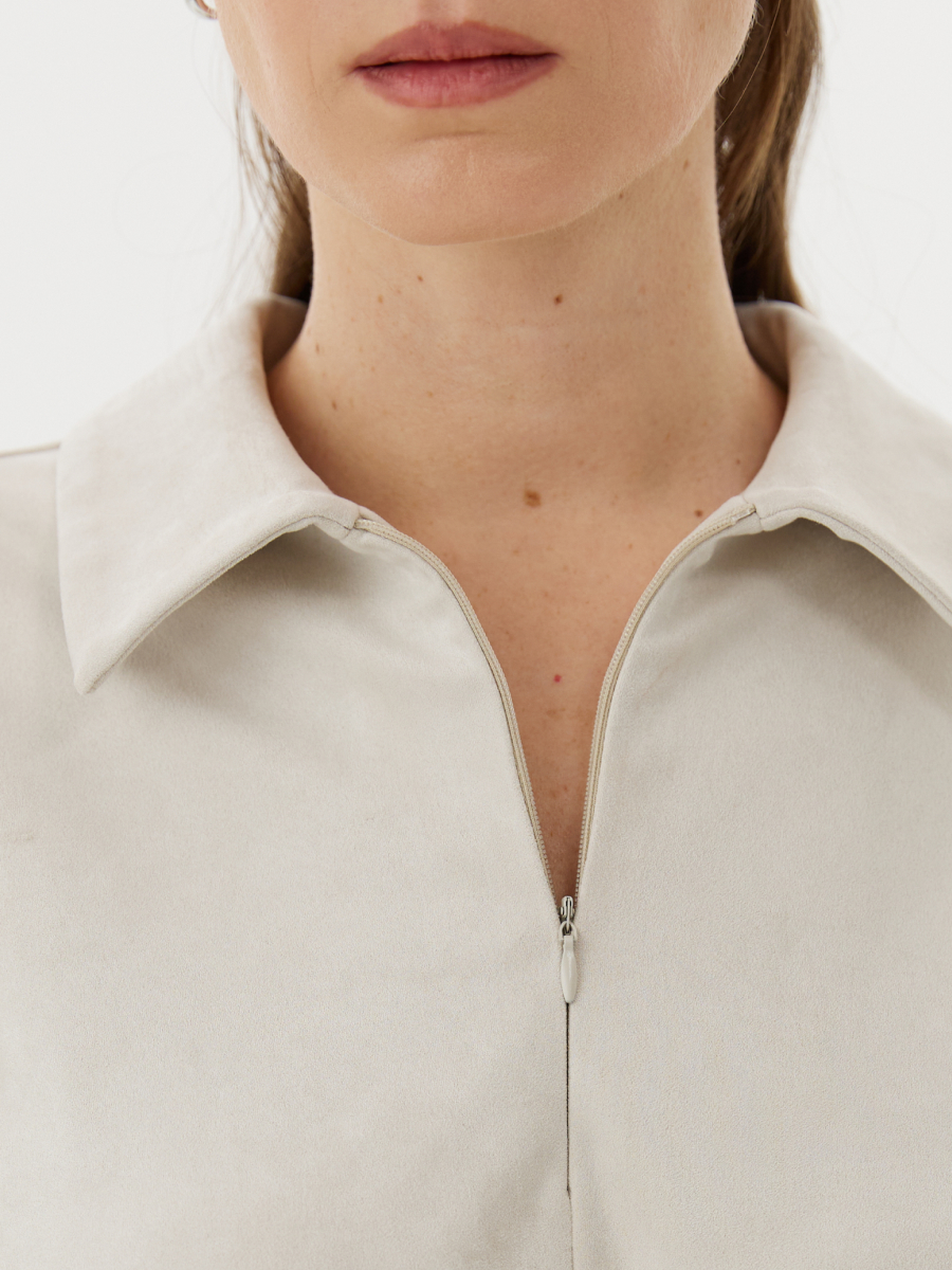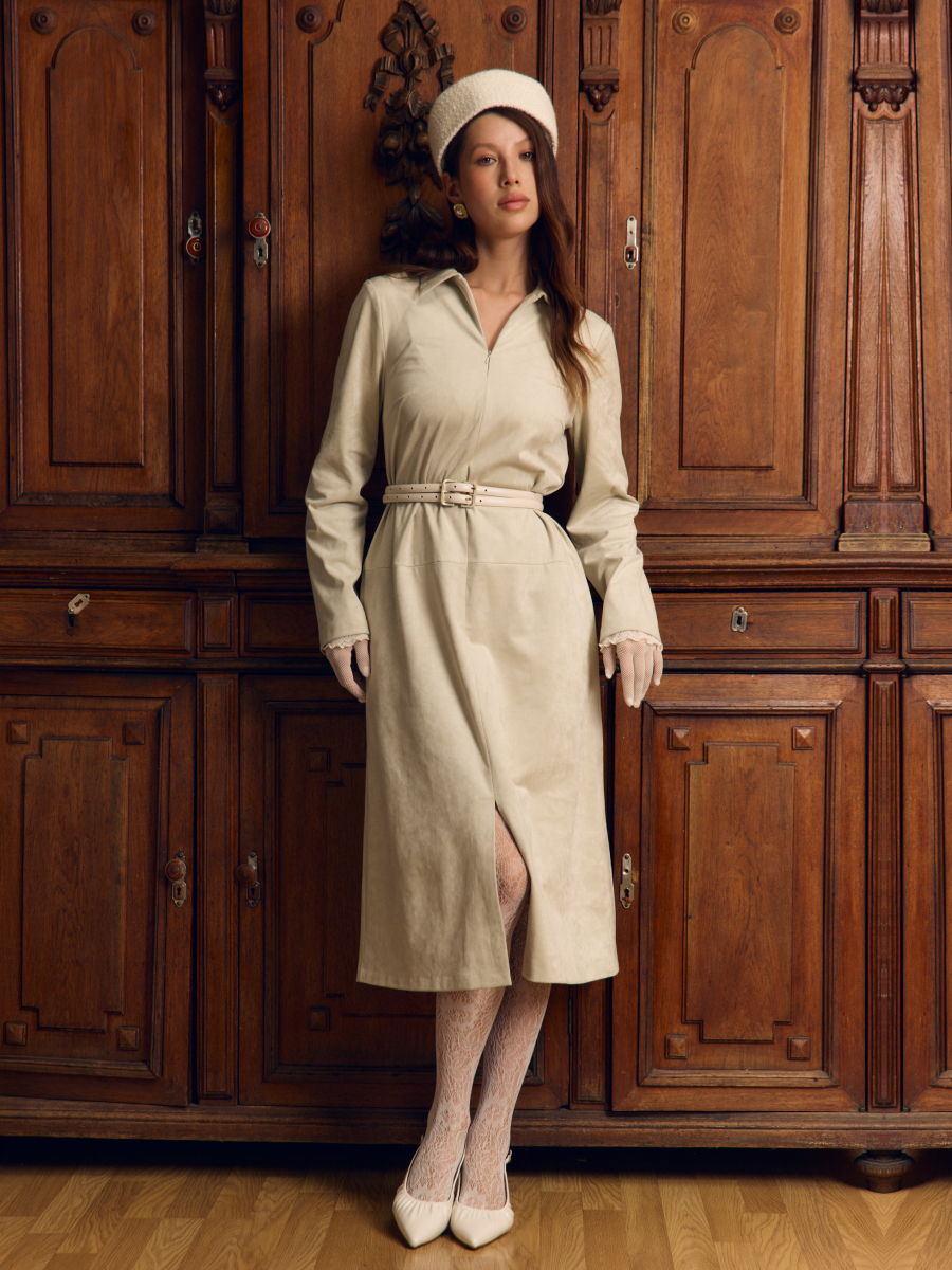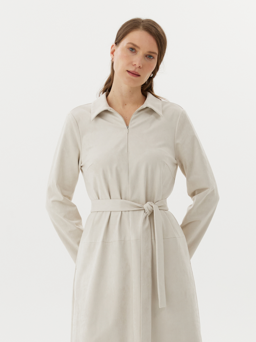 Платье трапециевидного силуэта из мягкой и тактильно приятной замши — универсальный вариант для создания женственного и лаконичного образа. Элегантный оттенок белый виноград подчёркивает утончённость и свежесть модели. Рубашечный воротник добавляет чёткости и графичности, а потайная молния в центральном шве спинки обеспечивает комфортное надевание, не нарушая чистоту линий. Карманы в боковых швах делают модель практичной и удобной. Съёмный пояс позволяет варьировать образ: носить платье свободным или подчёркнуть талию. Пластичная замша мягко драпируется, сохраняя форму силуэта и подчёркивая его женственность.