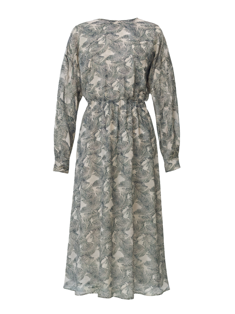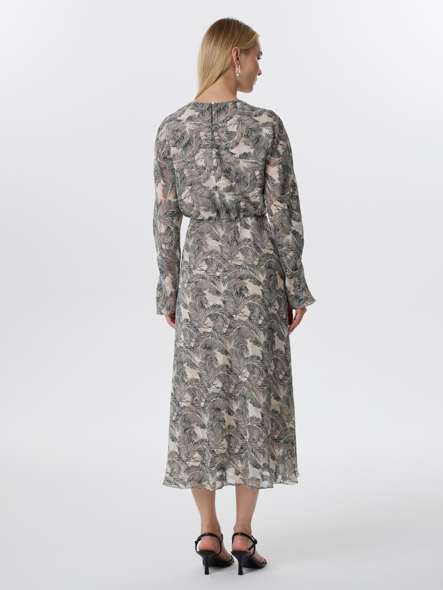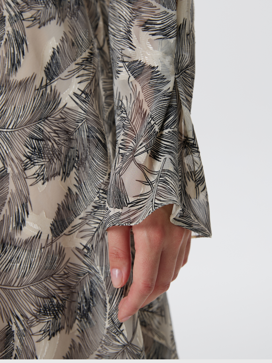 Платье из тонкого шифона с жаккардовой фактурой оформлено изящным принтом в виде нежных воздушных перьев в молочной гамме. Ткань струится при движении, создавая легкий и романтичный образ. Модель дополнена подкладкой из хлопка, что делает платье комфортным и непрозрачным. Рукава кимоно подчеркивают женственность и мягкость силуэта. Летящая юбка из шифона добавляет нарядности, визуально удлиняя фигуру. Приталенность обеспечивается широкой резинкой по талии, которая подчеркивает силуэт, мягко фиксирует платье по фигуре и дарит комфорт в течение дня. Это романтичное платье из шифона с легкой посадкой и воздушной юбкой идеально подойдет для торжественных случаев, встреч и особых моментов, где важны элегантность и комфорт.