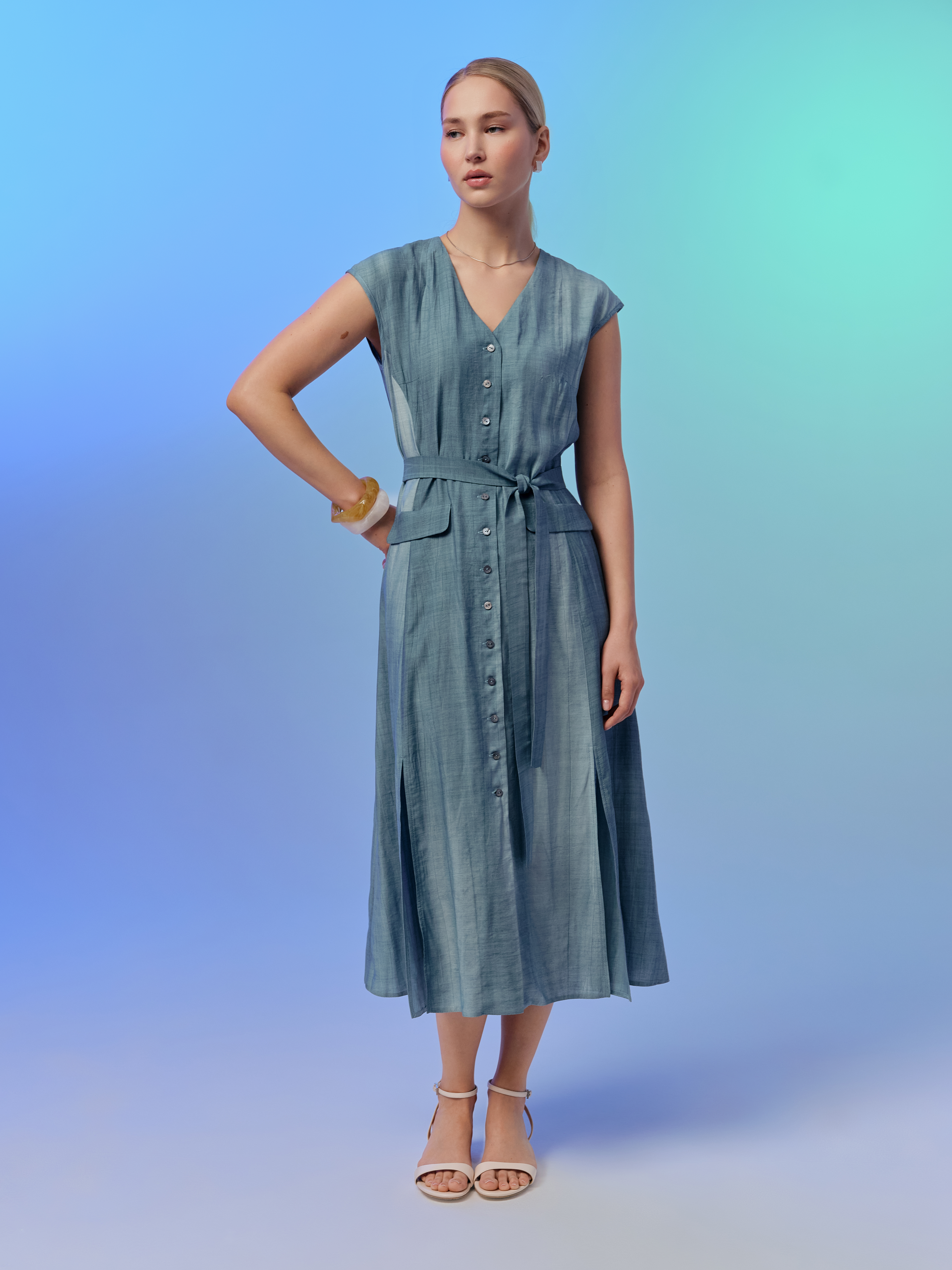 Платье миди трапециевидного силуэта из натуральной ткани на основе тенселя, вискозы и конопли — лёгкое, дышащее и идеально подходящее для тёплого сезона. Материал с фактурой, имитирующей крэш-эффект, придаёт изделию динамику и подчёркивает природную текстуру. Модель с V-образным вырезом, застёжкой на пуговицы по переду и разрезами в рельефах визуально вытягивает силуэт. Съёмный пояс позволяет формировать приталенный силуэт, а накладные карманы с клапанами добавляют функциональности. Особую выразительность платью придаёт нежный градиент оттенков морской волны — эффектный цветовой переход, освежающий образ и подчёркивающий его женственность. Платье выполнено без подкладки, что делает его особенно лёгким и приятным к телу — идеальный вариант для летнего гардероба, отпуска или городской повседневности. Это платье из тенселя, вискозы и конопли легко сочетается с льняными жакетами, жакетами без подкладки, сандалиями, мюлями и базовыми аксессуарами.