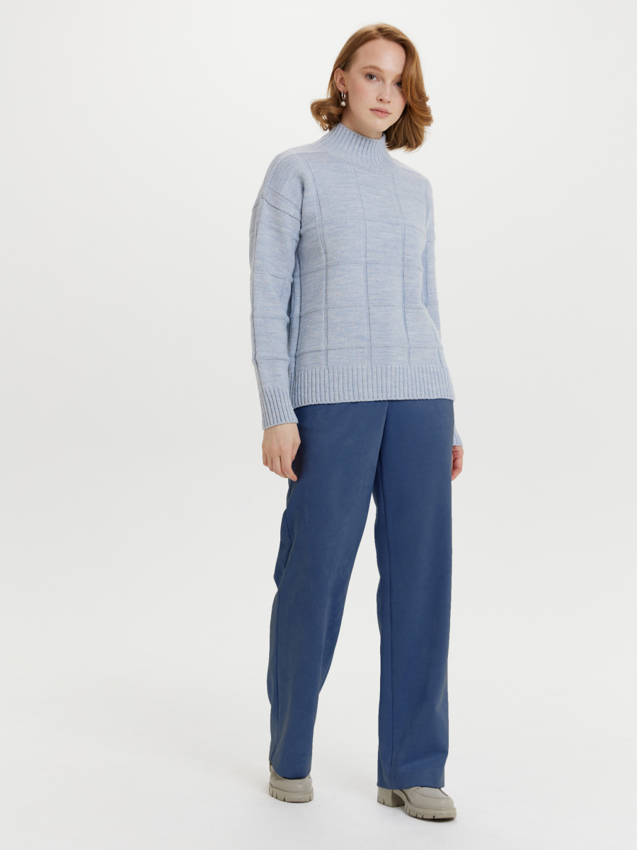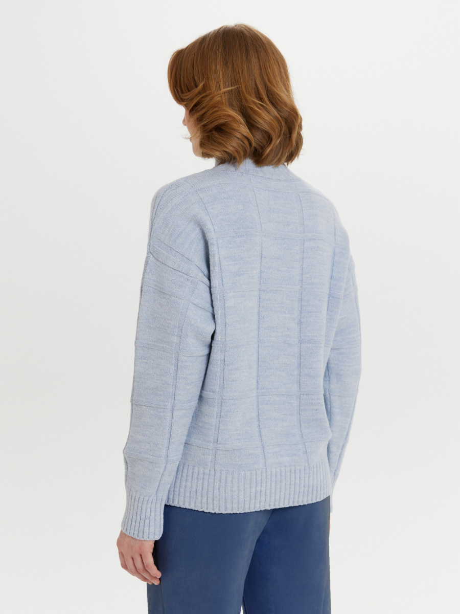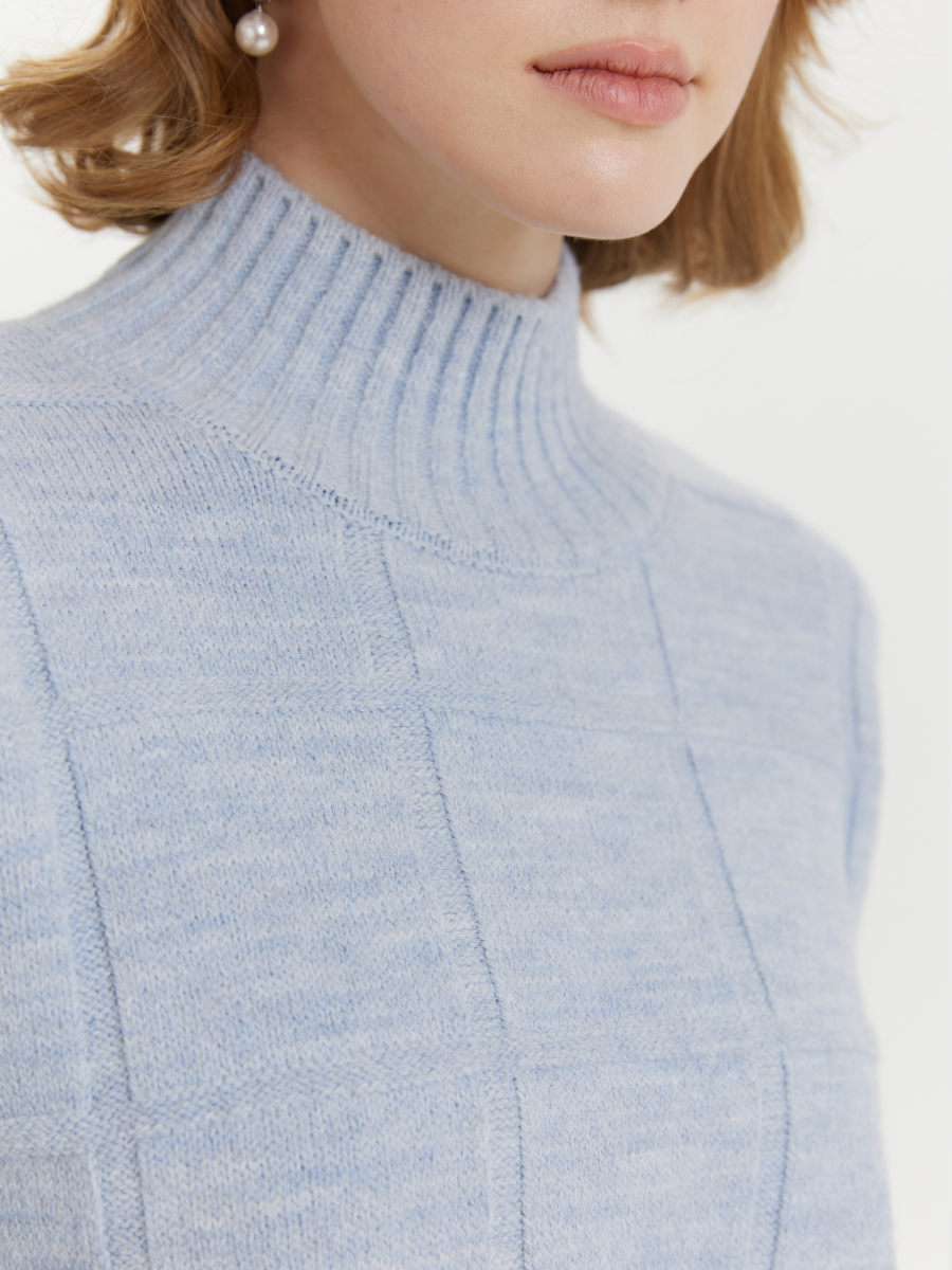 Свитер прямого силуэта со спущенной линией плеч и горловиной стойкой. Удлиненная модель с широкой клеткой. Клетка сделана с помощью переплетения, поэтому обладает небольшим рельефом. Свитер хорошо держит форму, но при этом остается мягким и приятным на ощупь.