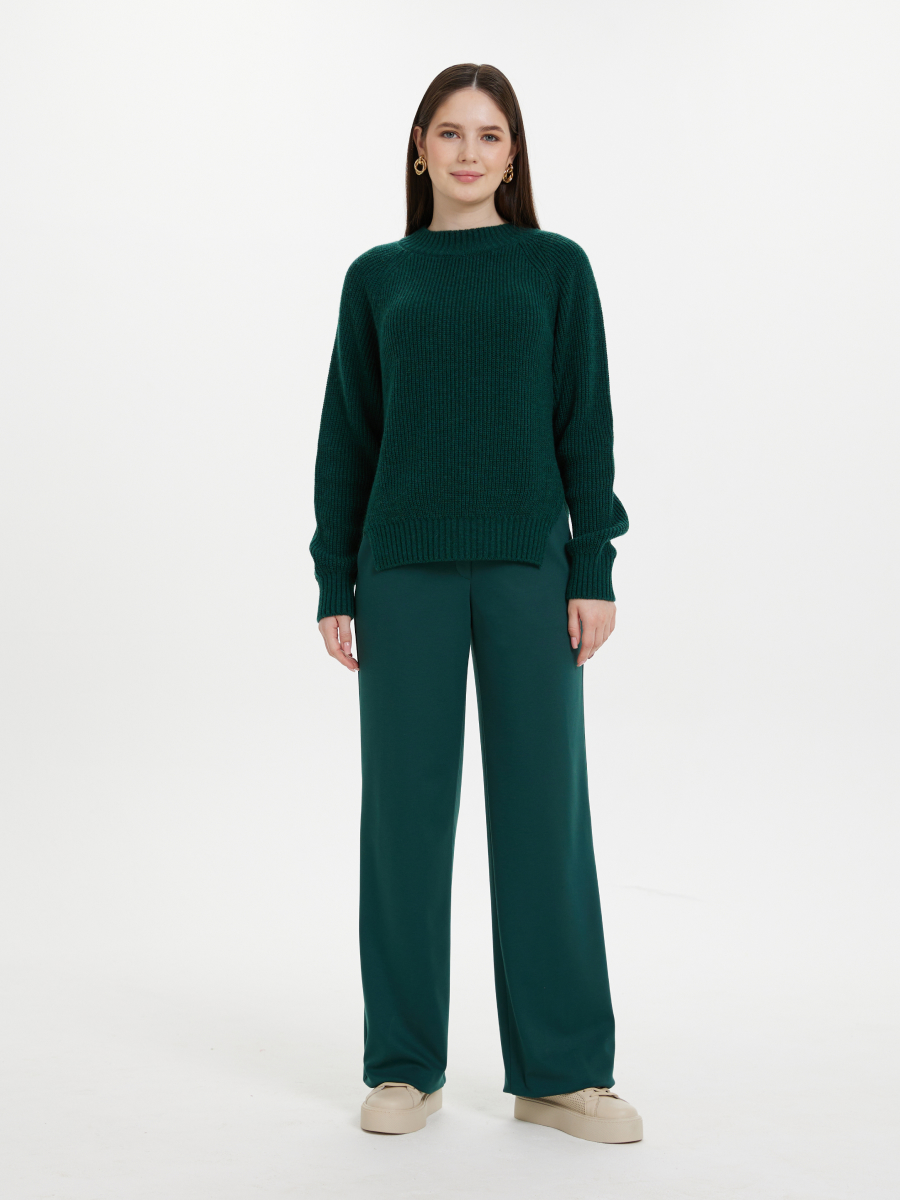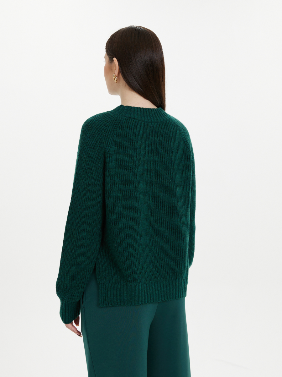 Объемный свитер с рукавом реглан и горловиной полустойкой,. Уютный и мягкий свитер с разрезами по боковым швам. Благодаря шерсти в составе пряжи изделие будет теплым и уютным компаньеном в холодные осенние дни. Декоративные полосы по реглану и разрерам визуально вытягивают силуэт.