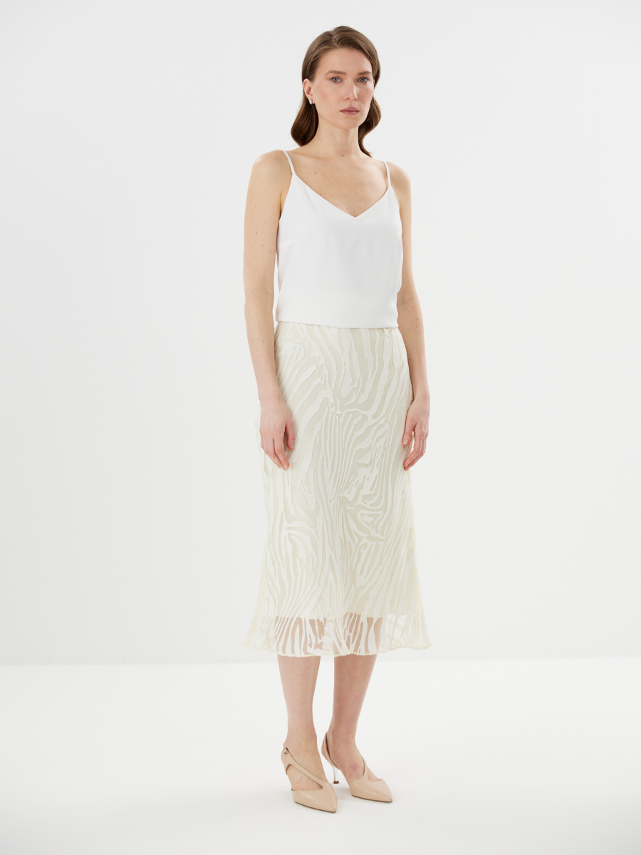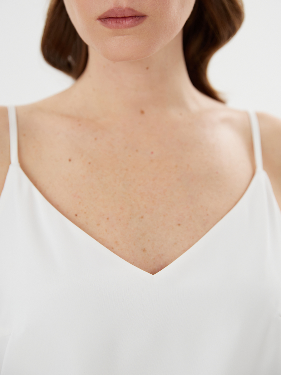 Базовый топ на регулируемых бретелях. Модель выполнена из комфортной тактильно приятной шелковистой ткани с деликатным атласным переливом в цвете "белая луна".
