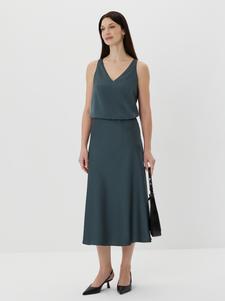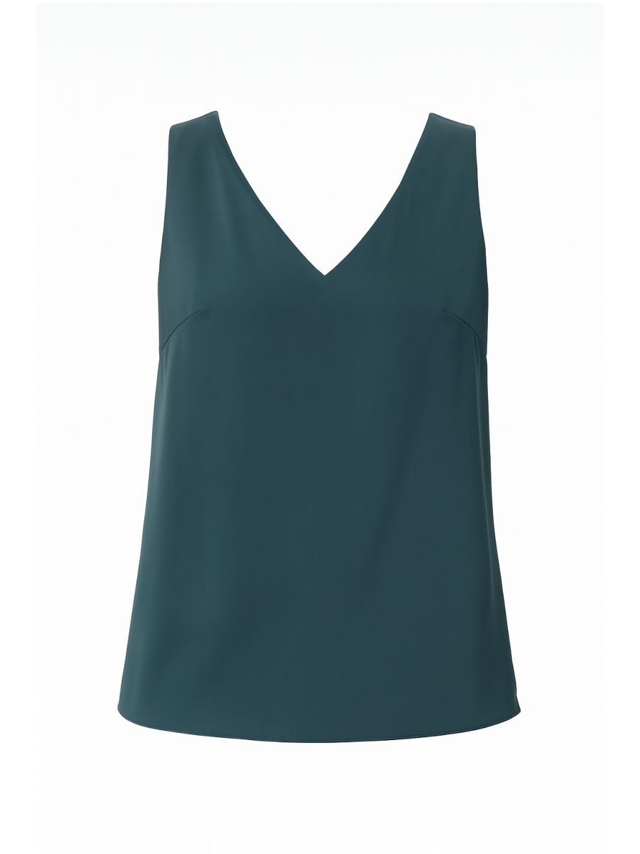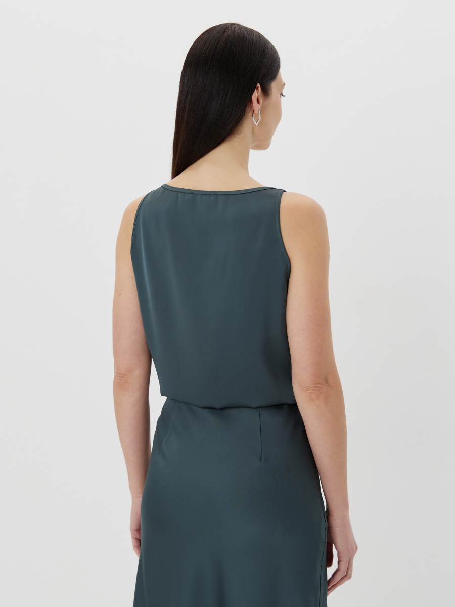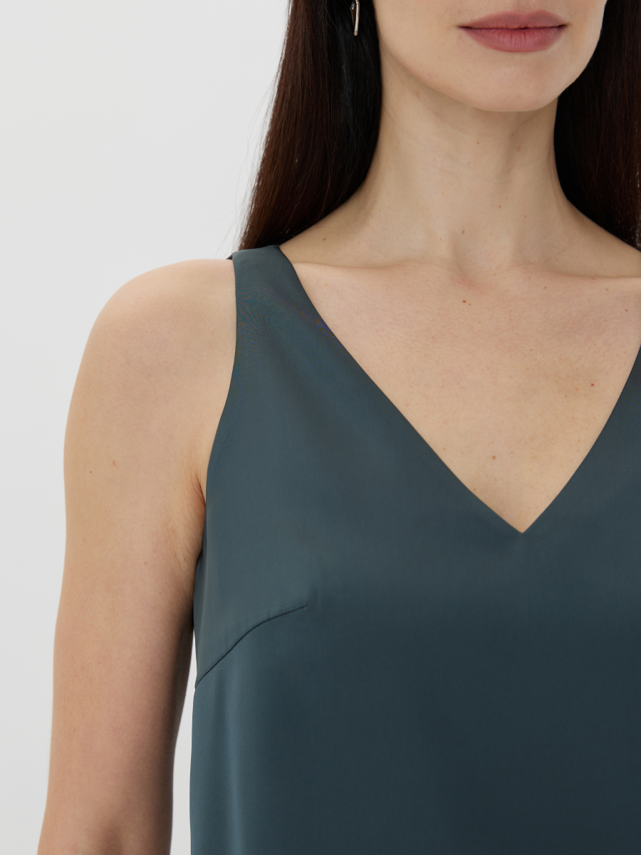 Базовый топ прямого силуэта с V-образным вырезом. Лаконичная модель длиной до линии бёдер выполнена из гладкого атласа в элегантном антично-зелёном оттенке. Топ сочетается с юбкой (2.4.3-854), формируя цельный и сбалансированный образ.