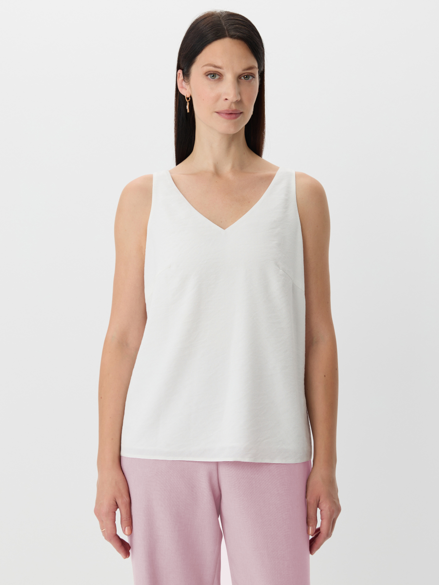 Топ с V-образным вырезом — базовая модель прямого силуэта, выполненная из мягкой, шелковистой вискозы в рубчик. Лаконичный крой и универсальная длина до линии бёдер делают этот топ идеальной основой для повседневных и офисных образов. Нежный оттенок жасмин придаёт образу лёгкость и свежесть, а трикотажная фактура в рубчик обеспечивает комфортную посадку и подчёркивает фигуру без обтягивания. Этот однотонный топ легко сочетается с брюками с высокой талией, юбками миди, шортами, а также идеально смотрится под жакет или кардиган. Подходит для офисного гардероба, прогулок и повседневного стиля.