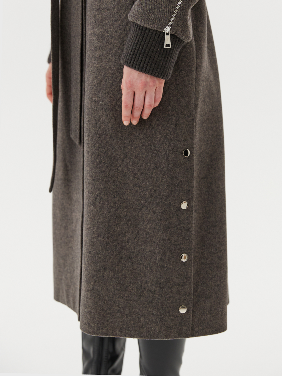 Это пальто — воплощение уверенности, благородства и безупречного вкуса. Выполненное из натуральной шерсти (80%), оно согревает не только физически, но и эстетически. Роскошный съёмный воротник из меха песца добавляет образу статусности и мягкого шарма, подчёркивая силу женственности в каждом движении. Глубокий коричневый цвет — это олицетворение земли, стабильности и внутреннего стержня. Лаконичный монопринт усиливает ощущение утончённости. Классический английский воротник с акцентными разрезами и рукав-реглан с декоративной молнией создают продуманный силуэт, в котором сочетаются комфорт, стиль и индивидуальность. Потайная застёжка на кнопки и пояс формируют чистые линии и подчёркивают фигуру, а боковые карманы и функциональные кнопки внизу боковых швов добавляют практичности и динамики. Подкладка обеспечивает комфорт в течение всего демисезонного периода. Это пальто для женщины, которая не боится быть в центре внимания, но выбирает говорить о себе через детали. Идеальный спутник для городской жизни, в ко