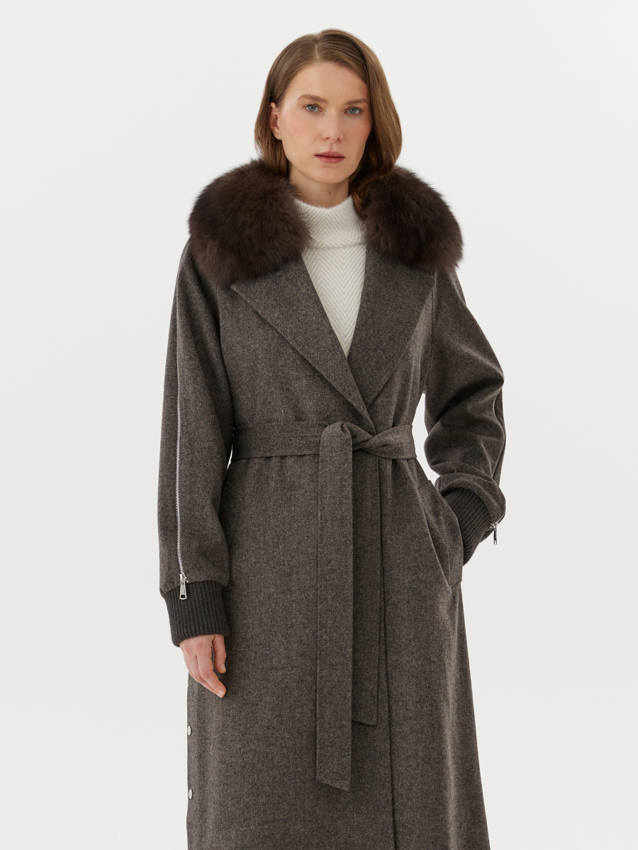 Демисезонное пальто из шерсти с воротником из меха песца в коричневом цвете