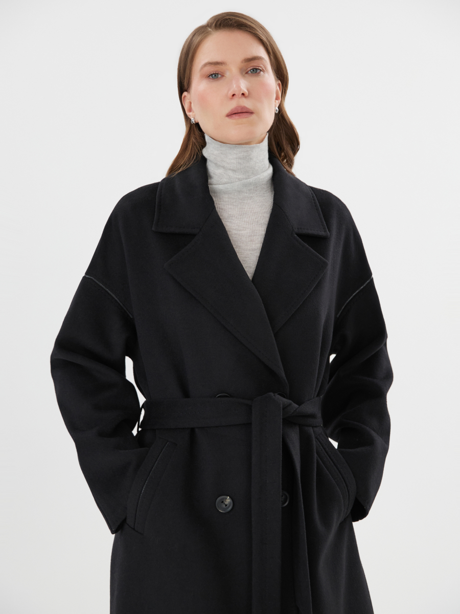 Элегантное пальто длины миди — изысканный выбор для женщины, уверенной в себе и в деталях своего стиля. Модель выполнена из шерсти (80%) с гладкой подкладкой и дополнена эффектными вставками из эко-кожи, которые добавляют образу современное звучание и выразительность. Классический английский воротник с актуальными разрезами подчеркивает статусность, а застёжка на пуговицы и пояс позволяют варьировать посадку — от расслабленного до подчеркнуто приталенного силуэта. Рукав-реглан обеспечивает мягкую линию плеч и удобство в движении. Боковые карманы делают модель практичной и удобной для повседневного использования. Черный цвет подчёркивает универсальность пальто, легко комбинируется с гардеробом в нейтральной и насыщенной гамме. Современное прочтение городской классики, эта модель идеально подойдёт для деловых встреч, прогулок и ежедневных маршрутов в ритме мегаполиса.
