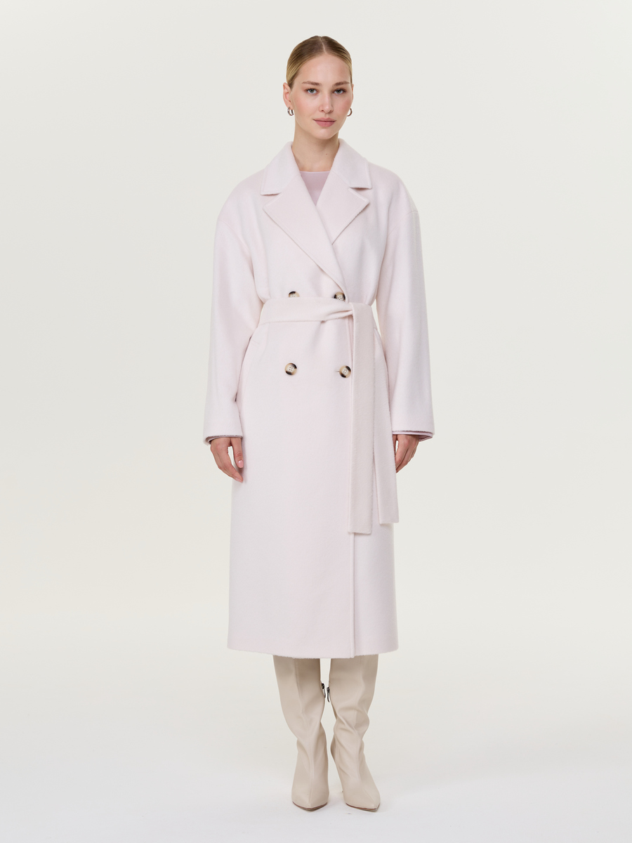 Пальто свободного прямого силуэта с поясом. Карман листочка. Плечо спущено, рукав рубашечного кроя. Воротник классический с лацканом. По боковым швам разрезы. Застежка двубортная на пуговицы. Длина изделия 120 см.