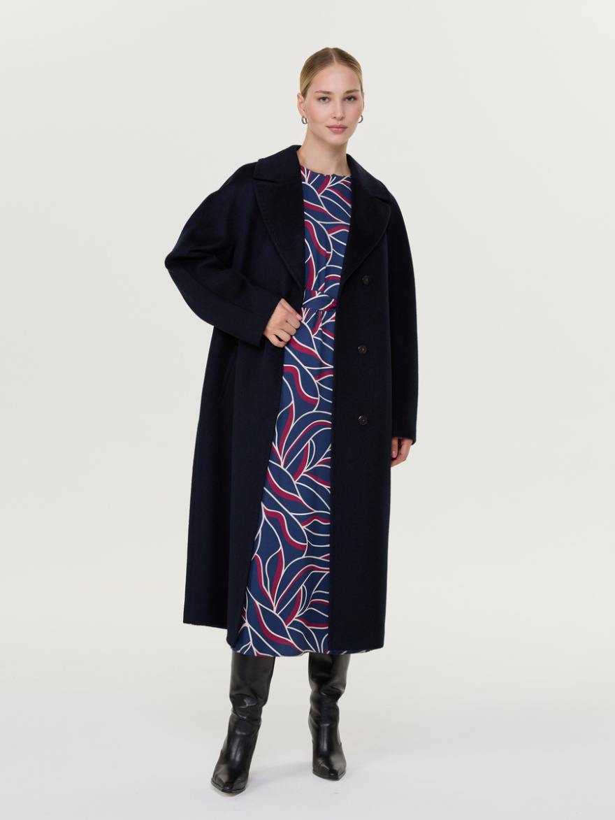 Длинное пальто с поясом, прямого силуэта с цельнокроеным рукавом. Английский воротник с лацканом и застежка на кнопки. Прорезные карманы с листочкой . По спинке средний шов без шлицы. По краю борта, воротнику и лацканам проложена строчка "ручной стежок". Пальто дополнено поясом. Длина рукава от линии горловины 75 см.