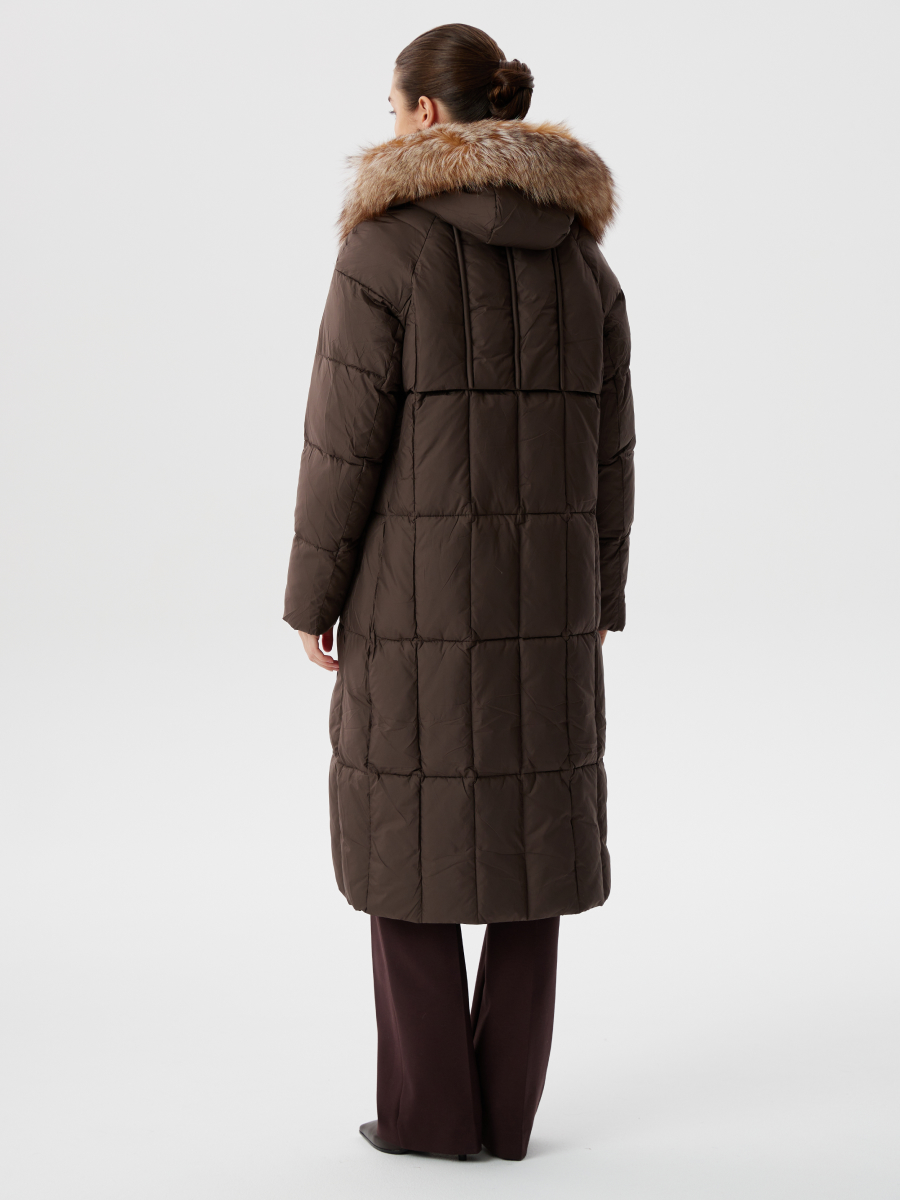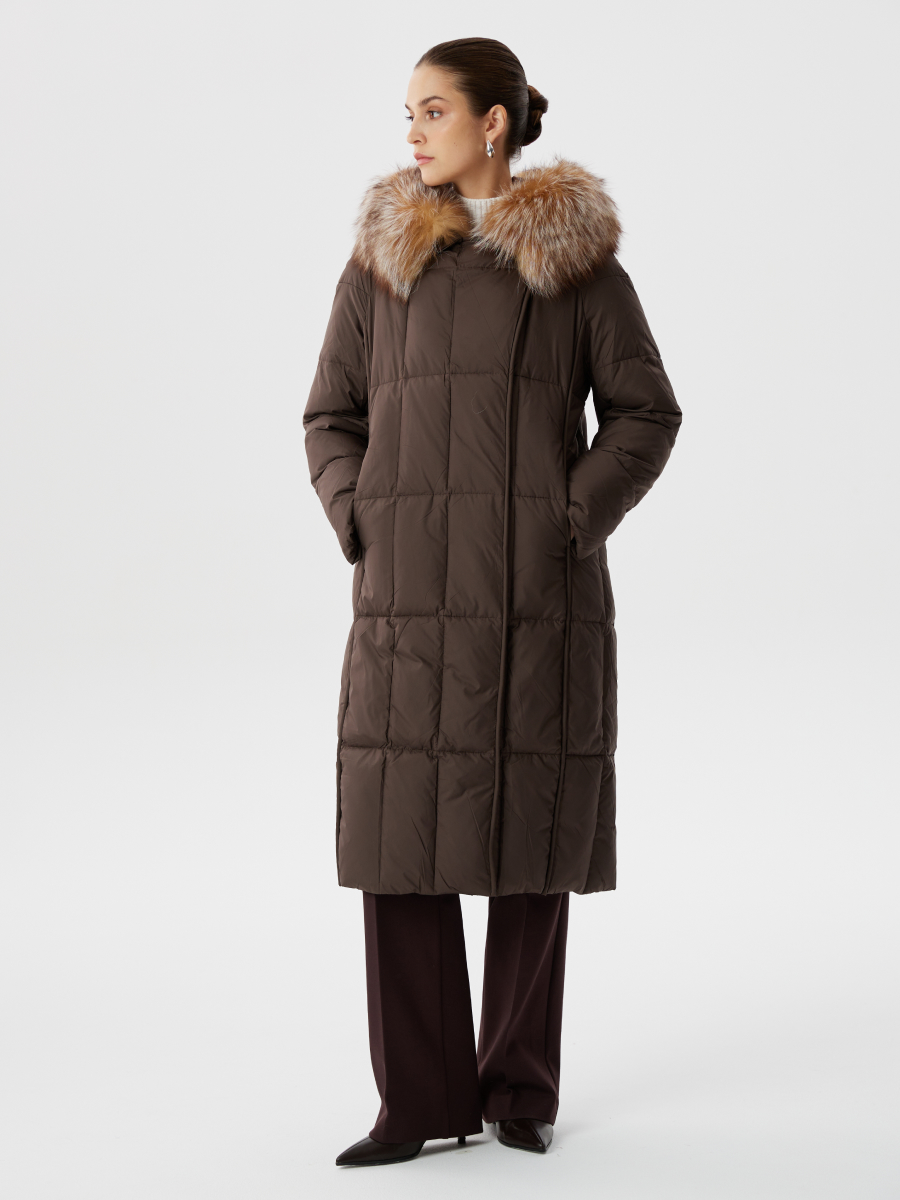 Элегантный пуховик средней длины с капюшоном и натуральным мехом в шоколадном цвете