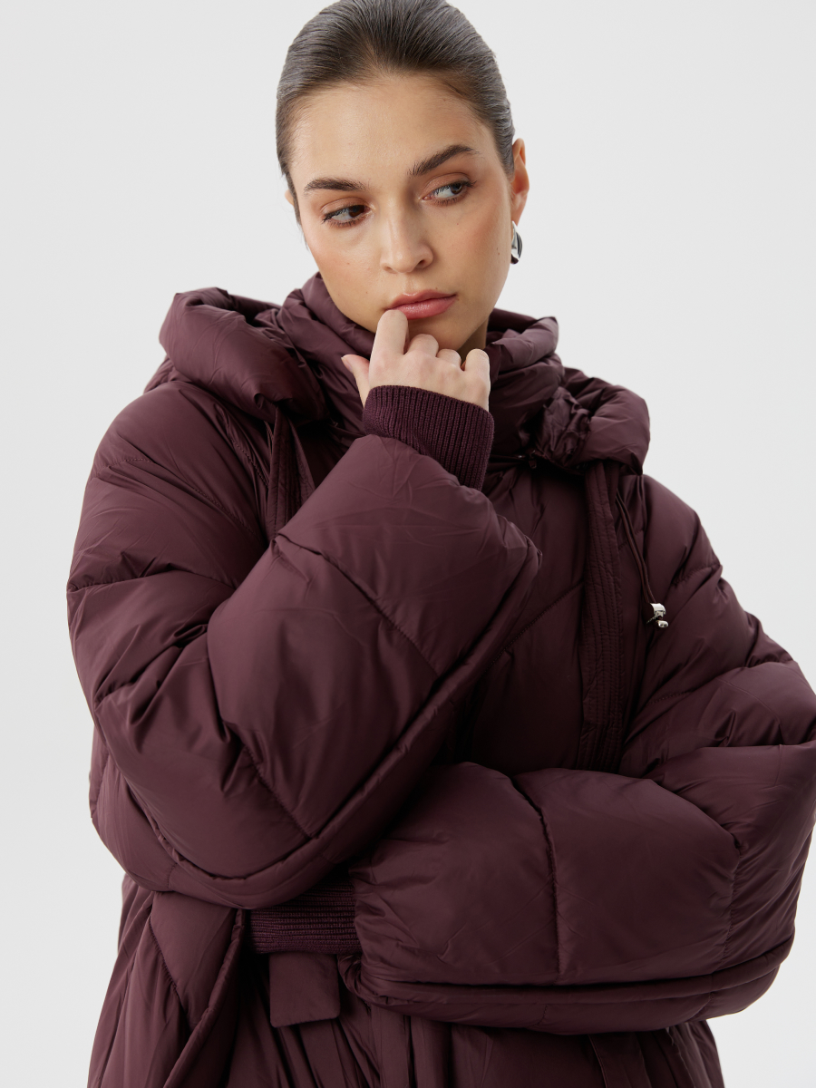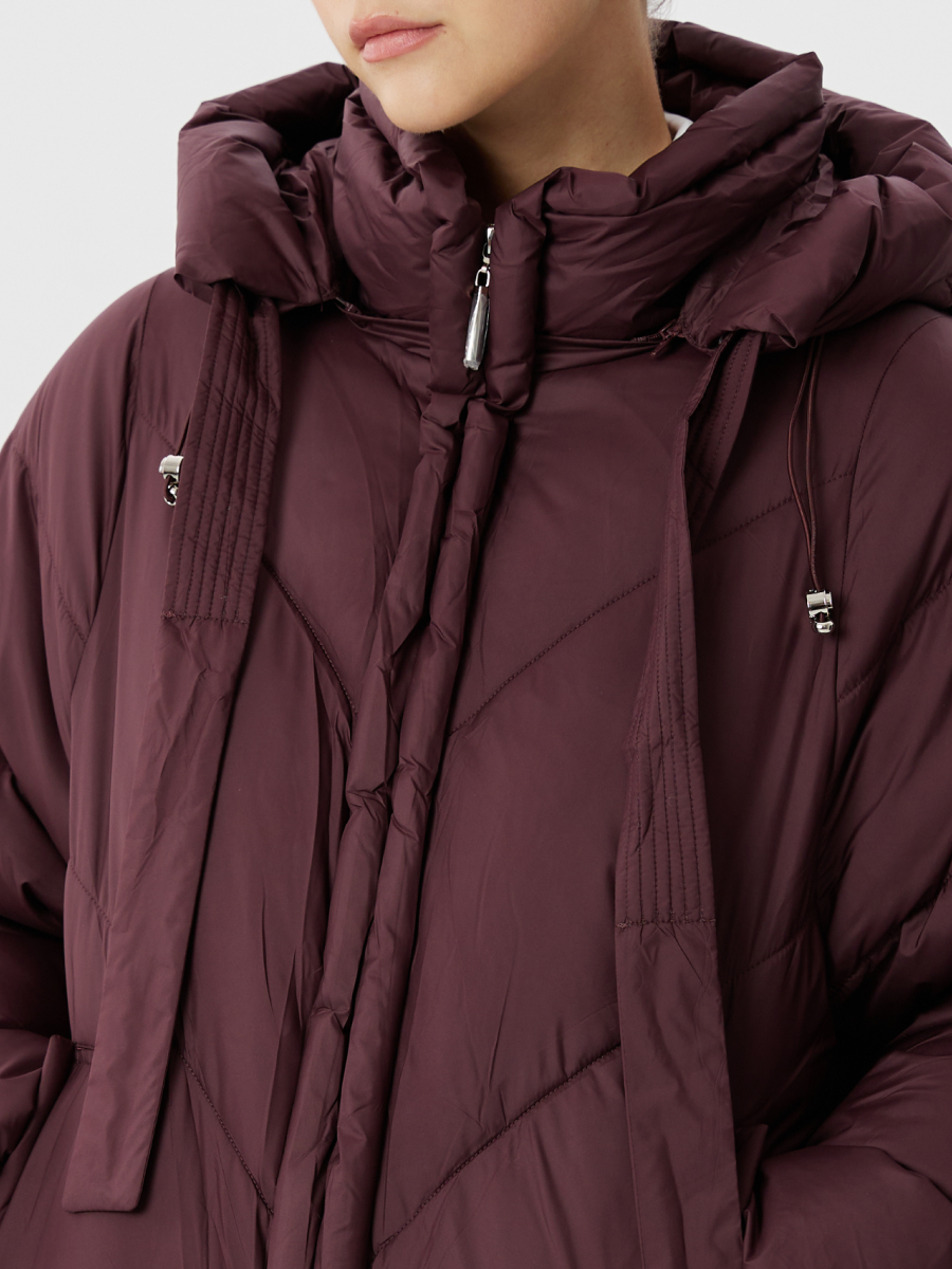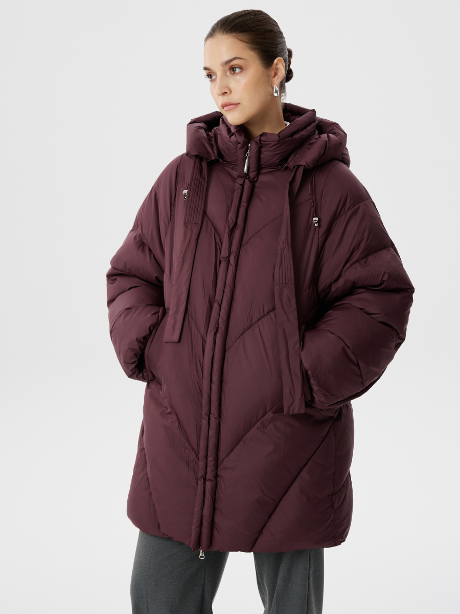 Насыщенный винный оттенок придаёт куртке благородство и глубину, подчёркивая изысканный вкус своей обладательницы. Тёплый и комфортный пуховик из био-пуха станет надёжным спутником в холодный сезон. Модель средней длины выполнена в объёмном силуэте oversize — он не сковывает движения, подходит для многослойной одежды и создаёт современный расслабленный образ. Глубокий капюшон с утяжками защищает от ветра, а диагональная стёжка придаёт визуальную динамику. Рукав реглан подчёркивает мягкую посадку по плечу и создаёт эффект уютного кокона. Пуховик застёгивается на молнию и имеет функциональные карманы. Удачный выбор для прогулок, поездок и насыщенных городских дней, когда хочется тепла, свободы и уверенности. Комфорт до -15°C