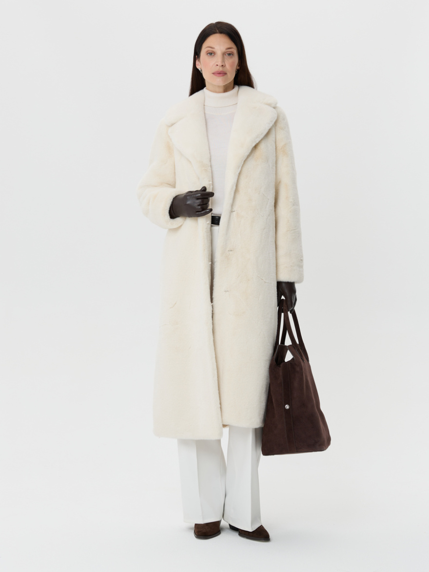 Меховое пальто из эко-меха прямого силуэта.в молочном цвете. Английский воротник, спущенный рукав с мягкой линией плеча, карманы в боковых швах, шлица в среднем шве спинки, застежка на шубные крючки, пояс из основной ткани.Элегантная, легкая и очень теплая эко-шуба смотрится безупречно. Это достигается благодаря эко-меху премиального качества и технологии пошива, полностью заимствованной у натуральных шуб. Длина 120 см