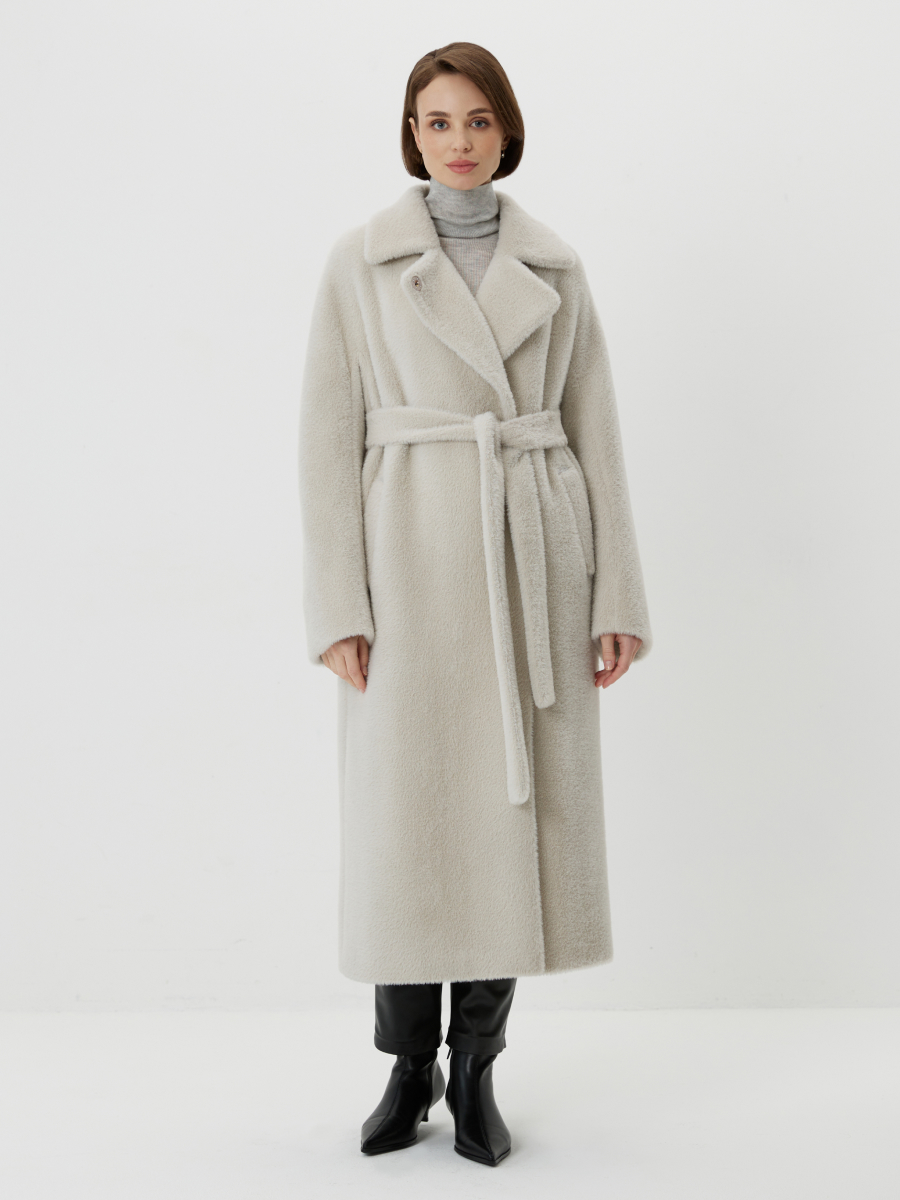 Меховое шерстяное пальто жемчужного цвета с поясом