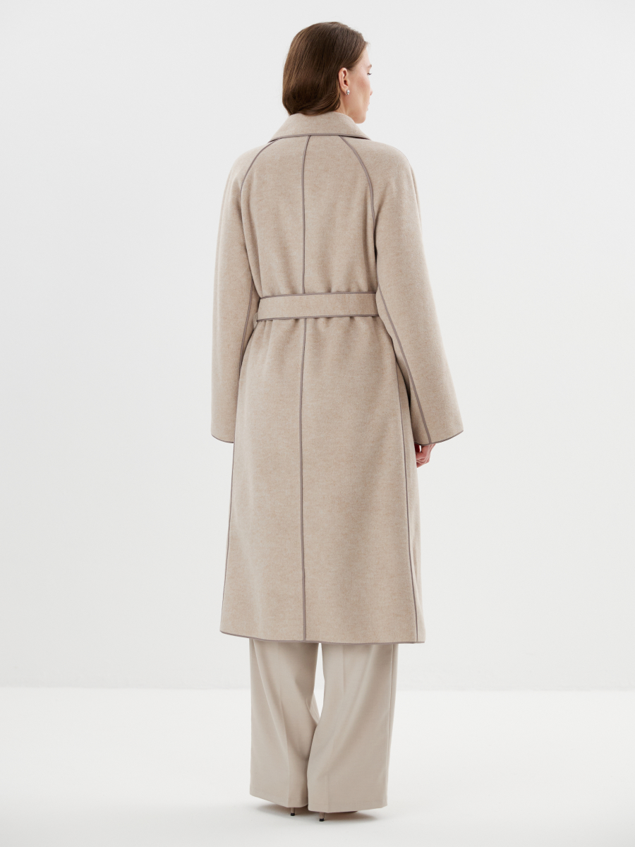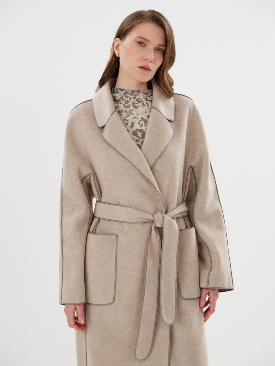 Элегантное пальто длины миди выполнено из премиальной шерстяной ткани, идеально подходящей для городского демисезонного гардероба. Мягкий цвет овёс подчеркивает утончённый вкус и универсальность модели. Классический английский воротник придаёт образу строгость и выразительность. Пальто застёгивается на потайные кнопки и дополнено поясом, который акцентирует талию и позволяет регулировать посадку. Контрастный кантик по краям подчеркивает архитектурный крой и придаёт модели динамику. Функциональные накладные карманы гармонично сочетаются с лаконичным силуэтом и делают пальто не только стильным, но и практичным. Отсутствие подкладки делает изделие лёгким и пластичным, сохраняя при этом форму и комфорт в прохладную погоду. Комфорт до +5°C. Модель станет основой для создания многослойных образов в стиле городской классики — от утреннего выхода до вечерней встречи. Подчеркните свою самодостаточность и безупречное чувство стиля с этим элегантным пальто.