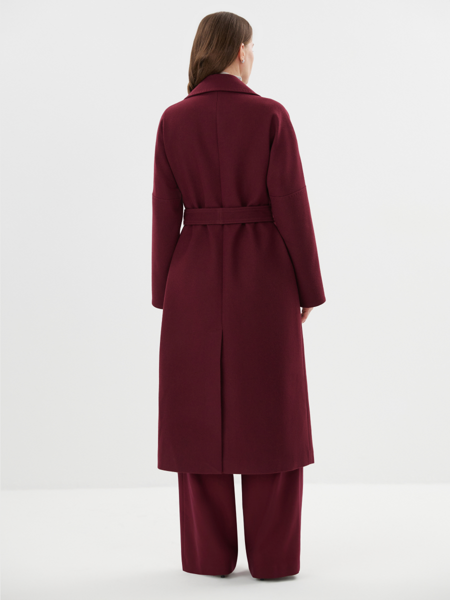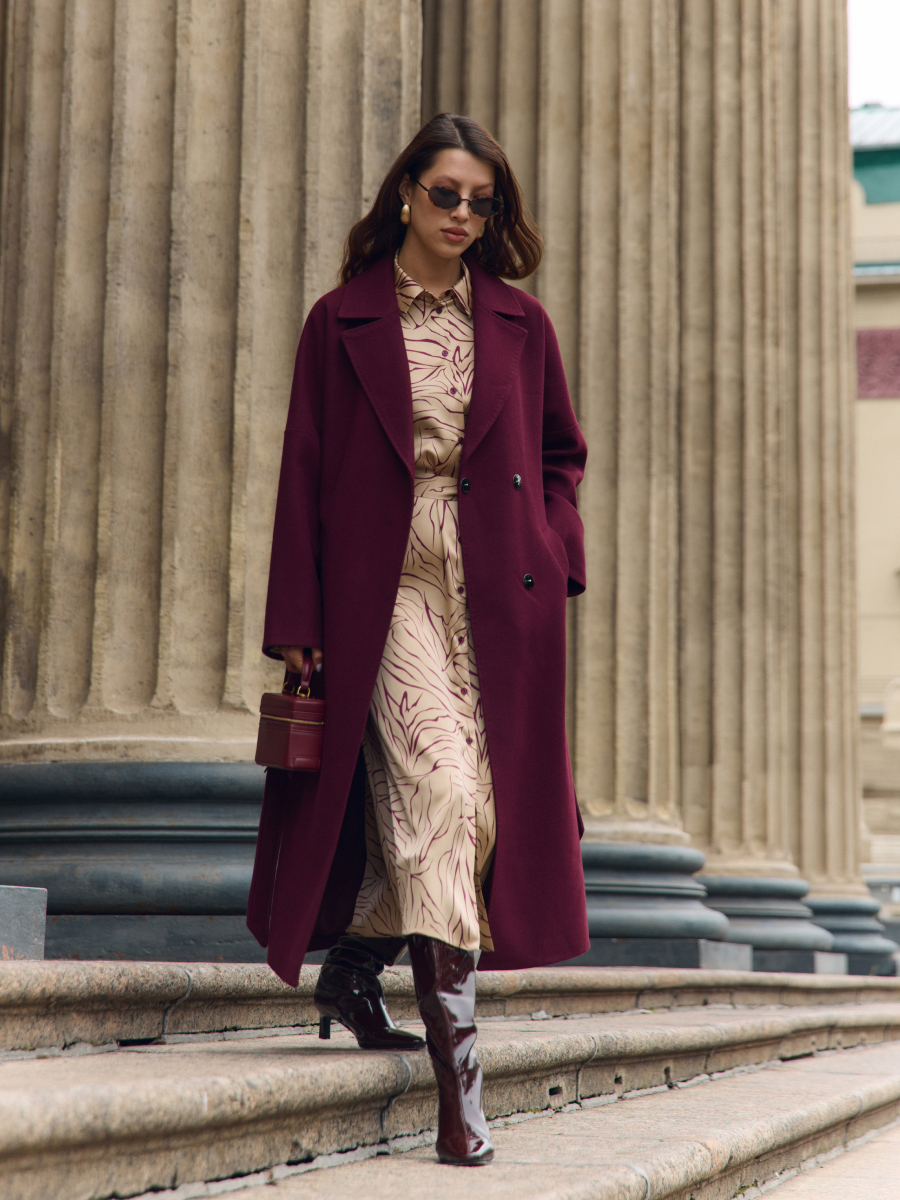 Это пальто — выразительное, как акцент в образе, и при этом сдержанное в каждой линии. Оно создано для женщины, которая любит выделяться элегантно, без лишнего шума. Глубокий ягодный оттенок добавляет образу свежести, уверенности и лёгкой дерзости, сохраняя благородство и статус. Модель выполнена из 80% шерсти с подкладкой, что делает её идеальной для демисезонного периода. Удлинённый крой визуально вытягивает фигуру, подчёркивая силуэт. Английский воротник, отрезной рукав-реглан, аккуратные боковые карманы и потайная застёжка на кнопки создают чистую, сбалансированную композицию. Пояс мягко акцентирует талию и даёт возможность варьировать посадку по настроению.