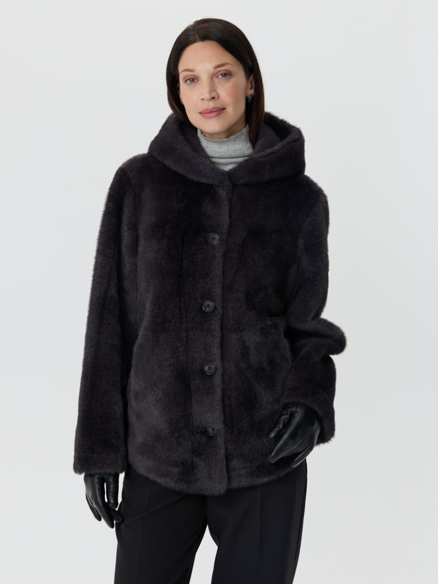 Короткая шубка из эко-меха свободног кроя с капюшоном.