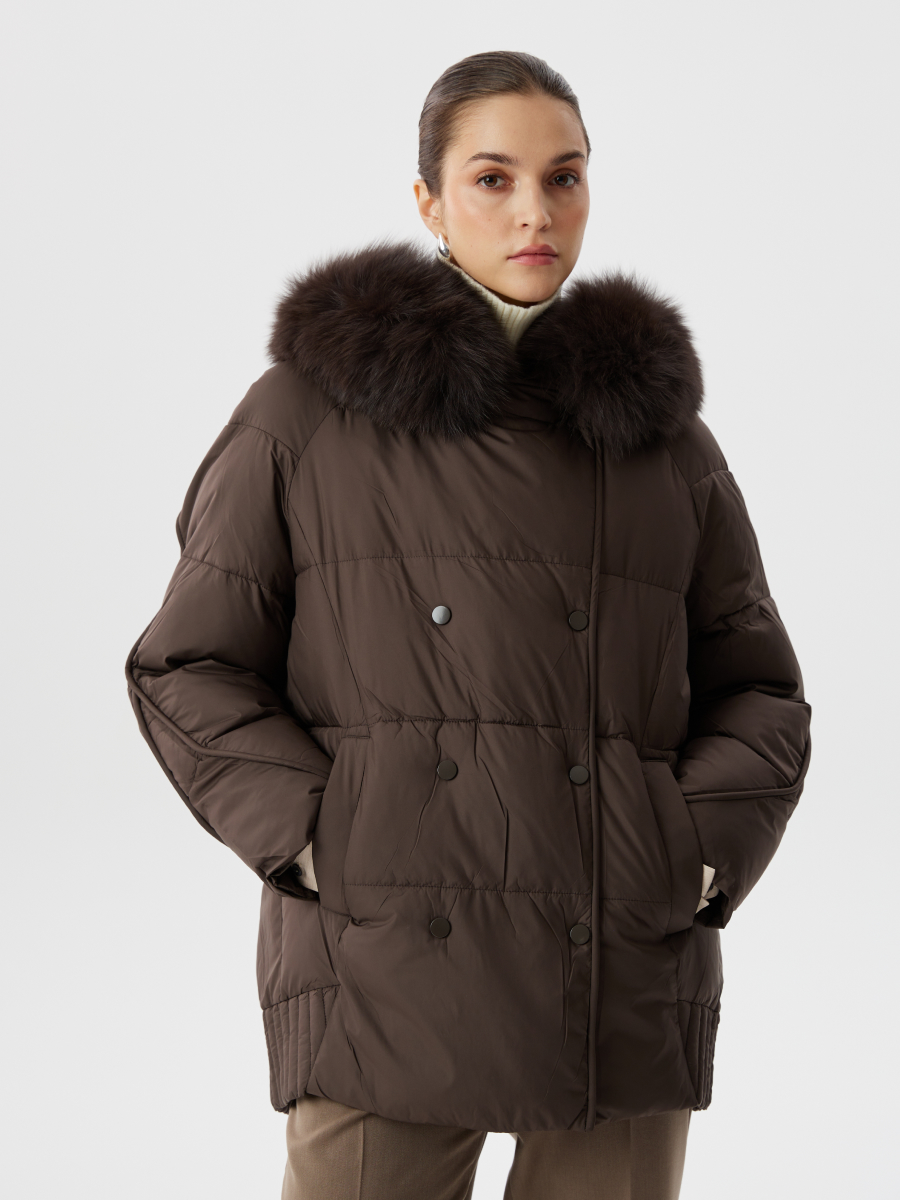 Пуховик из био-пуха с капюшоном и натуральным мехом в шоколадном цвете