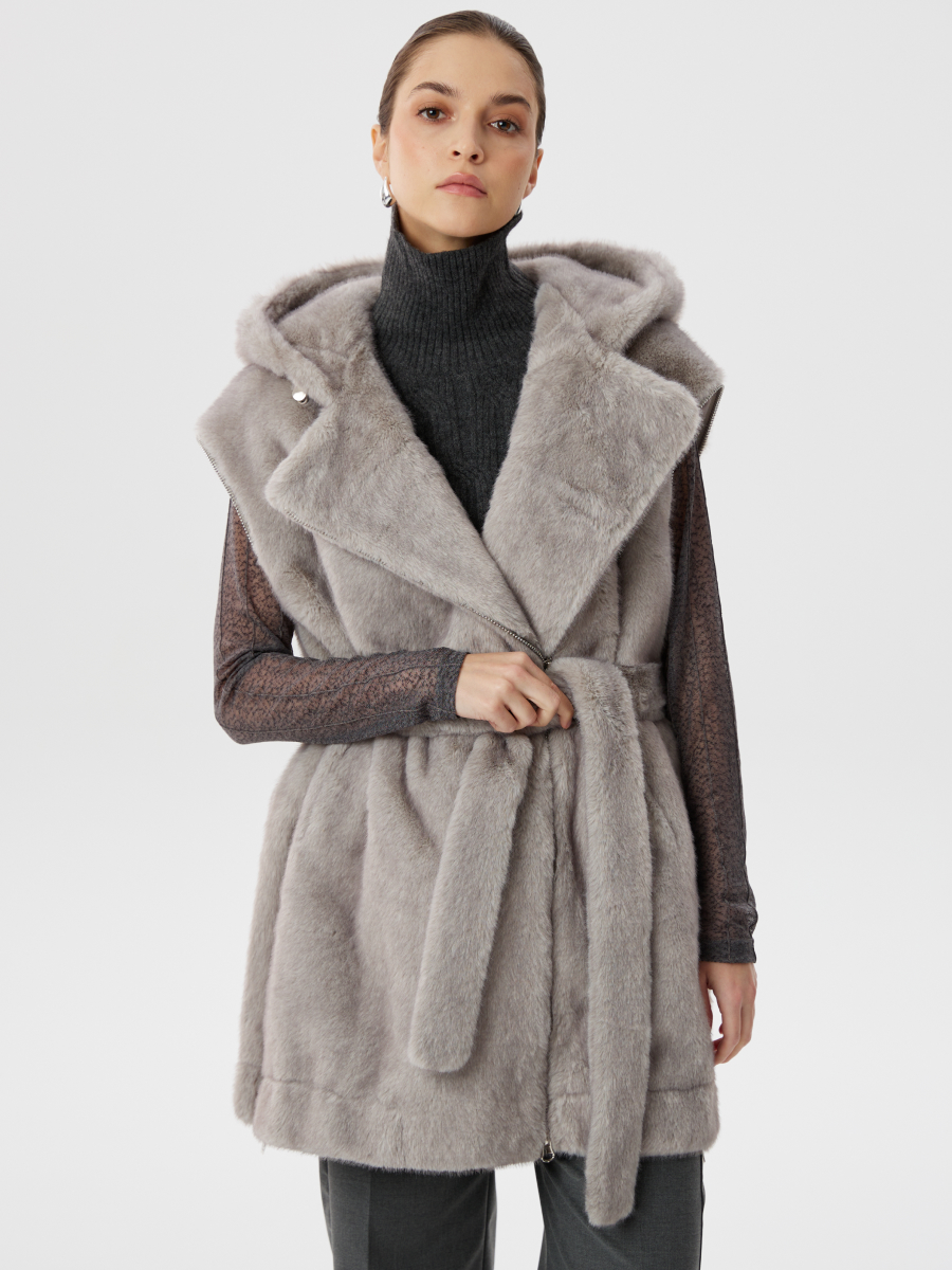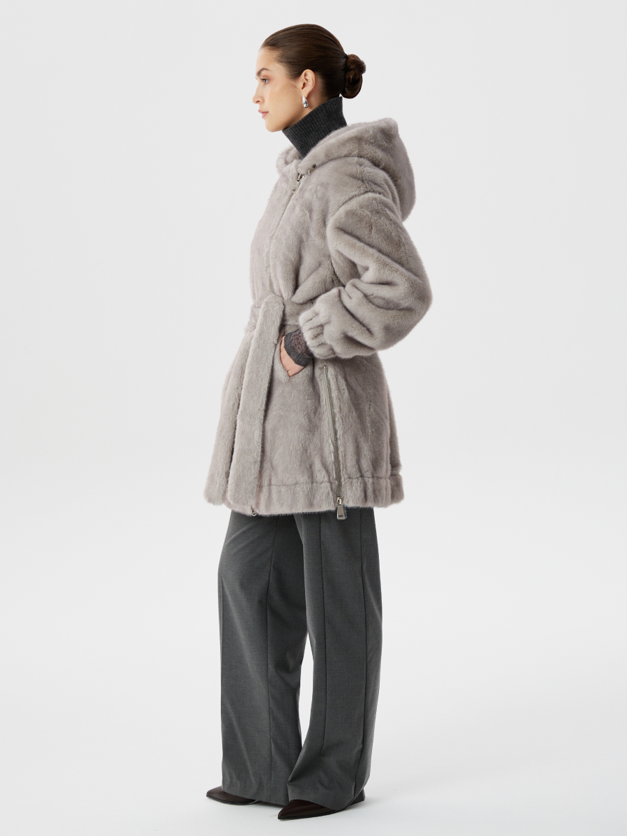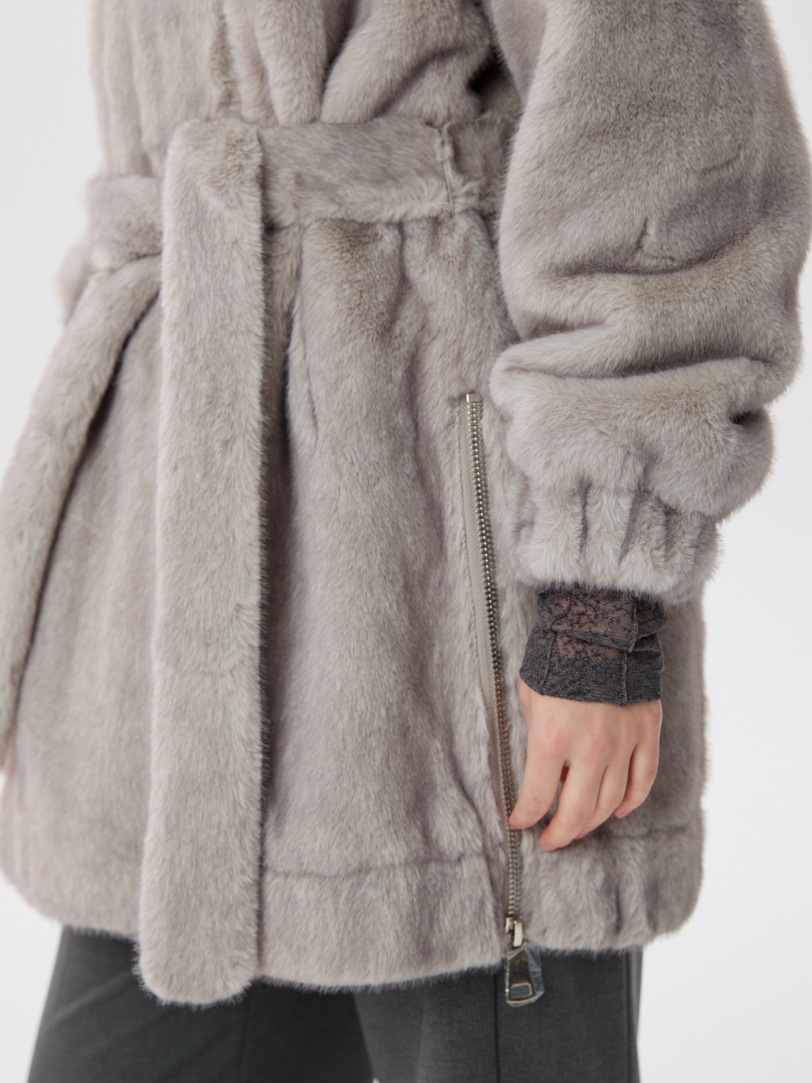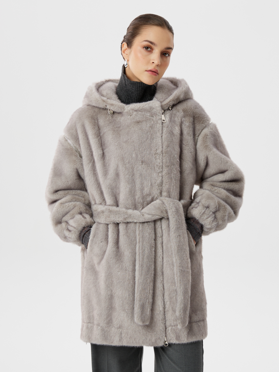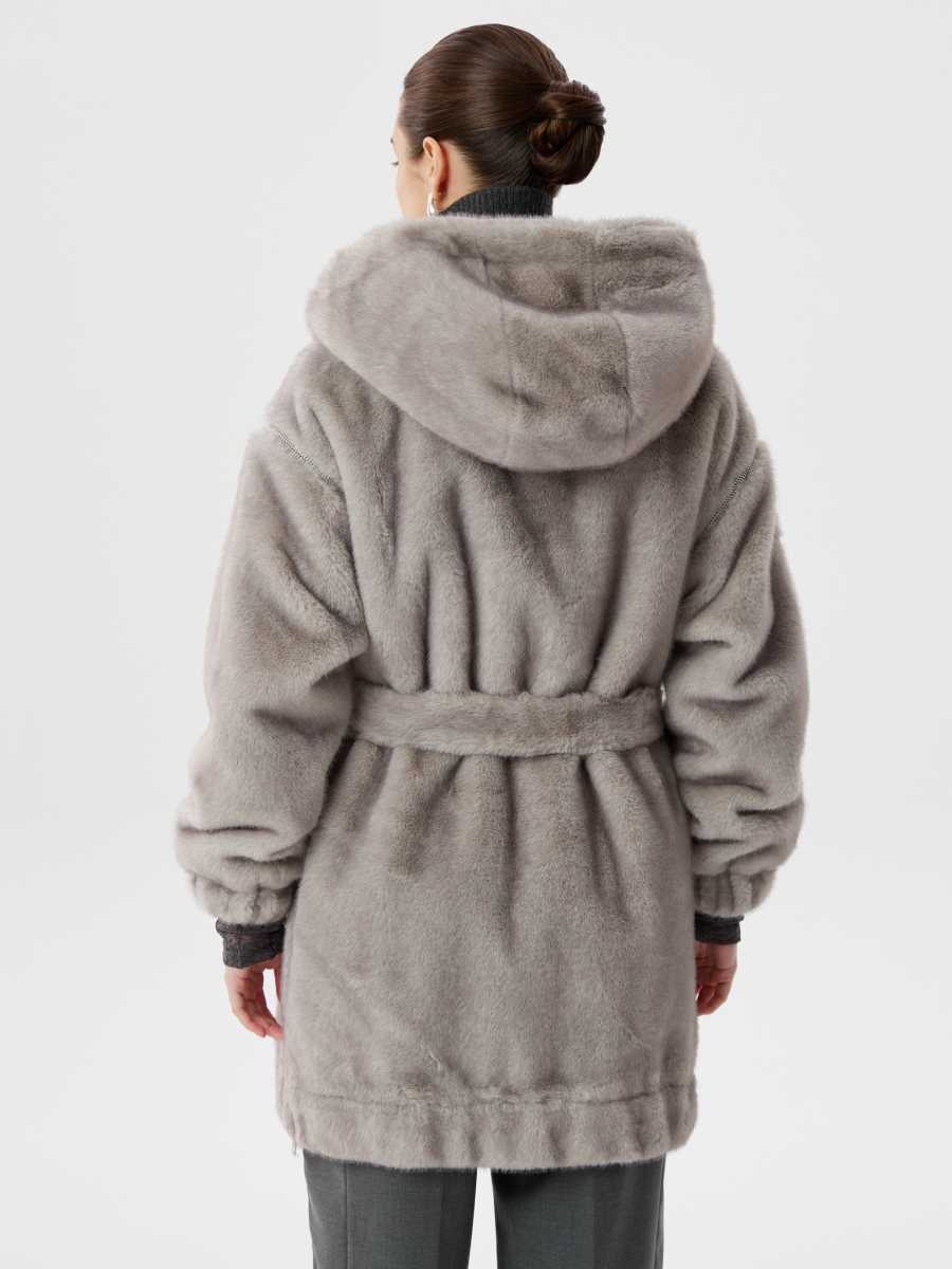 Серая шуба из эко-меха с капюшоном и отстегивающимися рукавами