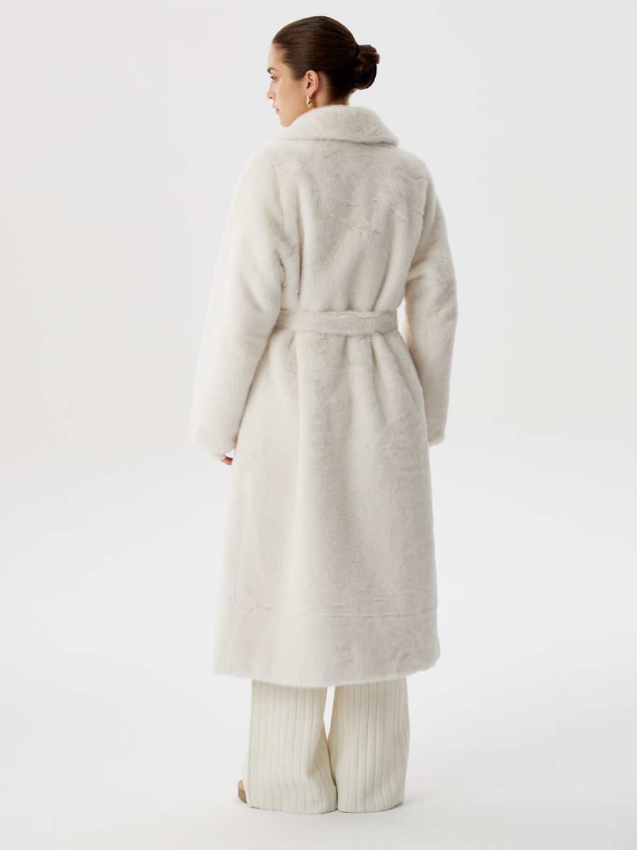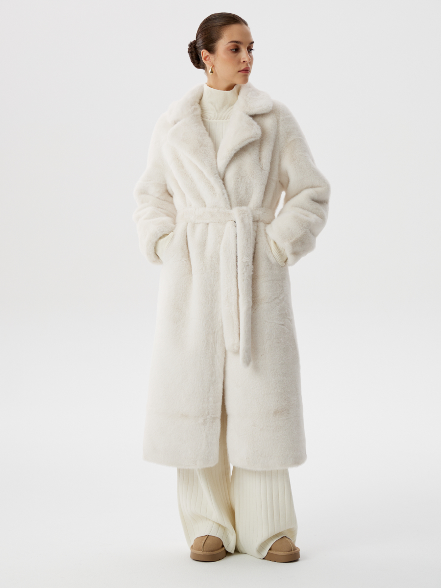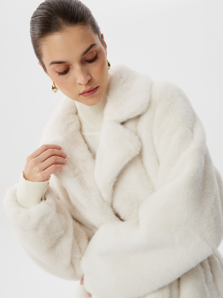 Шуба из эко-меха с поясом и английским воротником в молочном цвете